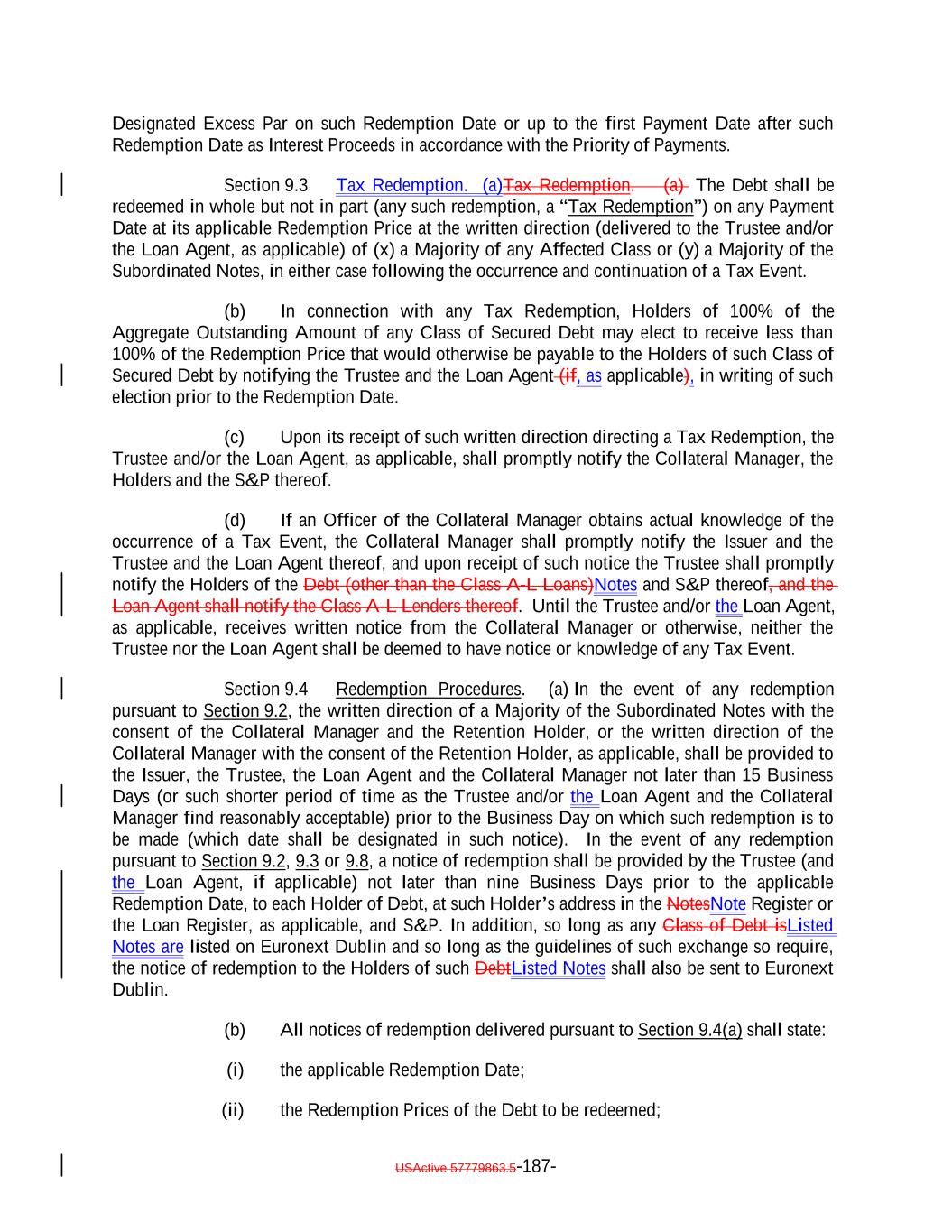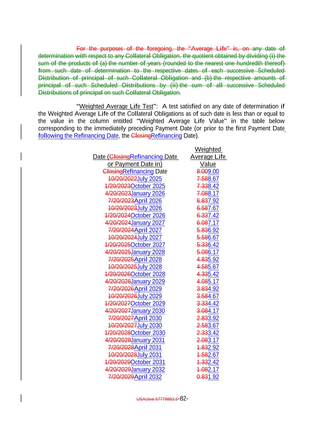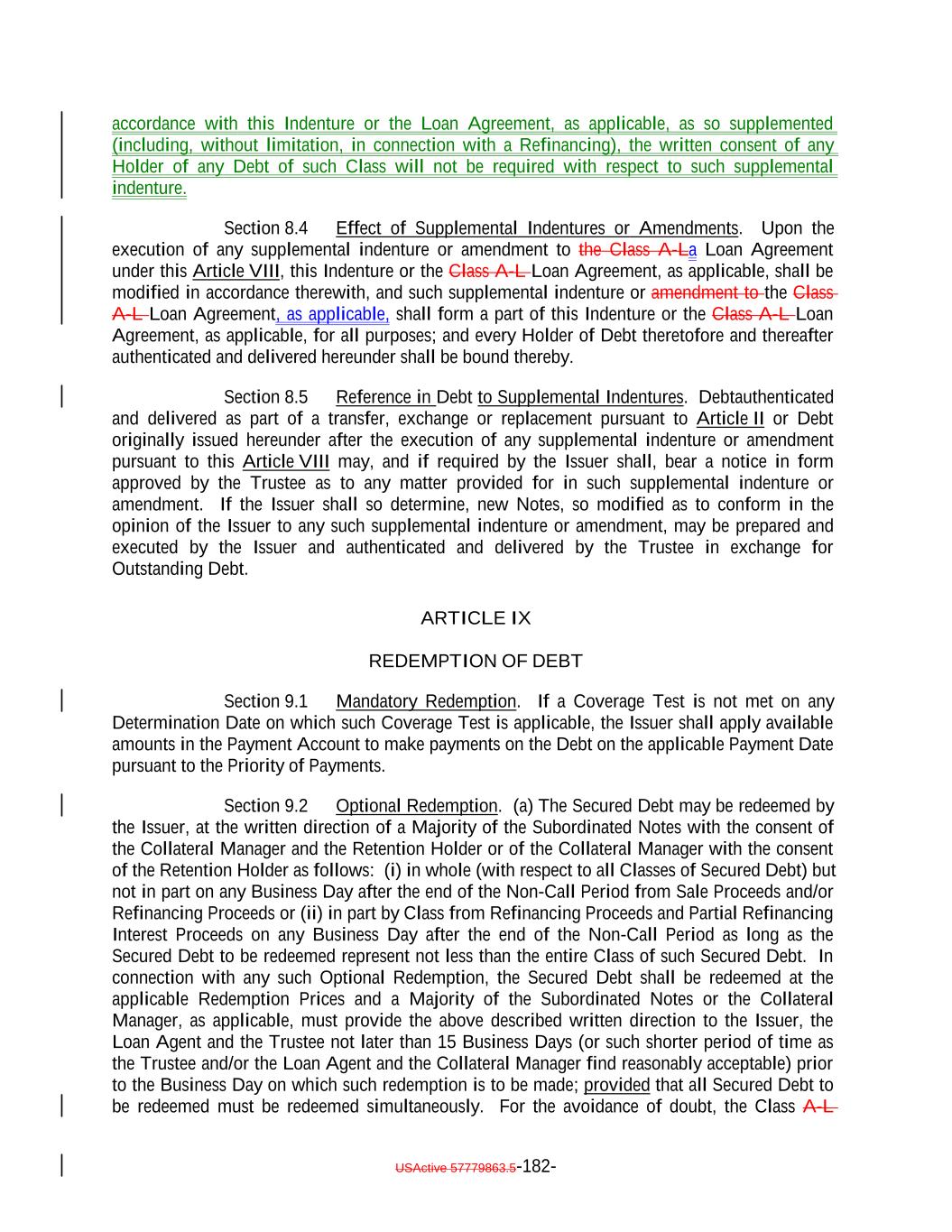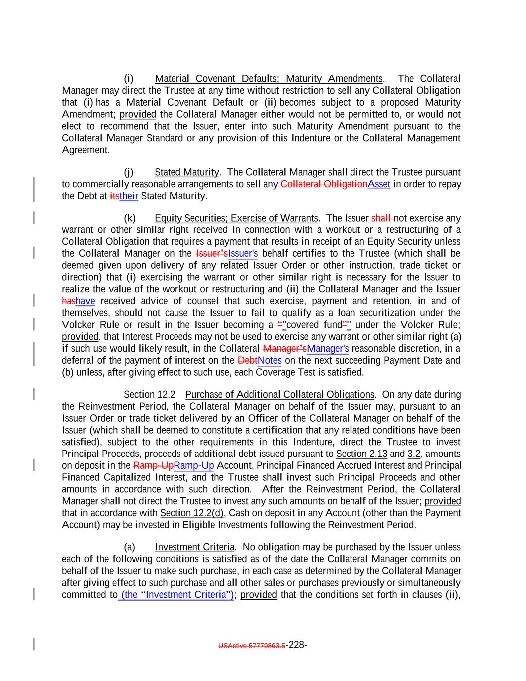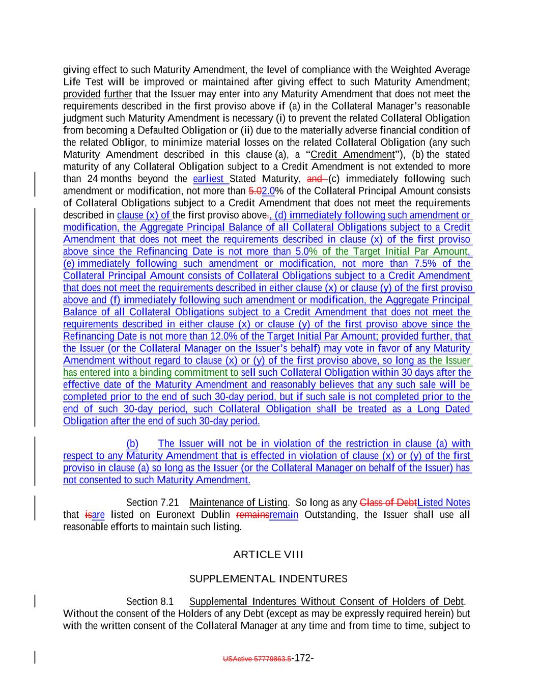 “Long Dated Obligation”: A Collateral Obligation, the stated maturity date of which is extended to occur after the earliest Stated Maturity pursuant to an amendment or modification of its terms following its acquisition by the Issuer; provided that, if any Collateral Obligation has scheduled distributions that occur both before and after the earliest Stated Maturity, only the scheduled distributions on such Collateral Obligation occurring after the earliest Stated Maturity of the Debt will constitute a Long Dated Obligation; provided, further, that in determining the scheduled distributions on any Collateral Obligation occurring after the earliest Stated Maturity of the Secured Debt, such Collateral Obligation will be deemed to have a maturity and amortization schedule based on zero unscheduled prepayments. “LSTA”: The Loan Syndications and Trading Association®. “Maintenance Covenant”: A covenant by any borrower to comply with one or more financial covenants (including without limitation any covenant relating to a borrowing base, asset valuation or similar asset-based requirement) during each reporting period, whether or not such borrower has taken any specified action; provided that a covenant which otherwise satisfies the definition hereof but only applies when amounts are outstanding under the related loanUnderlying Documents shall constitute a Maintenance Covenant. “Mandatory Redemption”: A redemption of the Debt in accordance with Section 9.1. “Majority”: With respect to any Class or Classes of Debt, the HoldersDebtholders of more than 50% of the Aggregate Outstanding Amount of the Debt of such Class or Classes, as applicable. “Mandatory Redemption”: A redemption of the Debt in accordance with Section 9.1. “Margin Stock”: “Margin Stock” as defined under Regulation U issued by the Federal Reserve Board, including any debt security which is by its terms convertible into “Margin Stock”. “Market Value”: With respect to any loans or other assets, the amount (determined by the Collateral Manager) equal to the product of the outstanding principal balance thereof and the price (expressed as a percentage of par) determined in the following manner: (i) the bid price determined by the Loan Pricing Corporation, LoanX Inc. or Markit Group Limited; or (ii) if a price described in clause (i) is not available, (a) the average of the bid prices determined by three broker-dealers active in the trading of such asset that are Independent (without giving effect to the last sentence in the definition thereof) from each other and the Issuer and the Collateral Manager; USActive 57779863.5-50-