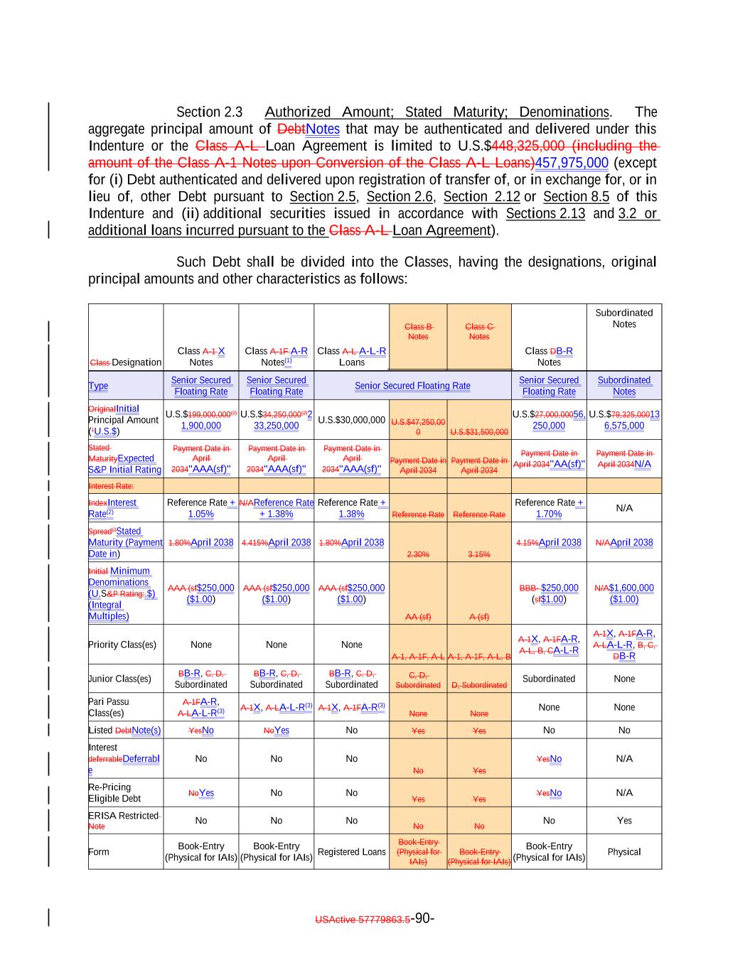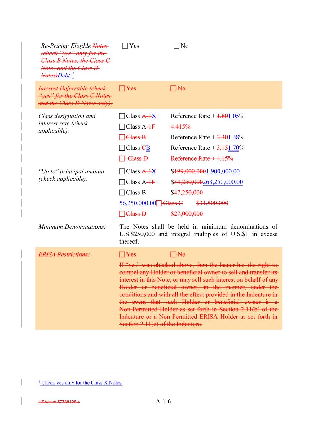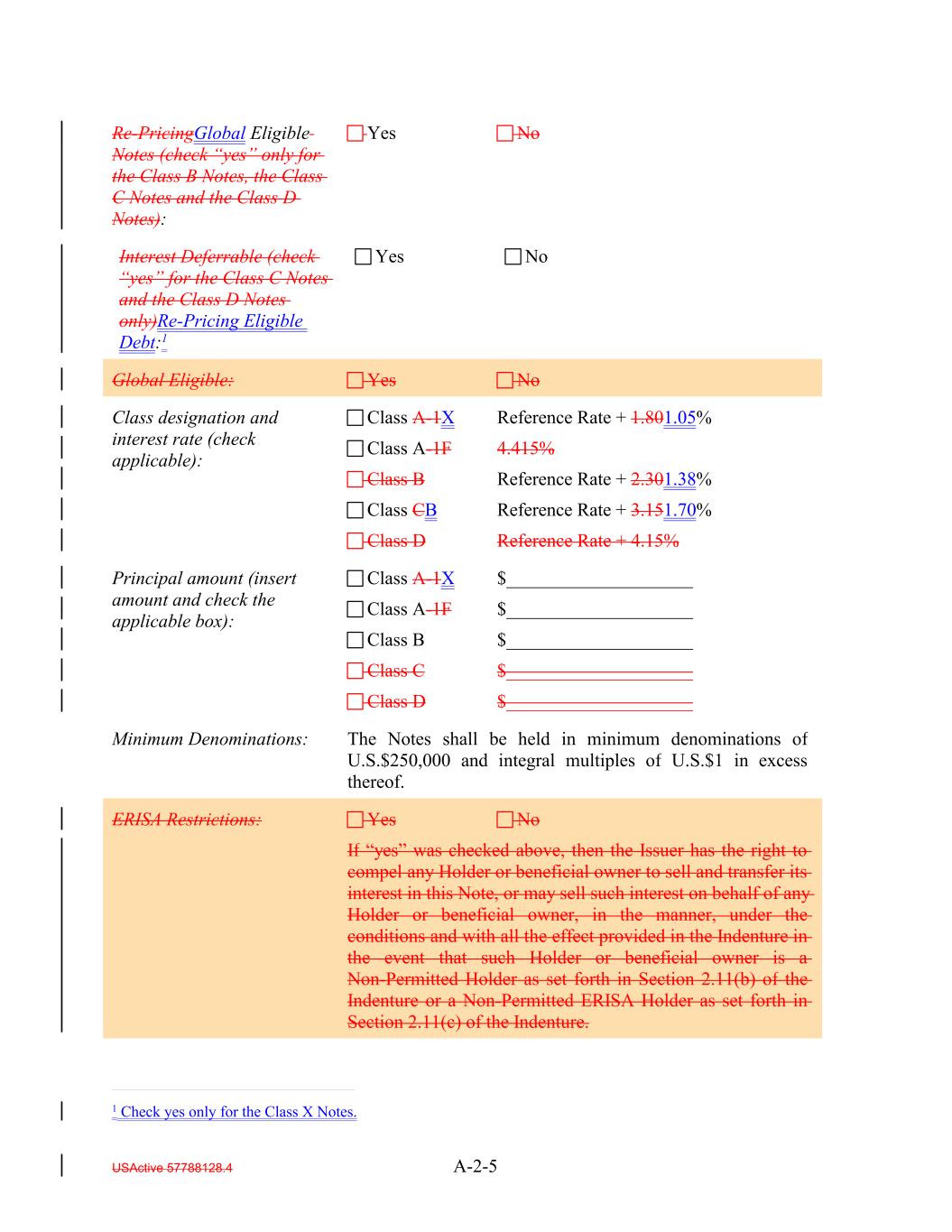 USActive 57788128.4 A-2-5 Interest Deferrable (check “yes” for the Class C Notes and the Class D Notes only)Re-Pricing Eligible Debt:1 Class A-1X Reference Rate + 1.801.05% Class A-1F 4.415% Class B Reference Rate + 2.301.38% Class CB Reference Rate + 3.151.70% Class D Reference Rate + 4.15% Re-PricingGlobal Eligible Notes (check “yes” only for the Class B Notes, the Class C Notes and the Class D Notes): Yes No Principal amount (insert amount and check the applicable box): Class A-1X $____________________ Class A-1F $____________________ Class B $____________________ Class C $____________________ Class D $____________________ Yes No Minimum Denominations: Global Eligible: The Notes shall be held in minimum denominations of U.S.$250,000 and integral multiples of U.S.$1 in excess thereof. Yes No ERISA Restrictions: Yes No If “yes” was checked above, then the Issuer has the right to compel any Holder or beneficial owner to sell and transfer its interest in this Note, or may sell such interest on behalf of any Holder or beneficial owner, in the manner, under the conditions and with all the effect provided in the Indenture in the event that such Holder or beneficial owner is a Non-Permitted Holder as set forth in Section 2.11(b) of the Indenture or a Non-Permitted ERISA Holder as set forth in Section 2.11(c) of the Indenture. Class designation and interest rate (check applicable): 1 Check yes only for the Class X Notes.