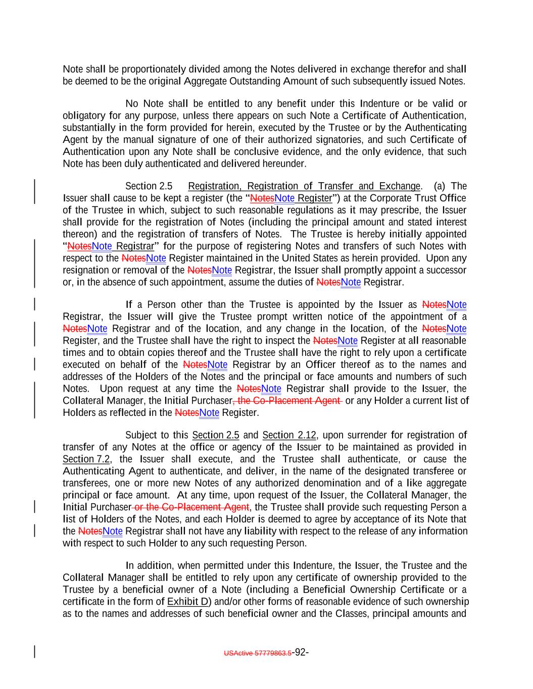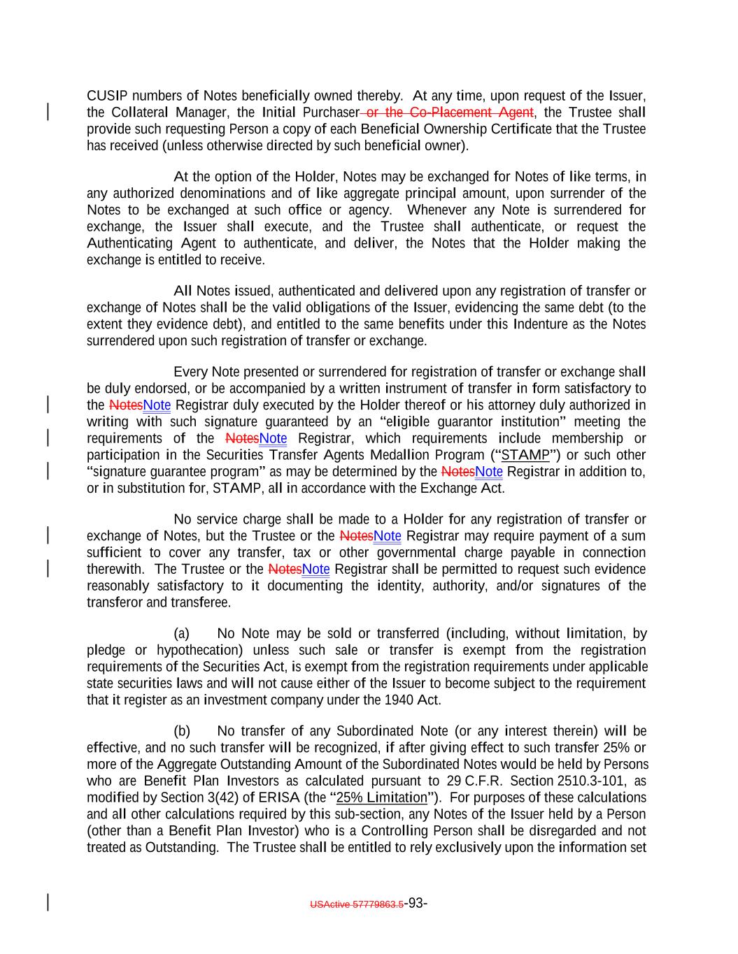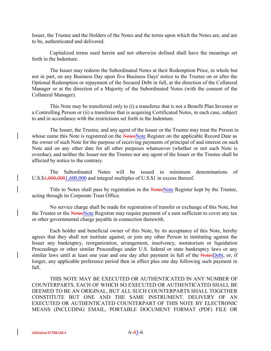 Issuer, the Trustee and the Holders of the Notes and the terms upon which the Notes are, and are to be, authenticated and delivered. Capitalized terms used herein and not otherwise defined shall have the meanings set forth in the Indenture. The Issuer may redeem the Subordinated Notes at their Redemption Price, in whole but not in part, on any Business Day upon five Business Days' notice to the Trustee on or after the Optional Redemption or repayment of the Secured Debt in full, at the direction of the Collateral Manager or at the direction of a Majority of the Subordinated Notes (with the consent of the Collateral Manager). This Note may be transferred only to (i) a transferee that is not a Benefit Plan Investor or a Controlling Person or (ii) a transferee that is acquiring Certificated Notes, in each case, subject to and in accordance with the restrictions set forth in the Indenture. The Issuer, the Trustee, and any agent of the Issuer or the Trustee may treat the Person in whose name this Note is registered on the NotesNote Register on the applicable Record Date as the owner of such Note for the purpose of receiving payments of principal of and interest on such Note and on any other date for all other purposes whatsoever (whether or not such Note is overdue), and neither the Issuer nor the Trustee nor any agent of the Issuer or the Trustee shall be affected by notice to the contrary. The Subordinated Notes will be issued in minimum denominations of U.S.$1,000,0001,600,000 and integral multiples of U.S.$1 in excess thereof. Title to Notes shall pass by registration in the NotesNote Register kept by the Trustee, acting through its Corporate Trust Office. No service charge shall be made for registration of transfer or exchange of this Note, but the Trustee or the NotesNote Registrar may require payment of a sum sufficient to cover any tax or other governmental charge payable in connection therewith. Each holder and beneficial owner of this Note, by its acceptance of this Note, hereby agrees that they shall not institute against, or join any other Person in instituting against the Issuer any bankruptcy, reorganization, arrangement, insolvency, moratorium or liquidation Proceedings or other similar Proceedings under U.S. federal or state bankruptcy laws or any similar laws until at least one year and one day after payment in full of the NotesDebt, or, if longer, any applicable preference period then in effect plus one day following such payment in full. THIS NOTE MAY BE EXECUTED OR AUTHENTICATED IN ANY NUMBER OF COUNTERPARTS, EACH OF WHICH SO EXECUTED OR AUTHENTICATED SHALL BE DEEMED TO BE AN ORIGINAL, BUT ALL SUCH COUNTERPARTS SHALL TOGETHER CONSTITUTE BUT ONE AND THE SAME INSTRUMENT. DELIVERY OF AN EXECUTED OR AUTHENTICATED COUNTERPART OF THIS NOTE BY ELECTRONIC MEANS (INCLUDING EMAIL, PORTABLE DOCUMENT FORMAT (PDF) FILE OR USActive 57788128.4 A-43-6