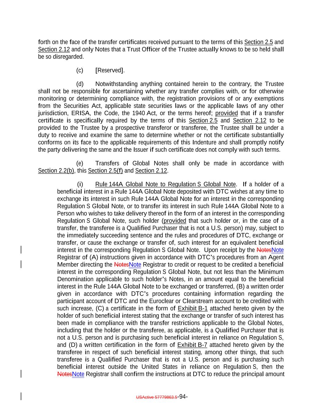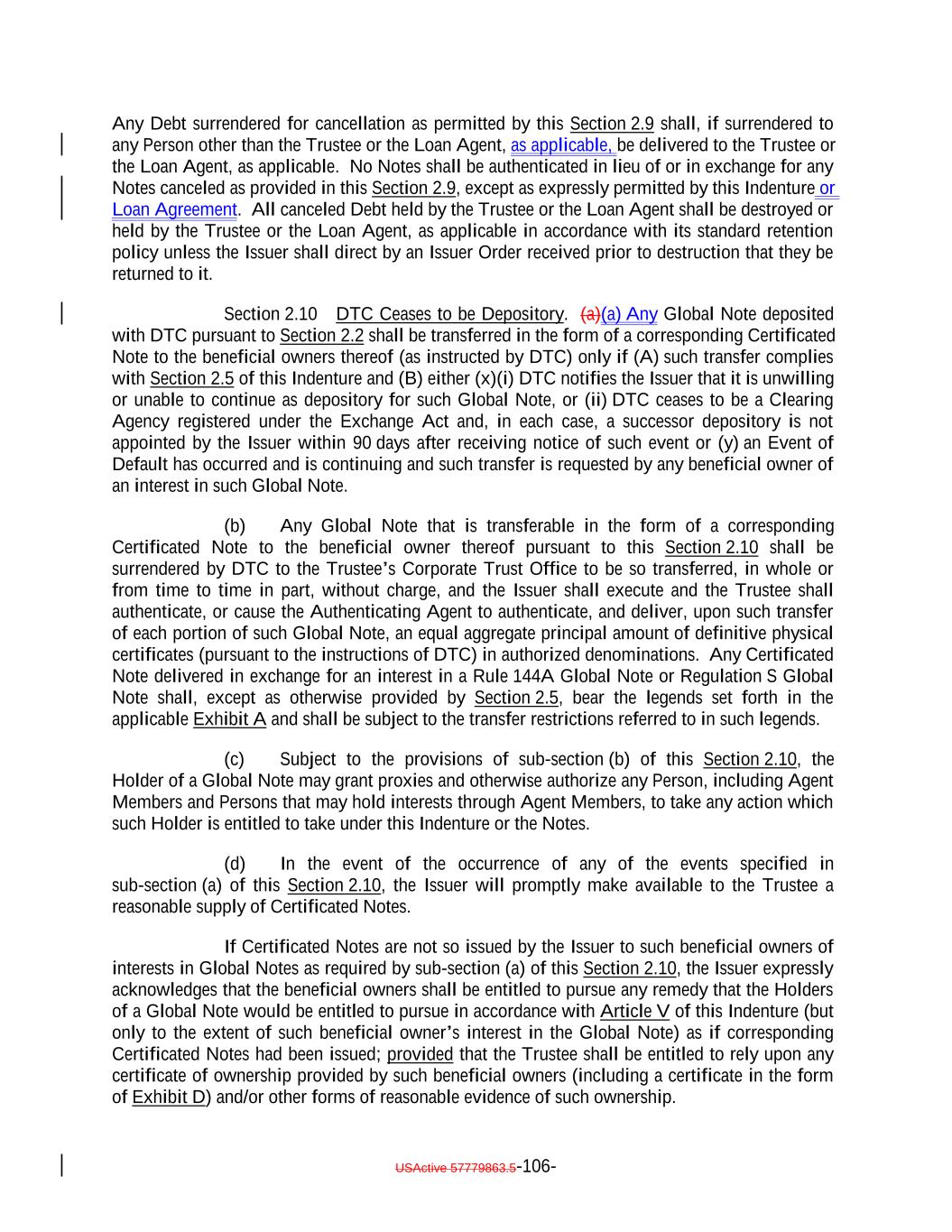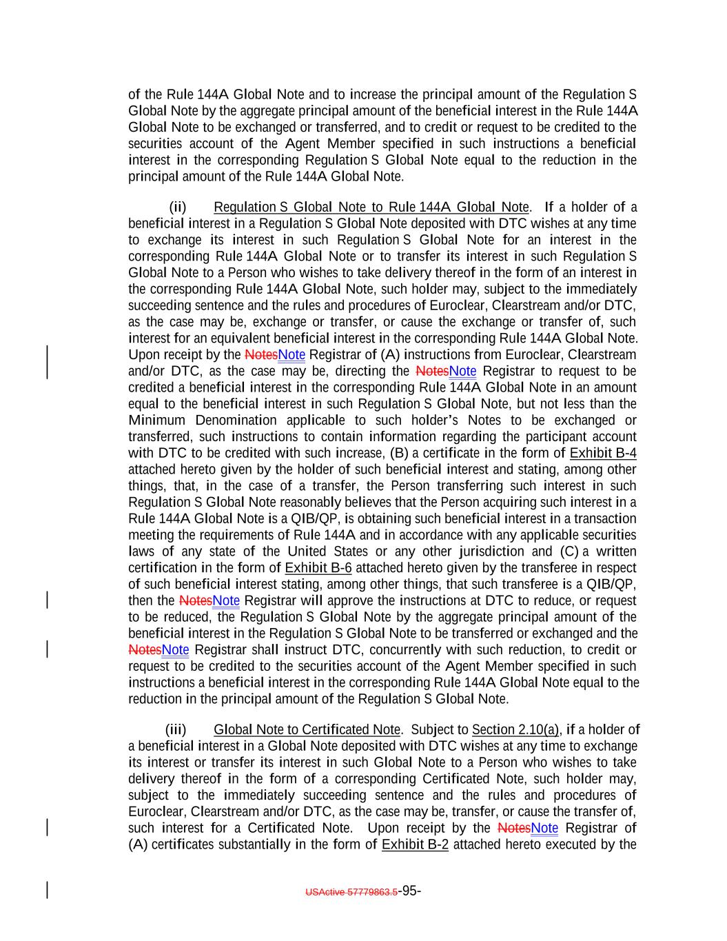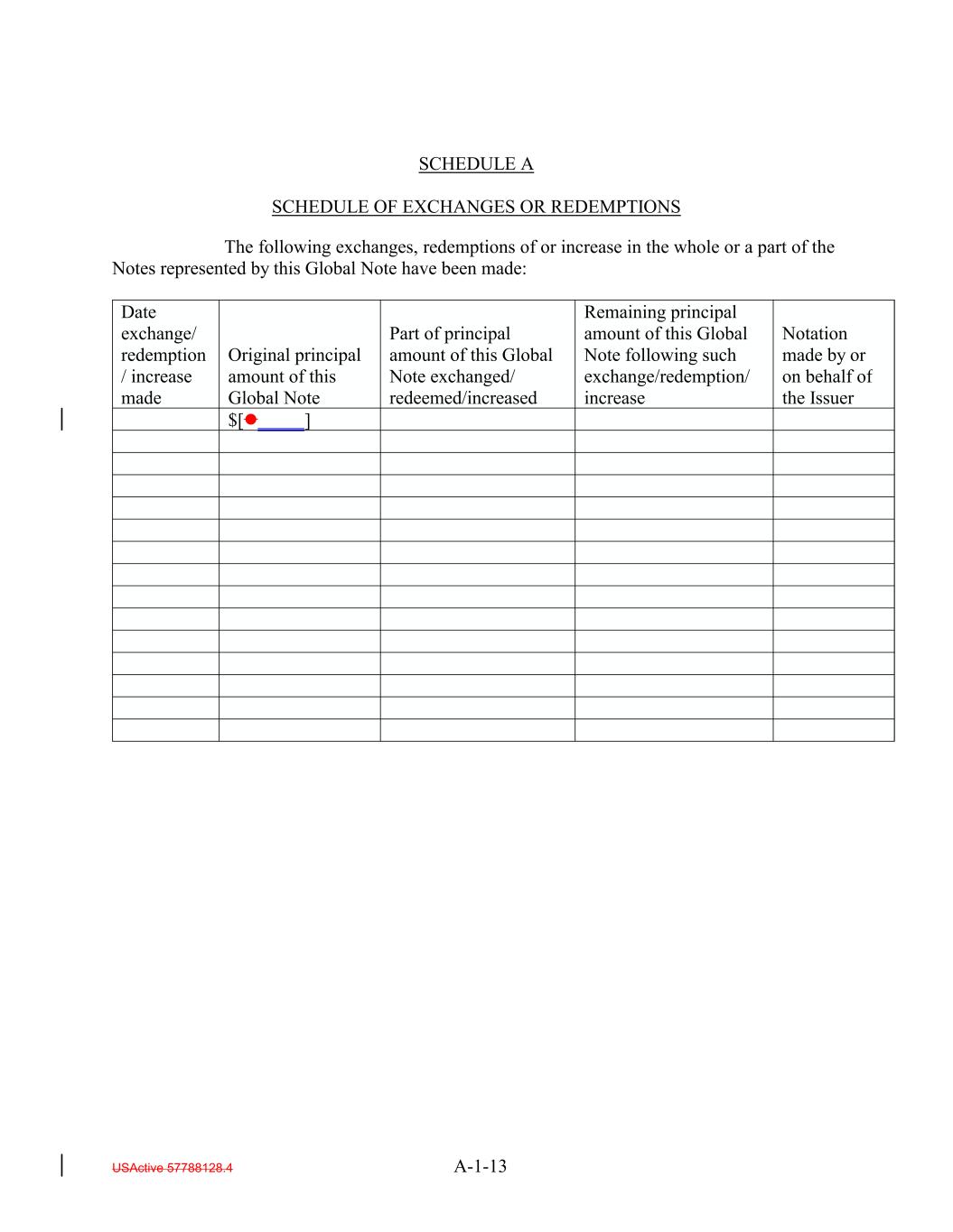 USActive 57788128.4 A-3-10 Part of principal amount of this Global Note exchanged/ redeemed/increased Remaining principal amount of this Global Note following such exchange/redemption/ increase Notation made by or on behalf of the Issuer Date exchange/ redemption / increase made Original principal amount of this Global Note $[] SCHEDULE A SCHEDULE OF EXCHANGES OR REDEMPTIONS The following exchanges, redemptions of or increase in the whole or a part of the Notes represented by this Global Note have been made: