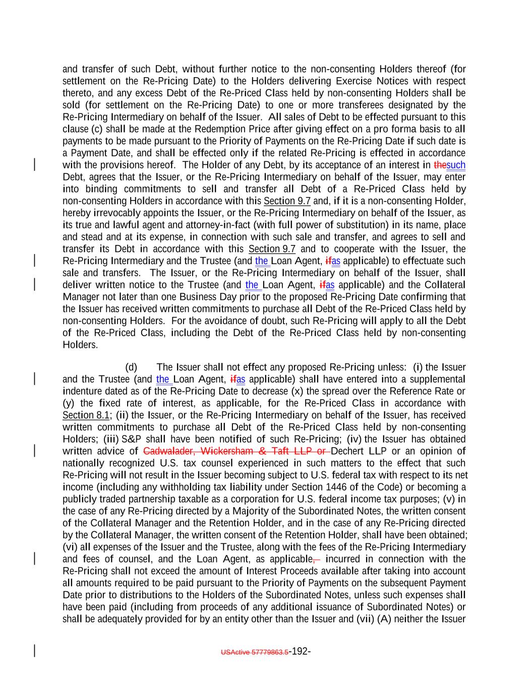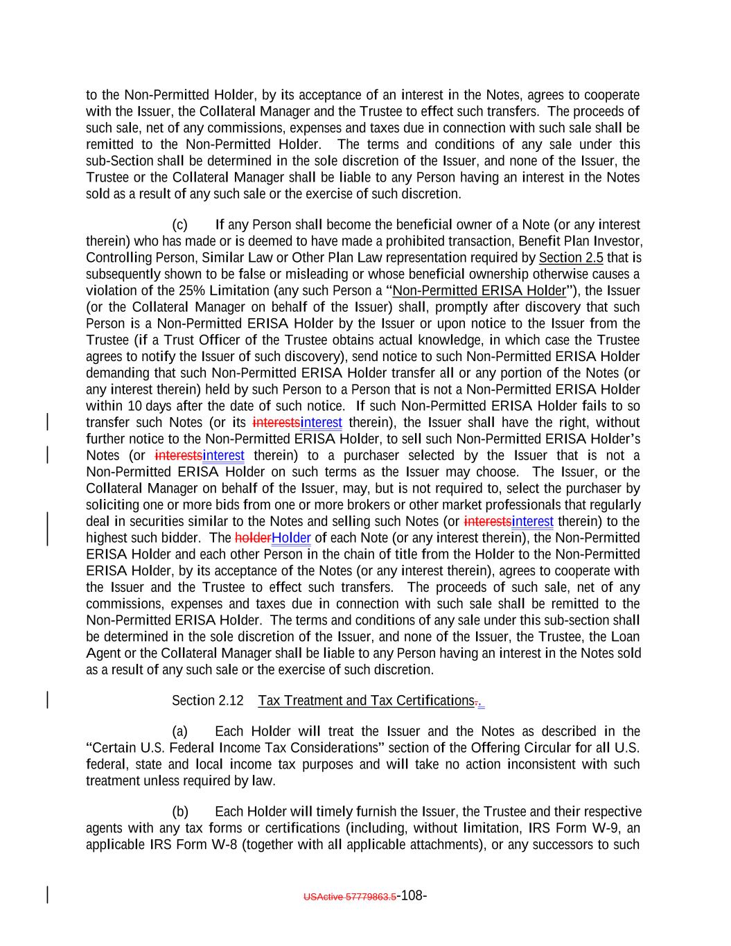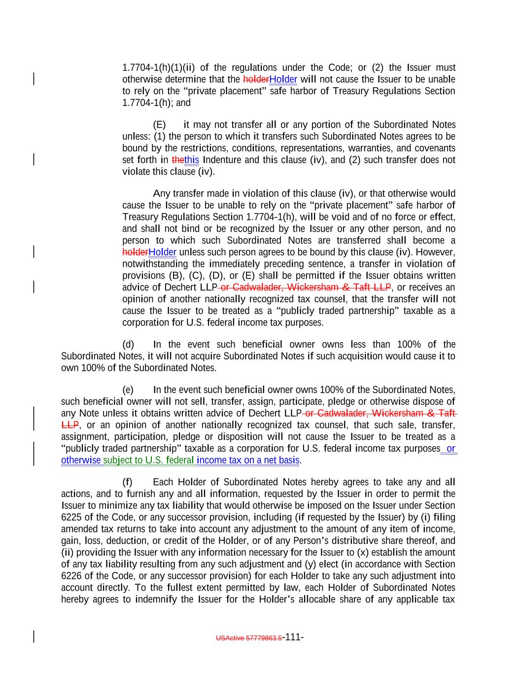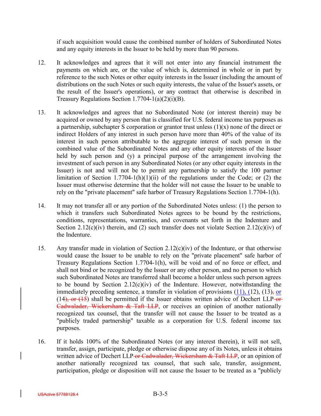 if such acquisition would cause the combined number of holders of Subordinated Notes and any equity interests in the Issuer to be held by more than 90 persons. 12. It acknowledges and agrees that it will not enter into any financial instrument the payments on which are, or the value of which is, determined in whole or in part by reference to the such Notes or other equity interests in the Issuer (including the amount of distributions on the such Notes or such equity interests, the value of the Issuer's assets, or the result of the Issuer's operations), or any contract that otherwise is described in Treasury Regulations Section 1.7704-1(a)(2)(i)(B). 13. It acknowledges and agrees that no Subordinated Note (or interest therein) may be acquired or owned by any person that is classified for U.S. federal income tax purposes as a partnership, subchapter S corporation or grantor trust unless (1)(x) none of the direct or indirect Holders of any interest in such person have more than 40% of the value of its interest in such person attributable to the aggregate interest of such person in the combined value of the Subordinated Notes and any other equity interests of the Issuer held by such person and (y) a principal purpose of the arrangement involving the investment of such person in any Subordinated Notes (or any other equity interests in the Issuer) is not and will not be to permit any partnership to satisfy the 100 partner limitation of Section 1.7704-1(h)(1)(ii) of the regulations under the Code; or (2) the Issuer must otherwise determine that the holder will not cause the Issuer to be unable to rely on the "private placement" safe harbor of Treasury Regulations Section 1.7704-1(h). 14. It may not transfer all or any portion of the Subordinated Notes unless: (1) the person to which it transfers such Subordinated Notes agrees to be bound by the restrictions, conditions, representations, warranties, and covenants set forth in the Indenture and Section 2.12(c)(iv) therein, and (2) such transfer does not violate Section 2.12(c)(iv) of the Indenture. 15. Any transfer made in violation of Section 2.12(c)(iv) of the Indenture, or that otherwise would cause the Issuer to be unable to rely on the "private placement" safe harbor of Treasury Regulations Section 1.7704-1(h), will be void and of no force or effect, and shall not bind or be recognized by the Issuer or any other person, and no person to which such Subordinated Notes are transferred shall become a holder unless such person agrees to be bound by Section 2.12(c)(iv) of the Indenture. However, notwithstanding the immediately preceding sentence, a transfer in violation of provisions (11), (12), (13), or (14), or (15) shall be permitted if the Issuer obtains written advice of Dechert LLP or Cadwalader, Wickersham & Taft LLP, or receives an opinion of another nationally recognized tax counsel, that the transfer will not cause the Issuer to be treated as a "publicly traded partnership" taxable as a corporation for U.S. federal income tax purposes. 16. If it holds 100% of the Subordinated Notes (or any interest therein), it will not sell, transfer, assign, participate, pledge or otherwise dispose any of its Notes, unless it obtains written advice of Dechert LLP or Cadwalader, Wickersham & Taft LLP, or an opinion of another nationally recognized tax counsel, that such sale, transfer, assignment, participation, pledge or disposition will not cause the Issuer to be treated as a "publicly USActive 57788128.4 B-3-5