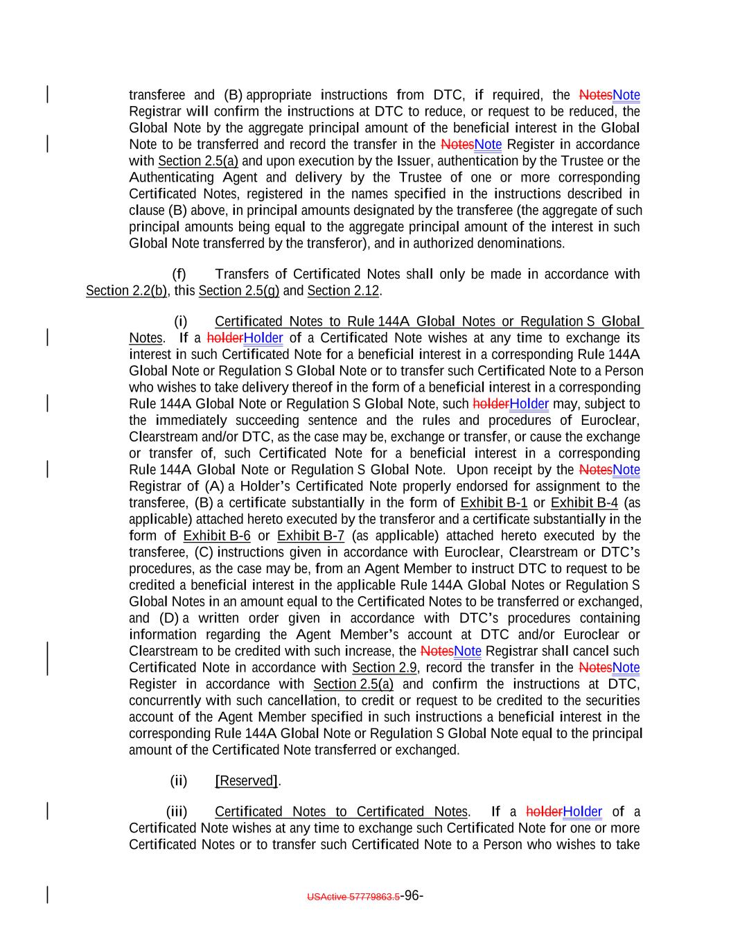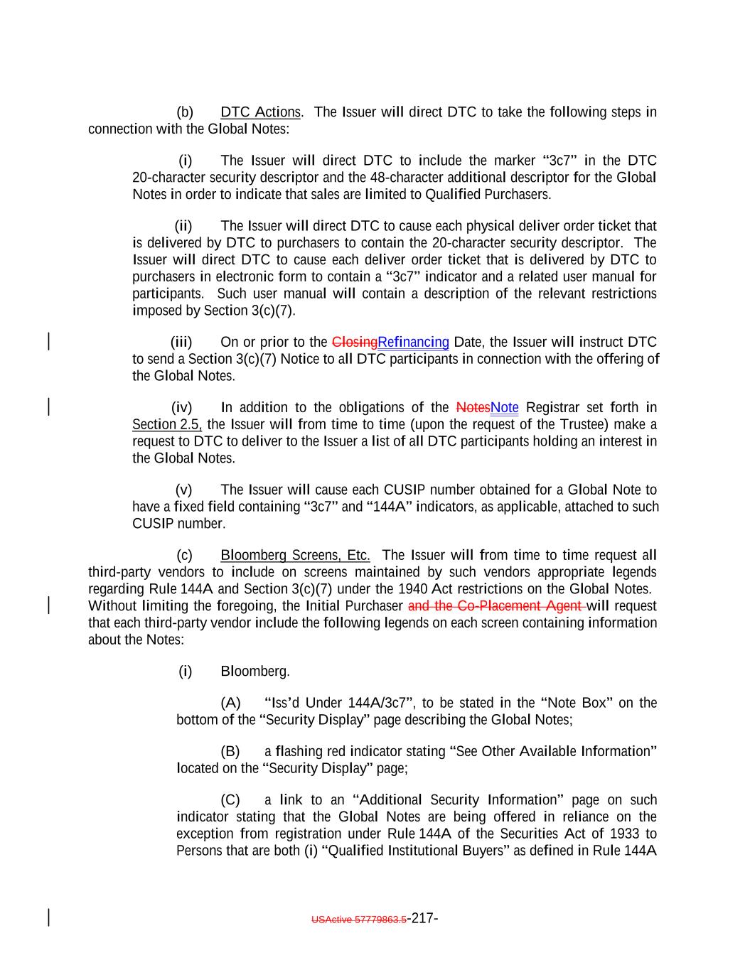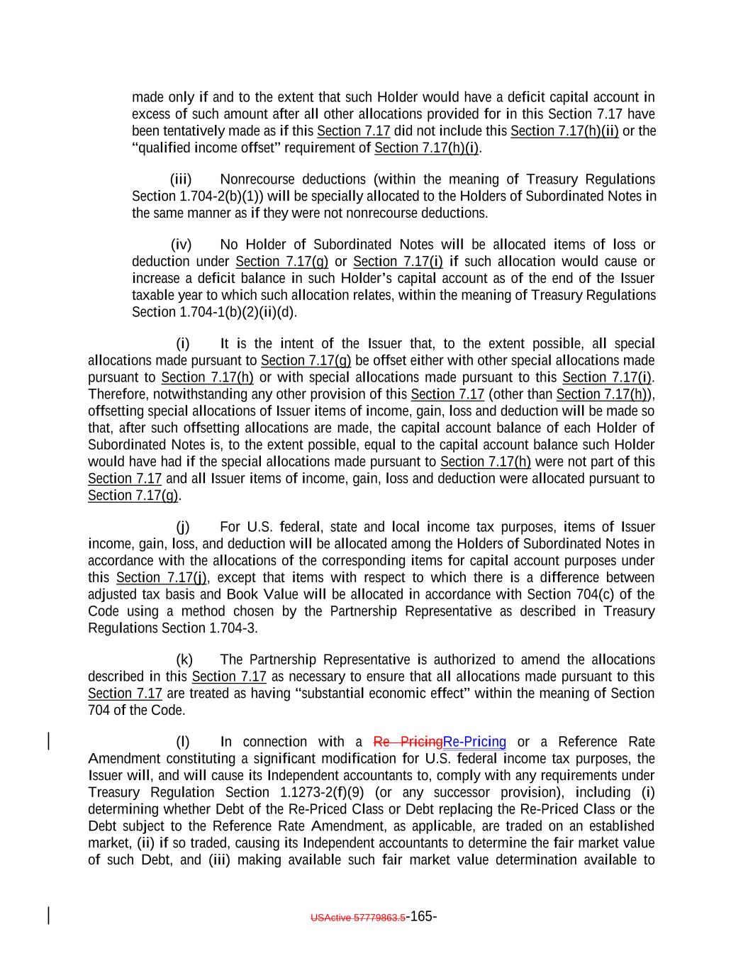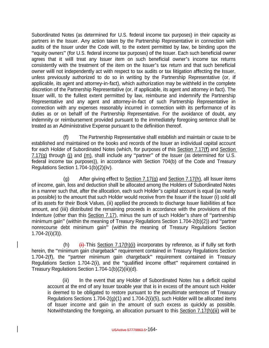 if such acquisition would cause the combined number of holders of Subordinated Notes and any equity interests in the Issuer to be held by more than 90 persons. 12. It acknowledges and agrees that it will not enter into any financial instrument the payments on which are, or the value of which is, determined in whole or in part by reference to the such Notes or other equity interests in the Issuer (including the amount of distributions on the such Notes or such equity interests, the value of the Issuer's assets, or the result of the Issuer's operations), or any contract that otherwise is described in Treasury Regulations Section 1.7704-1(a)(2)(i)(B). 13. It acknowledges and agrees that no Subordinated Note (or interest therein) may be acquired or owned by any person that is classified for U.S. federal income tax purposes as a partnership, subchapter S corporation or grantor trust unless (1)(x) none of the direct or indirect Holders of any interest in such person have more than 40% of the value of its interest in such person attributable to the aggregate interest of such person in the combined value of the Subordinated Notes and any other equity interests of the Issuer held by such person and (y) a principal purpose of the arrangement involving the investment of such person in any Subordinated Notes (or any other equity interests in the Issuer) is not and will not be to permit any partnership to satisfy the 100 partner limitation of Section 1.7704-1(h)(1)(ii) of the regulations under the Code; or (2) the Issuer must otherwise determine that the holder will not cause the Issuer to be unable to rely on the "private placement" safe harbor of Treasury Regulations Section 1.7704-1(h). 14. It may not transfer all or any portion of the Subordinated Notes unless: (1) the person to which it transfers such Subordinated Notes agrees to be bound by the restrictions, conditions, representations, warranties, and covenants set forth in the Indenture and Section 2.12(c)(iv) therein, and (2) such transfer does not violate Section 2.12(c)(iv) of the Indenture. 15. Any transfer made in violation of Section 2.12(c)(iv) of the Indenture, or that otherwise would cause the Issuer to be unable to rely on the "private placement" safe harbor of Treasury Regulations Section 1.7704-1(h), will be void and of no force or effect, and shall not bind or be recognized by the Issuer or any other person, and no person to which such Subordinated Notes are transferred shall become a holder unless such person agrees to be bound by Section 2.12(c)(iv) of the Indenture. However, notwithstanding the immediately preceding sentence, a transfer in violation of provisions (11), (12), (13), or (14), or (15) shall be permitted if the Issuer obtains written advice of Dechert LLP or Cadwalader, Wickersham & Taft LLP, or receives an opinion of another nationally recognized tax counsel, that the transfer will not cause the Issuer to be treated as a "publicly traded partnership" taxable as a corporation for U.S. federal income tax purposes. 16. If it holds 100% of the Subordinated Notes (or any interest therein), it will not sell, transfer, assign, participate, pledge or otherwise dispose any of its Notes, unless it obtains written advice of Dechert LLP or Cadwalader, Wickersham & Taft LLP, or an opinion of another nationally recognized tax counsel, that such sale, transfer, assignment, participation, pledge or disposition will not cause the Issuer to be treated as a "publicly USActive 57788128.4 B-3-5