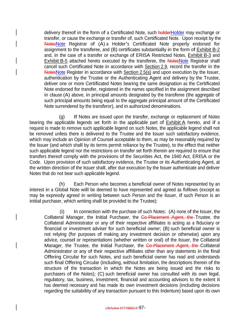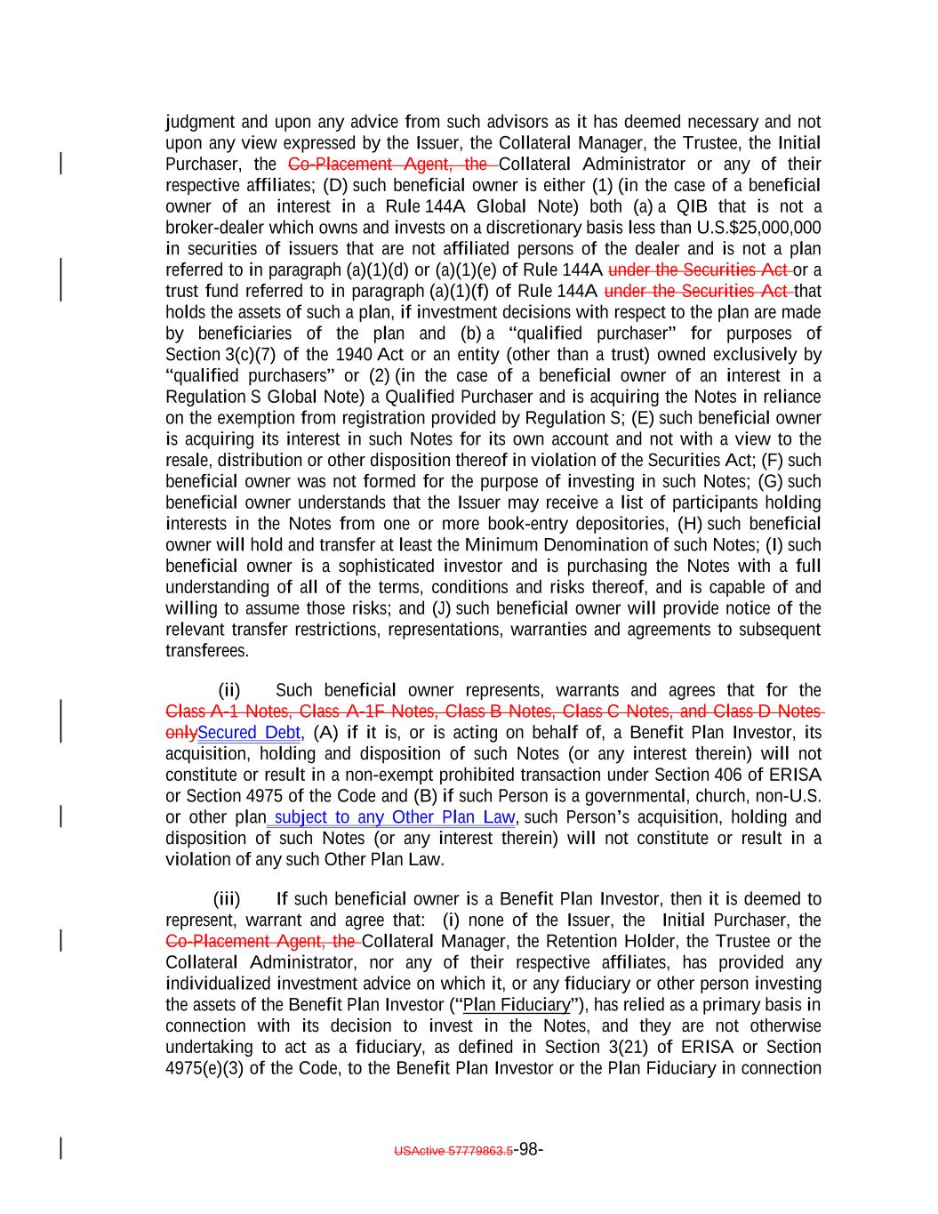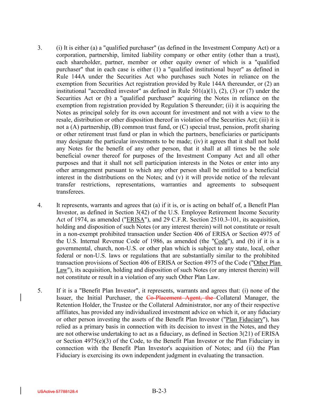 3. (i) It is either (a) a "qualified purchaser" (as defined in the Investment Company Act) or a corporation, partnership, limited liability company or other entity (other than a trust), each shareholder, partner, member or other equity owner of which is a "qualified purchaser" that in each case is either (1) a "qualified institutional buyer" as defined in Rule 144A under the Securities Act who purchases such Notes in reliance on the exemption from Securities Act registration provided by Rule 144A thereunder, or (2) an institutional "accredited investor" as defined in Rule 501(a)(1), (2), (3) or (7) under the Securities Act or (b) a "qualified purchaser" acquiring the Notes in reliance on the exemption from registration provided by Regulation S thereunder; (ii) it is acquiring the Notes as principal solely for its own account for investment and not with a view to the resale, distribution or other disposition thereof in violation of the Securities Act; (iii) it is not a (A) partnership, (B) common trust fund, or (C) special trust, pension, profit sharing or other retirement trust fund or plan in which the partners, beneficiaries or participants may designate the particular investments to be made; (iv) it agrees that it shall not hold any Notes for the benefit of any other person, that it shall at all times be the sole beneficial owner thereof for purposes of the Investment Company Act and all other purposes and that it shall not sell participation interests in the Notes or enter into any other arrangement pursuant to which any other person shall be entitled to a beneficial interest in the distributions on the Notes; and (v) it will provide notice of the relevant transfer restrictions, representations, warranties and agreements to subsequent transferees. 4. It represents, warrants and agrees that (a) if it is, or is acting on behalf of, a Benefit Plan Investor, as defined in Section 3(42) of the U.S. Employee Retirement Income Security Act of 1974, as amended ("ERISA"), and 29 C.F.R. Section 2510.3-101, its acquisition, holding and disposition of such Notes (or any interest therein) will not constitute or result in a non-exempt prohibited transaction under Section 406 of ERISA or Section 4975 of the U.S. Internal Revenue Code of 1986, as amended (the "Code"), and (b) if it is a governmental, church, non-U.S. or other plan which is subject to any state, local, other federal or non-U.S. laws or regulations that are substantially similar to the prohibited transaction provisions of Section 406 of ERISA or Section 4975 of the Code ("Other Plan Law"), its acquisition, holding and disposition of such Notes (or any interest therein) will not constitute or result in a violation of any such Other Plan Law. 5. If it is a "Benefit Plan Investor", it represents, warrants and agrees that: (i) none of the Issuer, the Initial Purchaser, the Co-Placement Agent, the Collateral Manager, the Retention Holder, the Trustee or the Collateral Administrator, nor any of their respective affiliates, has provided any individualized investment advice on which it, or any fiduciary or other person investing the assets of the Benefit Plan Investor ("Plan Fiduciary"), has relied as a primary basis in connection with its decision to invest in the Notes, and they are not otherwise undertaking to act as a fiduciary, as defined in Section 3(21) of ERISA or Section 4975(e)(3) of the Code, to the Benefit Plan Investor or the Plan Fiduciary in connection with the Benefit Plan Investor's acquisition of Notes; and (ii) the Plan Fiduciary is exercising its own independent judgment in evaluating the transaction. USActive 57788128.4 B-2-3