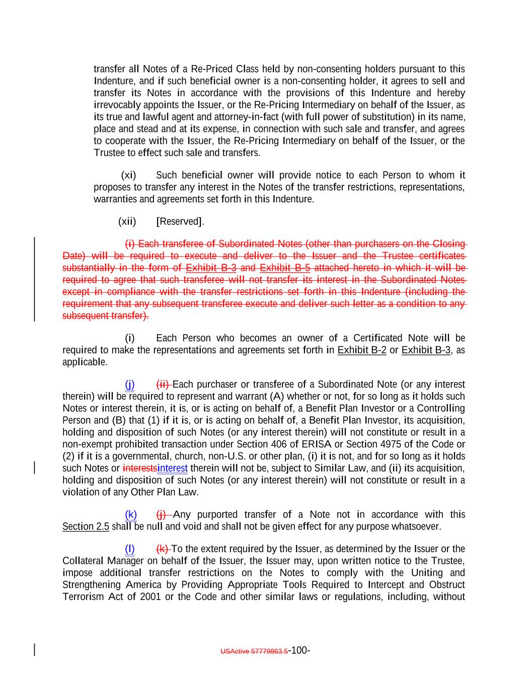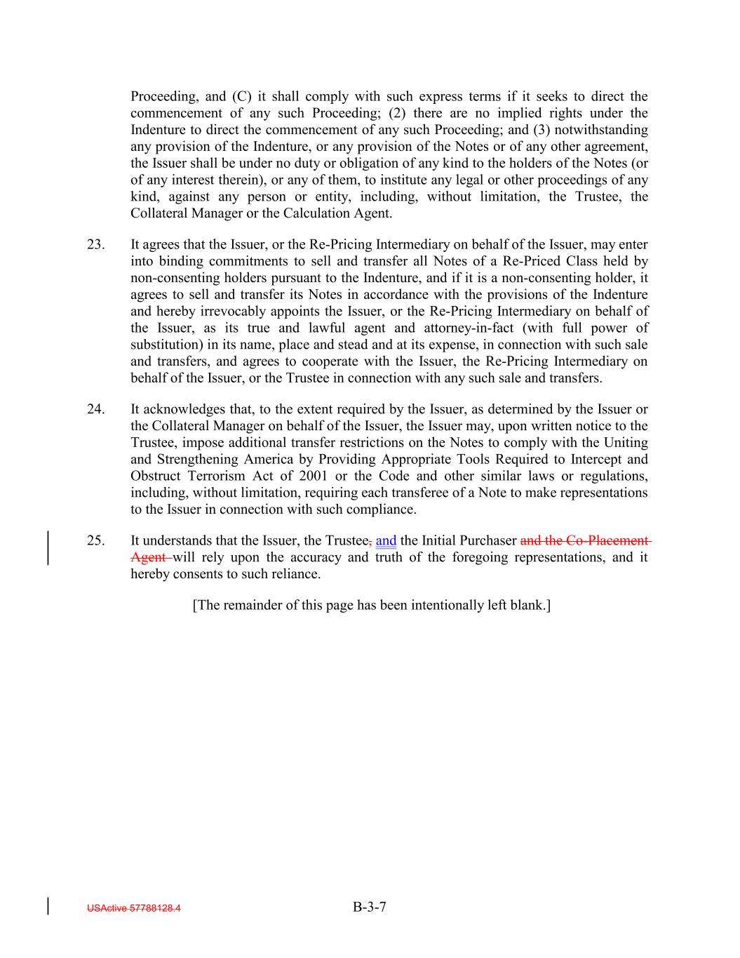Proceeding, and (C) it shall comply with such express terms if it seeks to direct the commencement of any such Proceeding; (2) there are no implied rights under the Indenture to direct the commencement of any such Proceeding; and (3) notwithstanding any provision of the Indenture, or any provision of the Notes or of any other agreement, the Issuer shall be under no duty or obligation of any kind to the holders of the Notes (or of any interest therein), or any of them, to institute any legal or other proceedings of any kind, against any person or entity, including, without limitation, the Trustee, the Collateral Manager or the Calculation Agent. 23. It agrees that the Issuer, or the Re-Pricing Intermediary on behalf of the Issuer, may enter into binding commitments to sell and transfer all Notes of a Re-Priced Class held by non-consenting holders pursuant to the Indenture, and if it is a non-consenting holder, it agrees to sell and transfer its Notes in accordance with the provisions of the Indenture and hereby irrevocably appoints the Issuer, or the Re-Pricing Intermediary on behalf of the Issuer, as its true and lawful agent and attorney-in-fact (with full power of substitution) in its name, place and stead and at its expense, in connection with such sale and transfers, and agrees to cooperate with the Issuer, the Re-Pricing Intermediary on behalf of the Issuer, or the Trustee in connection with any such sale and transfers. 24. It acknowledges that, to the extent required by the Issuer, as determined by the Issuer or the Collateral Manager on behalf of the Issuer, the Issuer may, upon written notice to the Trustee, impose additional transfer restrictions on the Notes to comply with the Uniting and Strengthening America by Providing Appropriate Tools Required to Intercept and Obstruct Terrorism Act of 2001 or the Code and other similar laws or regulations, including, without limitation, requiring each transferee of a Note to make representations to the Issuer in connection with such compliance. 25. It understands that the Issuer, the Trustee, and the Initial Purchaser and the Co-Placement Agent will rely upon the accuracy and truth of the foregoing representations, and it hereby consents to such reliance. [The remainder of this page has been intentionally left blank.] USActive 57788128.4 B-3-7