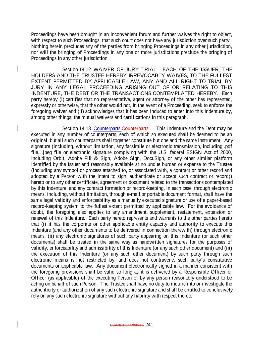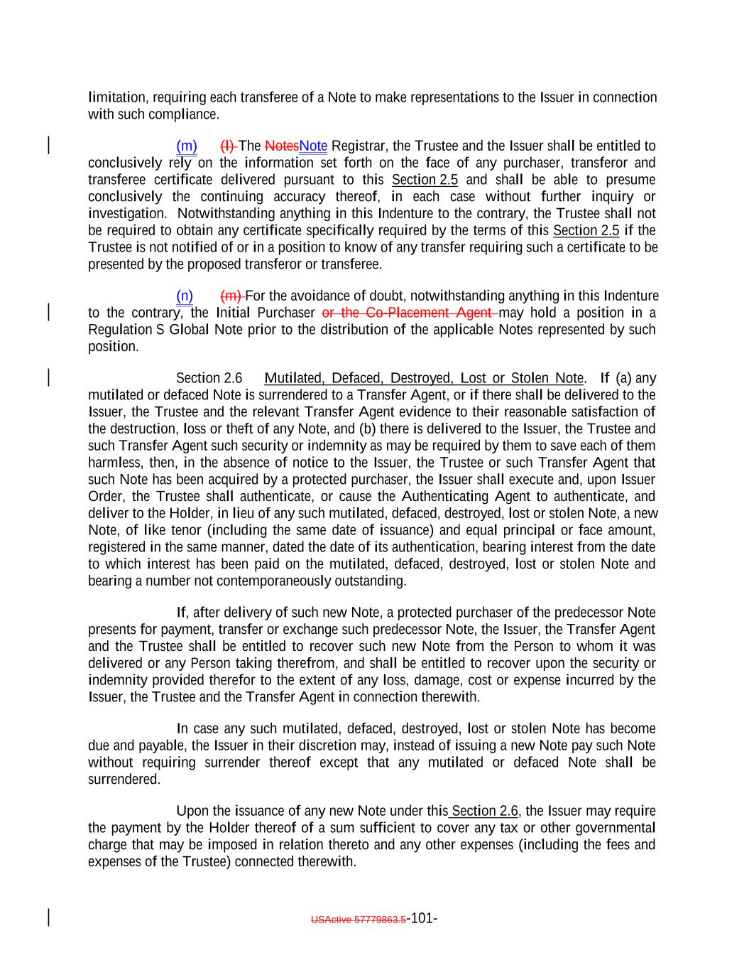 The Secured Notes shall be held in minimum denominations of U.S.$250,000 and integral multiples of U.S.$1 in excess thereof. Title to Notes shall pass by registration in the NotesNote Register kept by the Trustee, acting through its Corporate Trust Office. No service charge shall be made for registration of transfer or exchange of this Note, but the Trustee or the NotesNote Registrar may require payment of a sum sufficient to cover any tax or other governmental charge payable in connection therewith. Each holder and beneficial owner of this Note, by its acceptance of this Note, hereby agrees that they shall not institute against, or join any other Person in instituting against the Issuer any bankruptcy, reorganization, arrangement, insolvency, moratorium or liquidation Proceedings or other similar Proceedings under U.S. federal or state bankruptcy laws or any similar laws until at least one year and one day after payment in full of the NotesDebt, or, if longer, any applicable preference period then in effect plus one day following such payment in full. THIS NOTE MAY BE EXECUTED OR AUTHENTICATED IN ANY NUMBER OF COUNTERPARTS, EACH OF WHICH SO EXECUTED OR AUTHENTICATED SHALL BE DEEMED TO BE AN ORIGINAL, BUT ALL SUCH COUNTERPARTS SHALL TOGETHER CONSTITUTE BUT ONE AND THE SAME INSTRUMENT. DELIVERY OF AN EXECUTED OR AUTHENTICATED COUNTERPART OF THIS NOTE BY ELECTRONIC MEANS (INCLUDING EMAIL, PORTABLE DOCUMENT FORMAT (PDF) FILE OR FACSIMILE) WILL BE EFFECTIVE AS DELIVERY OF A MANUALLY EXECUTED OR AUTHENTICATED COUNTERPART OF THIS NOTE. AS PROVIDED IN THE INDENTURE, THE INDENTURE AND THE NOTES SHALL BE CONSTRUED IN ACCORDANCE WITH, AND GOVERNED BY, THE LAWS OF THE STATE OF NEW YORK. USActive 57788128.4 A-1-10