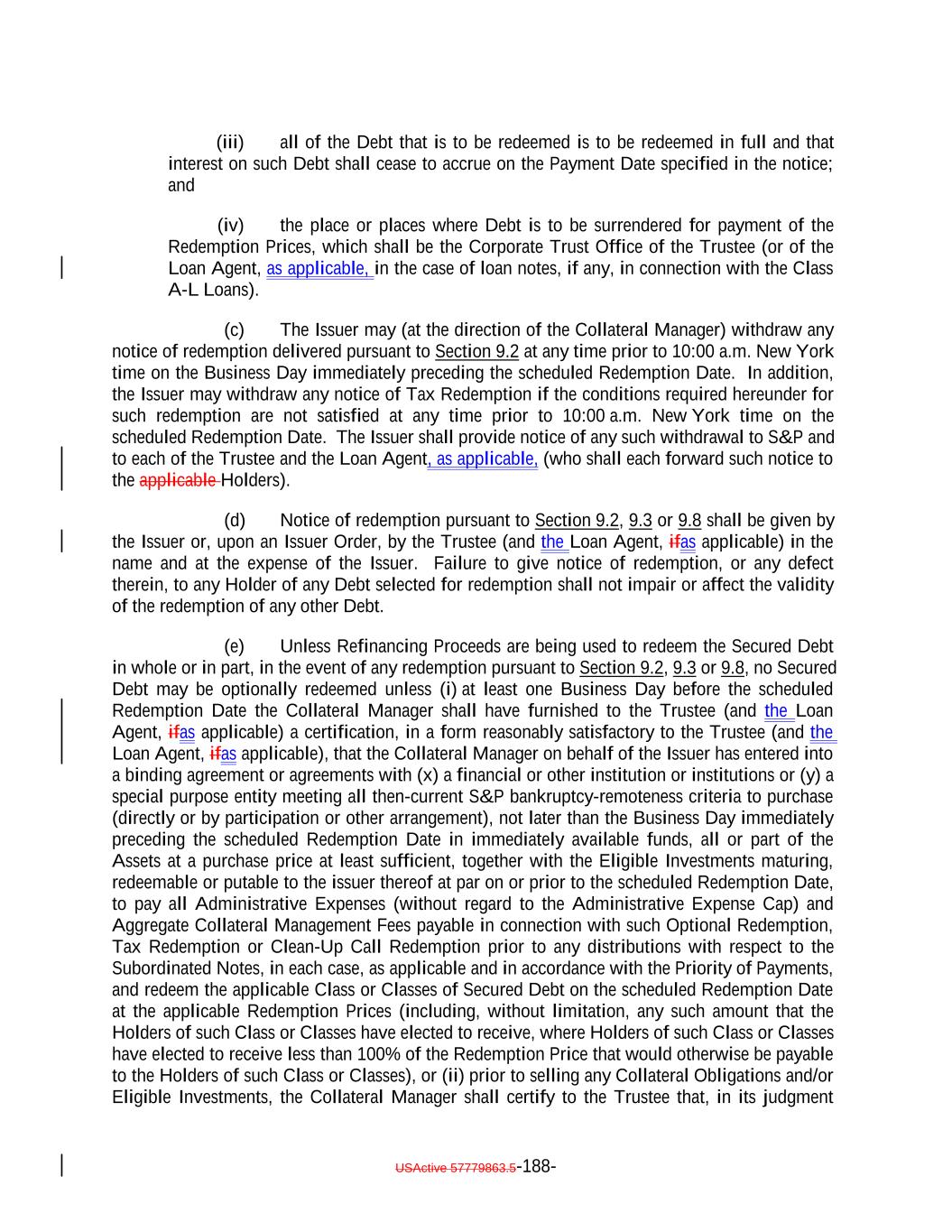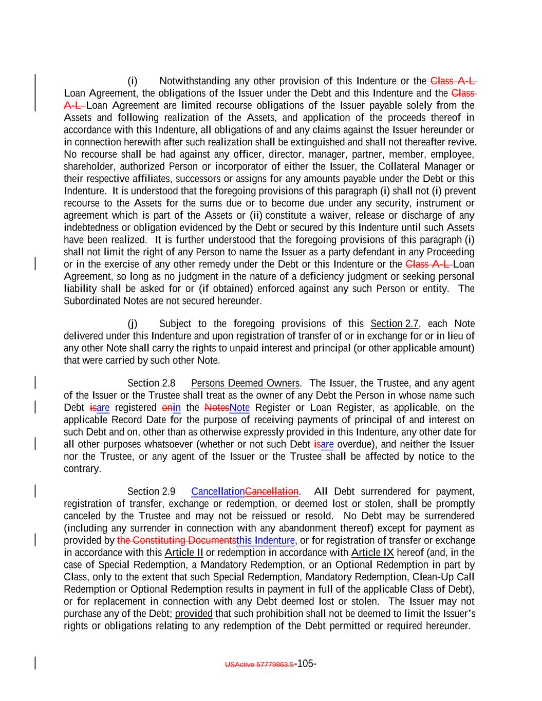 limitations of rights, duties and immunities thereunder of the Issuer, the Trustee and the Holders of the Notes and the terms upon which the Notes are, and are to be, authenticated and delivered. Capitalized terms used herein and not otherwise defined shall have the meanings set forth in the Indenture. This Note is subject to mandatory redemption if any Coverage Test is not satisfied as set forth in Section 9.1 of the Indenture, and Optional Redemption, Tax Redemption and Special Redemption in the manner and subject to the satisfaction of certain conditions set forth in the Indenture. The Redemption Price for this Note is set forth in the Indenture. In connection with any Tax Redemption, Clean-Up Call Redemption or Optional Redemption of the Secured Debt in whole, holders of 100% of the aggregate outstanding principal amount of any Class of Secured Debt may elect to receive less than 100% of the Redemption Price that would otherwise be payable to the Holders of such Class of Secured Debt. If the Note Details indicate that this Note is Global Eligible, this Note may be transferred to a transferee acquiring Certificated Notes, to a transferee taking an interest in a Rule 144A Global Note or to a transferee taking an interest in a Regulation S Global Note, subject to and in accordance with the restrictions set forth in the Indenture. The Issuer, the Trustee, and any agent of the Issuer or the Trustee may treat the Person in whose name this Note is registered on the NotesNote Register on the applicable Record Date as the owner of such Note for the purpose of receiving payments of principal of and interest on such Note and on any other date for all other purposes whatsoever (whether or not such Note is overdue), and neither the Issuer nor the Trustee nor any agent of the Issuer or the Trustee shall be affected by notice to the contrary. The Secured Notes shall be held in minimum denominations of U.S.$250,000 and integral multiples of U.S.$1 in excess thereof. If an Event of Default shall occur and be continuing, the DebtNotes may become or be declared due and payable in the manner and with the effect provided in the Indenture. Title to Notes shall pass by registration in the NotesNote Register kept by the Trustee, acting through its Corporate Trust Office. No service charge shall be made for registration of transfer or exchange of this Note, but the Trustee or the NotesNote Registrar may require payment of a sum sufficient to cover any tax or other governmental charge payable in connection therewith. Each holder and beneficial owner of this Note, by its acceptance of this Note, hereby agrees that they shall not institute against, or join any other Person in instituting against the Issuer any bankruptcy, reorganization, arrangement, insolvency, moratorium or liquidation Proceedings or other similar Proceedings under U.S. federal or state bankruptcy laws or any similar laws until at least one year and one day after payment in full of the NotesDebt, or, if longer, any applicable preference period then in effect plus one day following such payment in full. USActive 57788128.4 A-2-9