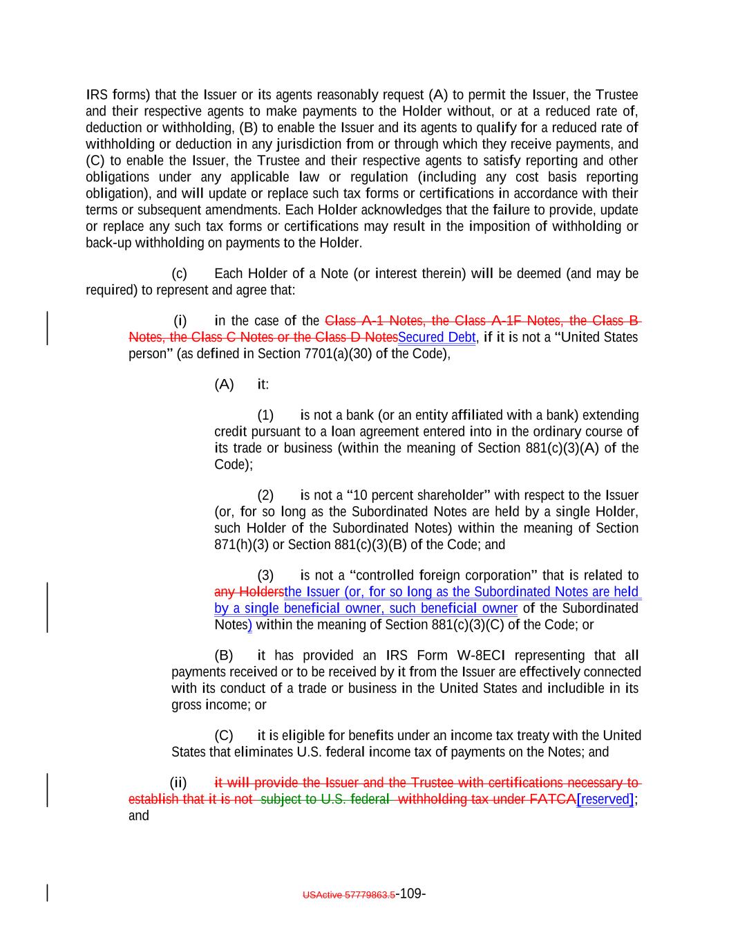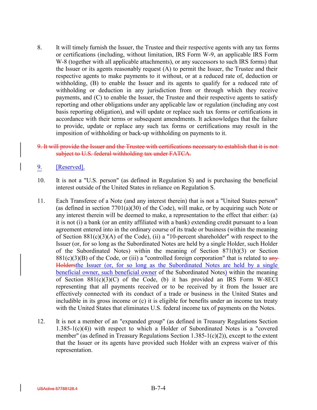 8. It will timely furnish the Issuer, the Trustee and their respective agents with any tax forms or certifications (including, without limitation, IRS Form W-9, an applicable IRS Form W-8 (together with all applicable attachments), or any successors to such IRS forms) that the Issuer or its agents reasonably request (A) to permit the Issuer, the Trustee and their respective agents to make payments to it without, or at a reduced rate of, deduction or withholding, (B) to enable the Issuer and its agents to qualify for a reduced rate of withholding or deduction in any jurisdiction from or through which they receive payments, and (C) to enable the Issuer, the Trustee and their respective agents to satisfy reporting and other obligations under any applicable law or regulation (including any cost basis reporting obligation), and will update or replace such tax forms or certifications in accordance with their terms or subsequent amendments. It acknowledges that the failure to provide, update or replace any such tax forms or certifications may result in the imposition of withholding or back-up withholding on payments to it. 9. It will provide the Issuer and the Trustee with certifications necessary to establish that it is not subject to U.S. federal withholding tax under FATCA. 9. [Reserved]. 10. It is not a "U.S. person" (as defined in Regulation S) and is purchasing the beneficial interest outside of the United States in reliance on Regulation S. 11. Each Transferee of a Note (and any interest therein) that is not a "United States person" (as defined in section 7701(a)(30) of the Code), will make, or by acquiring such Note or any interest therein will be deemed to make, a representation to the effect that either: (a) it is not (i) a bank (or an entity affiliated with a bank) extending credit pursuant to a loan agreement entered into in the ordinary course of its trade or business (within the meaning of Section 881(c)(3)(A) of the Code), (ii) a "10-percent shareholder" with respect to the Issuer (or, for so long as the Subordinated Notes are held by a single Holder, such Holder of the Subordinated Notes) within the meaning of Section 871(h)(3) or Section 881(c)(3)(B) of the Code, or (iii) a "controlled foreign corporation" that is related to any Holdersthe Issuer (or, for so long as the Subordinated Notes are held by a single beneficial owner, such beneficial owner of the Subordinated Notes) within the meaning of Section 881(c)(3)(C) of the Code, (b) it has provided an IRS Form W-8ECI representing that all payments received or to be received by it from the Issuer are effectively connected with its conduct of a trade or business in the United States and includible in its gross income or (c) it is eligible for benefits under an income tax treaty with the United States that eliminates U.S. federal income tax of payments on the Notes. 12. It is not a member of an "expanded group" (as defined in Treasury Regulations Section 1.385-1(c)(4)) with respect to which a Holder of Subordinated Notes is a "covered member" (as defined in Treasury Regulations Section 1.385-1(c)(2)), except to the extent that the Issuer or its agents have provided such Holder with an express waiver of this representation. USActive 57788128.4 B-7-4