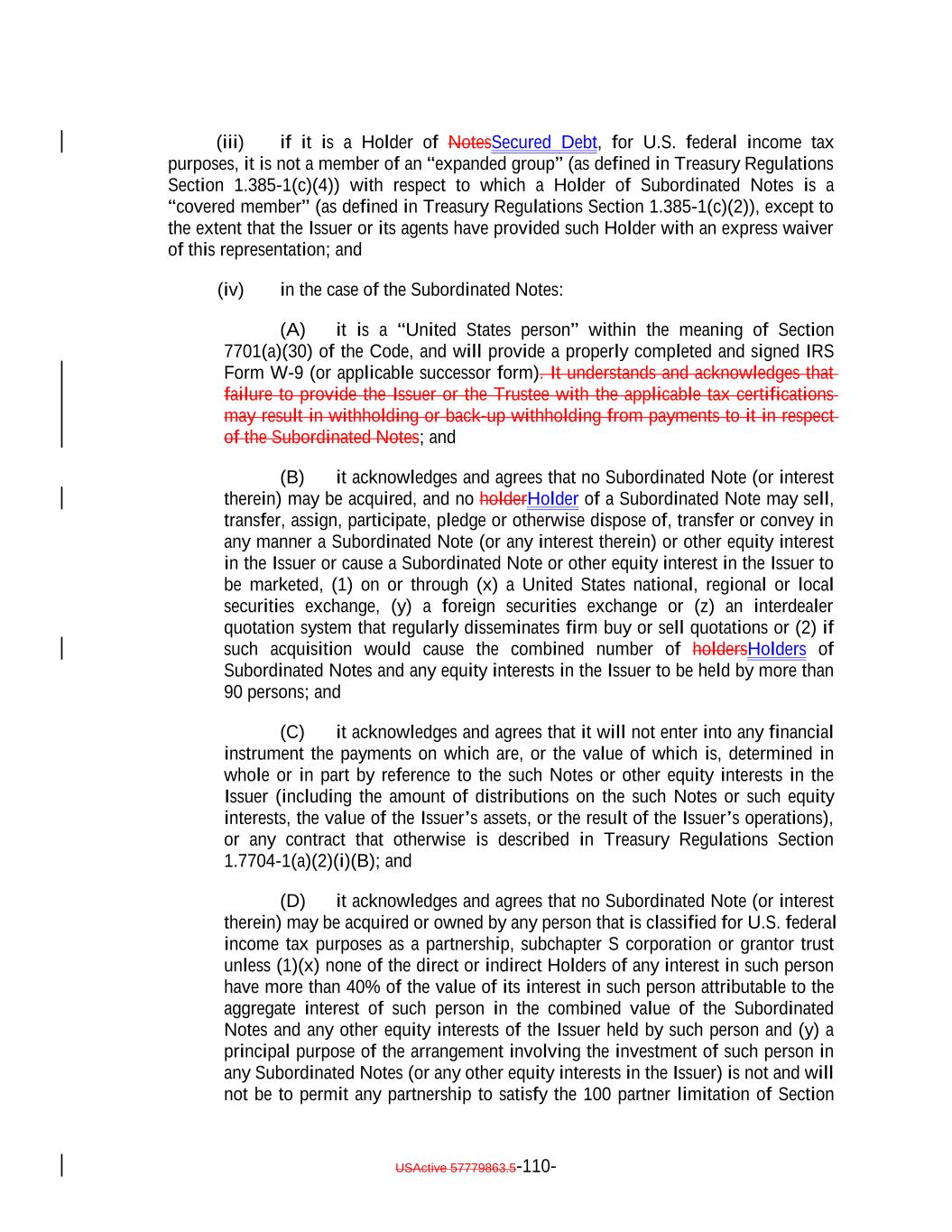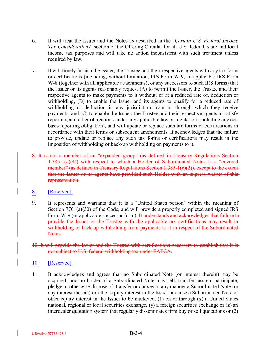 6. It will treat the Issuer and the Notes as described in the "Certain U.S. Federal Income Tax Considerations" section of the Offering Circular for all U.S. federal, state and local income tax purposes and will take no action inconsistent with such treatment unless required by law. 7. It will timely furnish the Issuer, the Trustee and their respective agents with any tax forms or certifications (including, without limitation, IRS Form W-9, an applicable IRS Form W-8 (together with all applicable attachments), or any successors to such IRS forms) that the Issuer or its agents reasonably request (A) to permit the Issuer, the Trustee and their respective agents to make payments to it without, or at a reduced rate of, deduction or withholding, (B) to enable the Issuer and its agents to qualify for a reduced rate of withholding or deduction in any jurisdiction from or through which they receive payments, and (C) to enable the Issuer, the Trustee and their respective agents to satisfy reporting and other obligations under any applicable law or regulation (including any cost basis reporting obligation), and will update or replace such tax forms or certifications in accordance with their terms or subsequent amendments. It acknowledges that the failure to provide, update or replace any such tax forms or certifications may result in the imposition of withholding or back-up withholding on payments to it. 8. It is not a member of an “expanded group” (as defined in Treasury Regulations Section 1.385-1(c)(4)) with respect to which a Holder of Subordinated Notes is a “covered member” (as defined in Treasury Regulations Section 1.385-1(c)(2)), except to the extent that the Issuer or its agents have provided such Holder with an express waiver of this representation. 8. [Reserved]. 9. It represents and warrants that it is a "United States person" within the meaning of Section 7701(a)(30) of the Code, and will provide a properly completed and signed IRS Form W-9 (or applicable successor form). It understands and acknowledges that failure to provide the Issuer or the Trustee with the applicable tax certifications may result in withholding or back-up withholding from payments to it in respect of the Subordinated Notes. 10. It will provide the Issuer and the Trustee with certifications necessary to establish that it is not subject to U.S. federal withholding tax under FATCA. 10. [Reserved]. 11. It acknowledges and agrees that no Subordinated Note (or interest therein) may be acquired, and no holder of a Subordinated Note may sell, transfer, assign, participate, pledge or otherwise dispose of, transfer or convey in any manner a Subordinated Note (or any interest therein) or other equity interest in the Issuer or cause a Subordinated Note or other equity interest in the Issuer to be marketed, (1) on or through (x) a United States national, regional or local securities exchange, (y) a foreign securities exchange or (z) an interdealer quotation system that regularly disseminates firm buy or sell quotations or (2) USActive 57788128.4 B-3-4