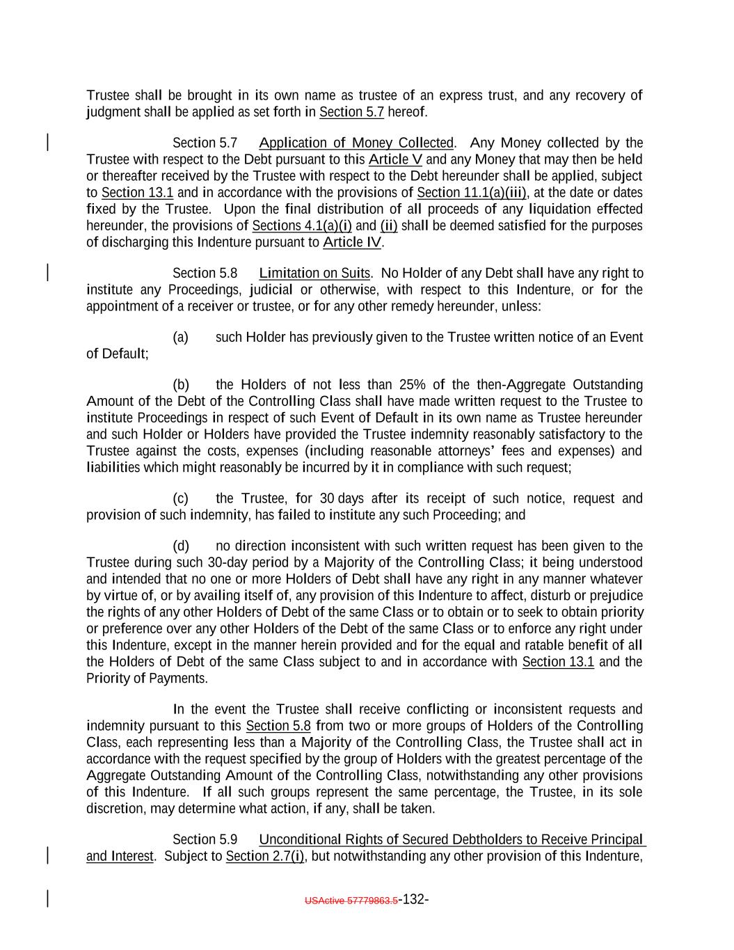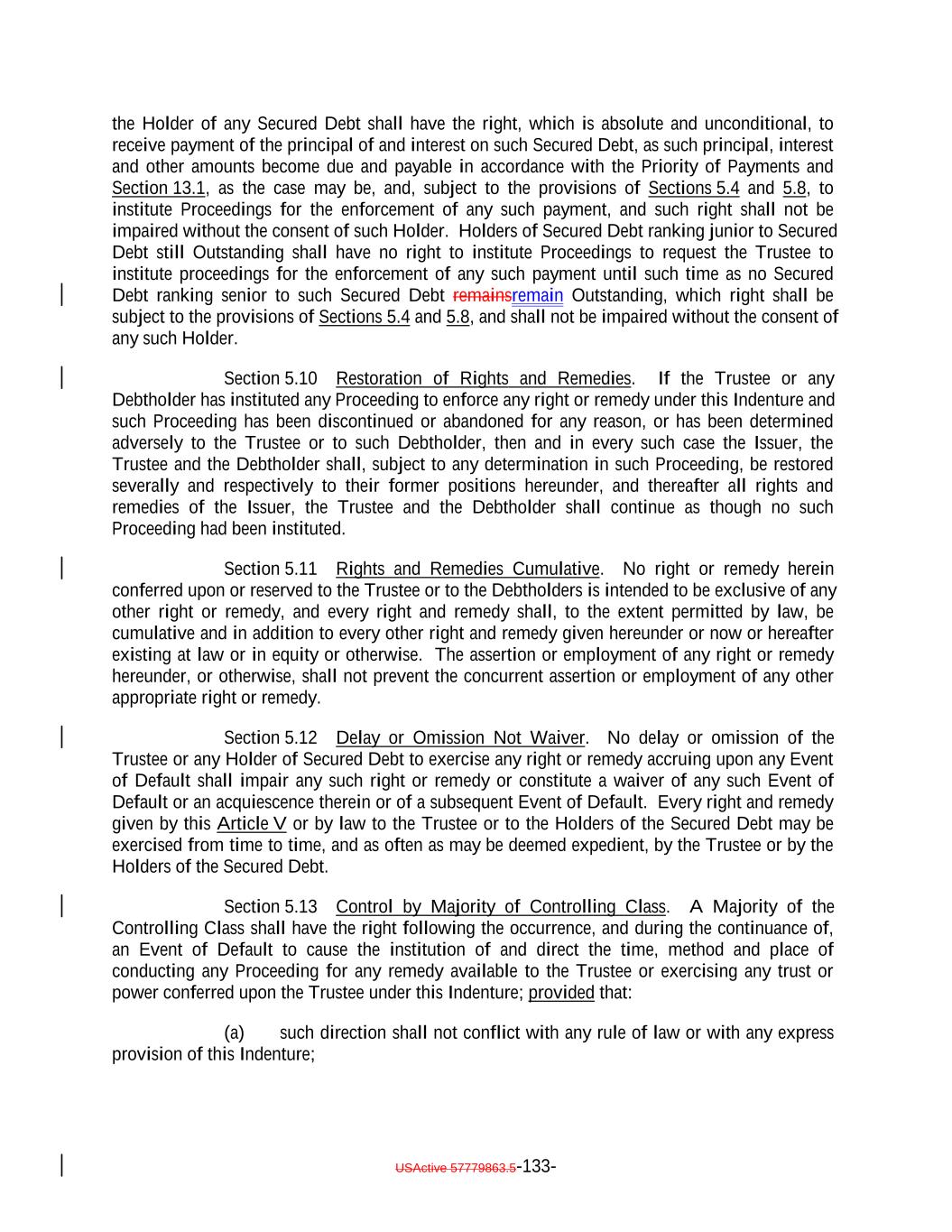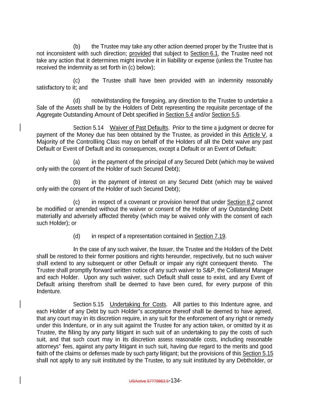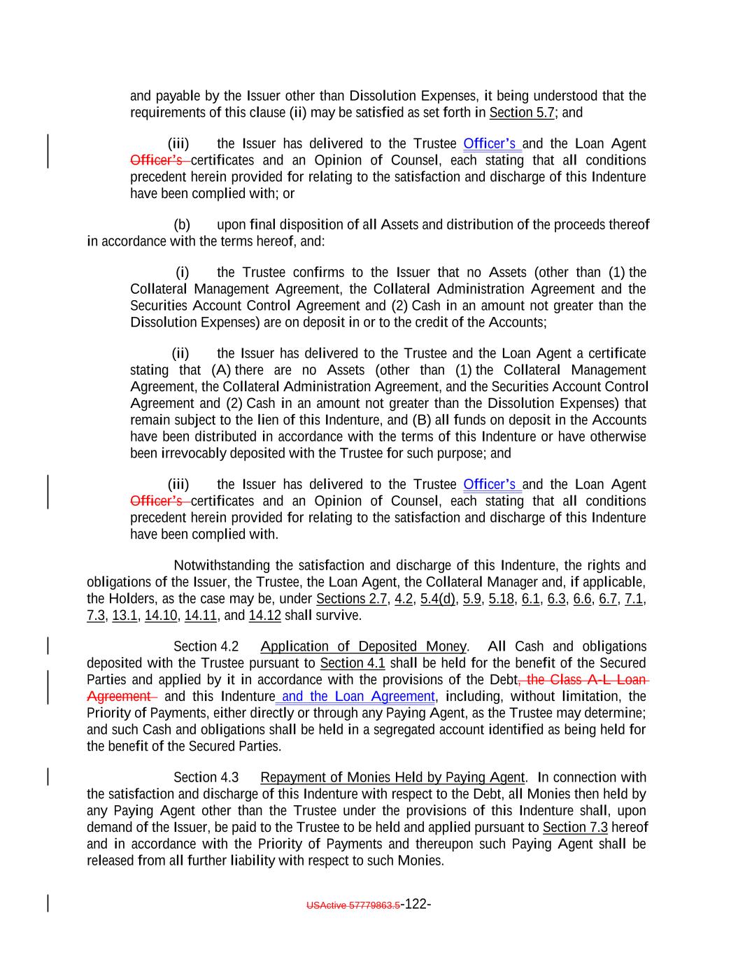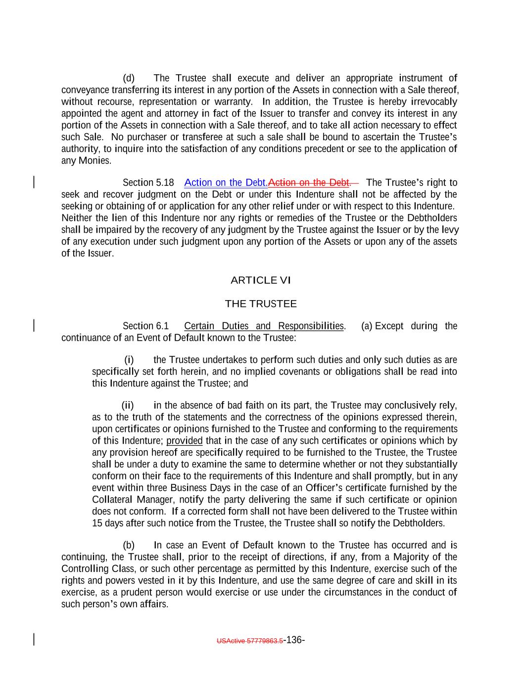 TABLE OF CONTENTS (continued) Page -ii- Section 3.3 Custodianship; Delivery of Collateral Obligations and Eligible Investments. 109105 ARTICLE IV SATISFACTION AND DISCHARGE Section 4.1 Satisfaction and Discharge of Indenture. 110106 Section 4.2 Application of Deposited Money. 112108 Section 4.3 Repayment of Monies Held by Paying Agent. 112108 Section 4.4 Limitation on Obligation to Incur Administrative Expenses. 112108 ARTICLE V EVENTS OF DEFAULT; REMEDIES Section 5.1 Events of Default. 112109 Section 5.2 Acceleration of Maturity; Rescission and Annulment. 114110 Section 5.3 Collection of Indebtedness and Suits for Enforcement by Trustee. 116112 Section 5.4 Remedies. 117113 Section 5.5 Optional Preservation of Assets. 119115 Section 5.6 Trustee May Enforce Claims Without Possession of Debt. 121117 Section 5.7 Application of Money Collected. 121117 Section 5.8 Limitation on Suits. 121117 Section 5.9 Unconditional Rights of Secured Debtholders to Receive Principal and Interest. 122118 Section 5.10 Restoration of Rights and Remedies. 122118 Section 5.11 Rights and Remedies Cumulative. 122118 Section 5.12 Delay or Omission Not Waiver. 122118 Section 5.13 Control by Majority of Controlling Class. 122119 Section 5.14 Waiver of Past Defaults. 123119 Section 5.15 Undertaking for Costs. 123119 Section 5.16 Waiver of Stay or Extension Laws. 124120 Section 5.17 Sale of Assets. 124120 Section 5.18 Action on the Debt. 125121