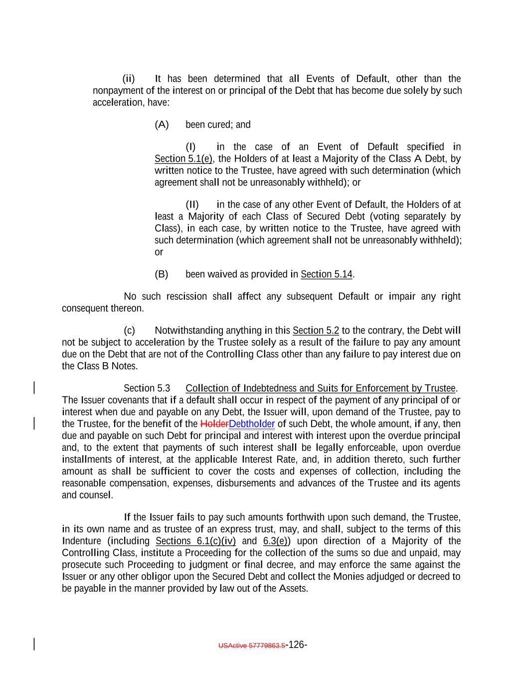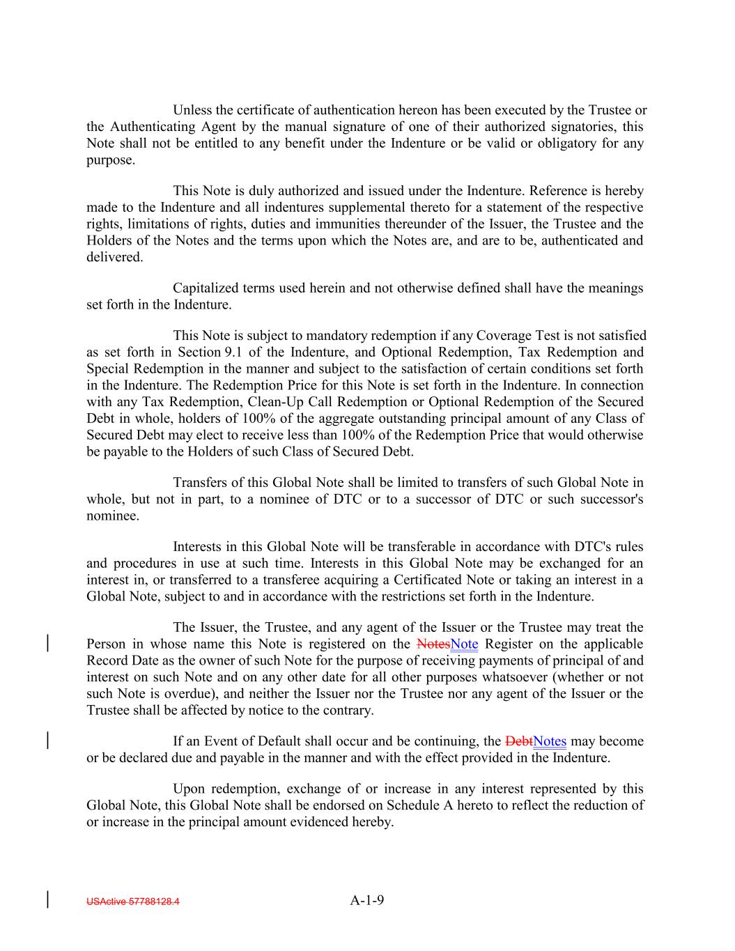 Unless the certificate of authentication hereon has been executed by the Trustee or the Authenticating Agent by the manual signature of one of their authorized signatories, this Note shall not be entitled to any benefit under the Indenture or be valid or obligatory for any purpose. This Note is duly authorized and issued under the Indenture. Reference is hereby made to the Indenture and all indentures supplemental thereto for a statement of the respective rights, limitations of rights, duties and immunities thereunder of the Issuer, the Trustee and the Holders of the Notes and the terms upon which the Notes are, and are to be, authenticated and delivered. Capitalized terms used herein and not otherwise defined shall have the meanings set forth in the Indenture. This Note is subject to mandatory redemption if any Coverage Test is not satisfied as set forth in Section 9.1 of the Indenture, and Optional Redemption, Tax Redemption and Special Redemption in the manner and subject to the satisfaction of certain conditions set forth in the Indenture. The Redemption Price for this Note is set forth in the Indenture. In connection with any Tax Redemption, Clean-Up Call Redemption or Optional Redemption of the Secured Debt in whole, holders of 100% of the aggregate outstanding principal amount of any Class of Secured Debt may elect to receive less than 100% of the Redemption Price that would otherwise be payable to the Holders of such Class of Secured Debt. Transfers of this Global Note shall be limited to transfers of such Global Note in whole, but not in part, to a nominee of DTC or to a successor of DTC or such successor's nominee. Interests in this Global Note will be transferable in accordance with DTC's rules and procedures in use at such time. Interests in this Global Note may be exchanged for an interest in, or transferred to a transferee acquiring a Certificated Note or taking an interest in a Global Note, subject to and in accordance with the restrictions set forth in the Indenture. The Issuer, the Trustee, and any agent of the Issuer or the Trustee may treat the Person in whose name this Note is registered on the NotesNote Register on the applicable Record Date as the owner of such Note for the purpose of receiving payments of principal of and interest on such Note and on any other date for all other purposes whatsoever (whether or not such Note is overdue), and neither the Issuer nor the Trustee nor any agent of the Issuer or the Trustee shall be affected by notice to the contrary. If an Event of Default shall occur and be continuing, the DebtNotes may become or be declared due and payable in the manner and with the effect provided in the Indenture. Upon redemption, exchange of or increase in any interest represented by this Global Note, this Global Note shall be endorsed on Schedule A hereto to reflect the reduction of or increase in the principal amount evidenced hereby. USActive 57788128.4 A-1-9