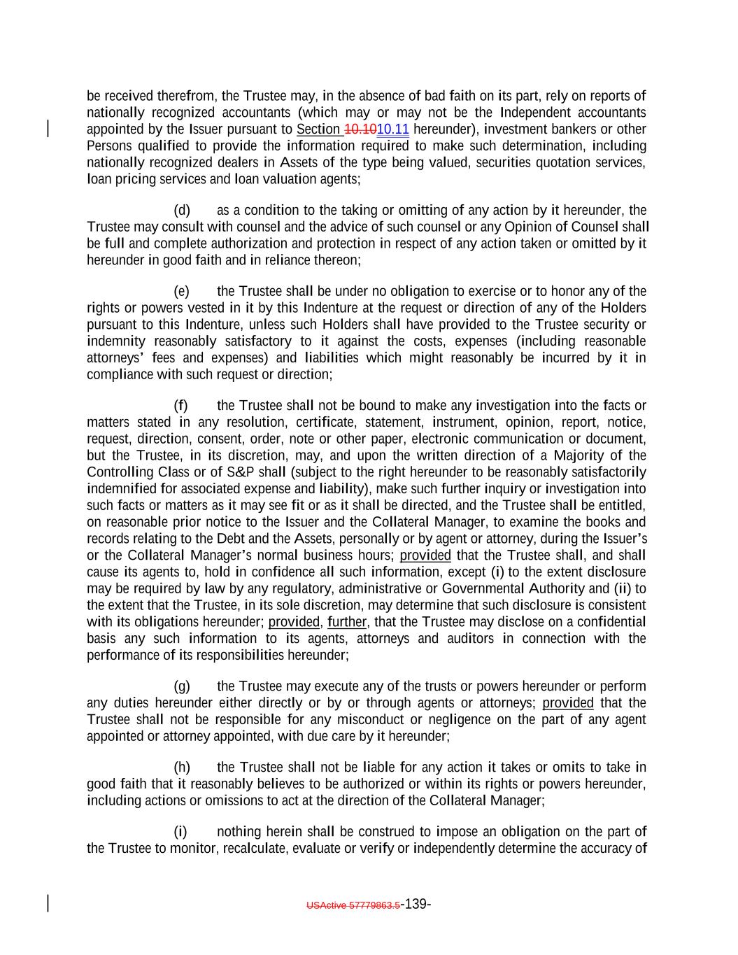 - 6 - The recitals contained in this Supplemental Indenture shall be taken as the statements of the Issuer, and the Trustee assumes no responsibility for their correctness. Except as provided in the Indenture, the Trustee shall not be responsible or accountable in any way whatsoever for or with respect to the validity, execution or sufficiency of this Supplemental Indenture and makes no representation with respect thereto. In entering into this Supplemental Indenture, the Trustee shall be entitled to the benefit of every provision of the Indenture relating to the conduct of or affecting the liability of or affording protection to the Trustee. 9. Non-Petition; Limited Recourse. The parties hereto agree to the provisions set forth in Sections 2.7(i), 5.4(d) and 13.1(c) of the Indenture, and such provisions are incorporated in this Supplemental Indenture, mutatis mutandis. 10. No Other Changes. Except as provided herein, including Annex A hereto, the Original Indenture shall remain unchanged and in full force and effect, and each reference to the Indenture and words of similar import in the Indenture, as amended hereby, shall be a reference to the Indenture as amended hereby and as the same may be further amended, supplemented and otherwise modified and in effect from time to time. This Supplemental Indenture may be used to create a conformed amended and restated Indenture for the convenience of administration by the parties hereto. 11. Execution, Delivery and Validity. The Issuer represents and warrants to the Trustee that this Supplemental Indenture has been duly and validly executed and delivered by it and constitutes its legal, valid and binding obligation, enforceable against it in accordance with its terms. 12. Binding Effect. This Supplemental Indenture shall be binding upon and inure to the benefit of the parties hereto and their respective successors and assigns. 13. Direction to the Trustee. Each of the Issuer and the Collateral Manager hereby direct the Trustee to execute this Supplemental Indenture and acknowledge and agree that the Trustee will be fully protected in relying upon the foregoing direction.