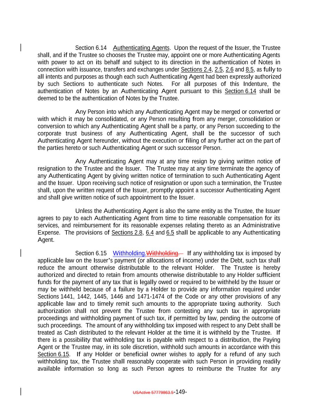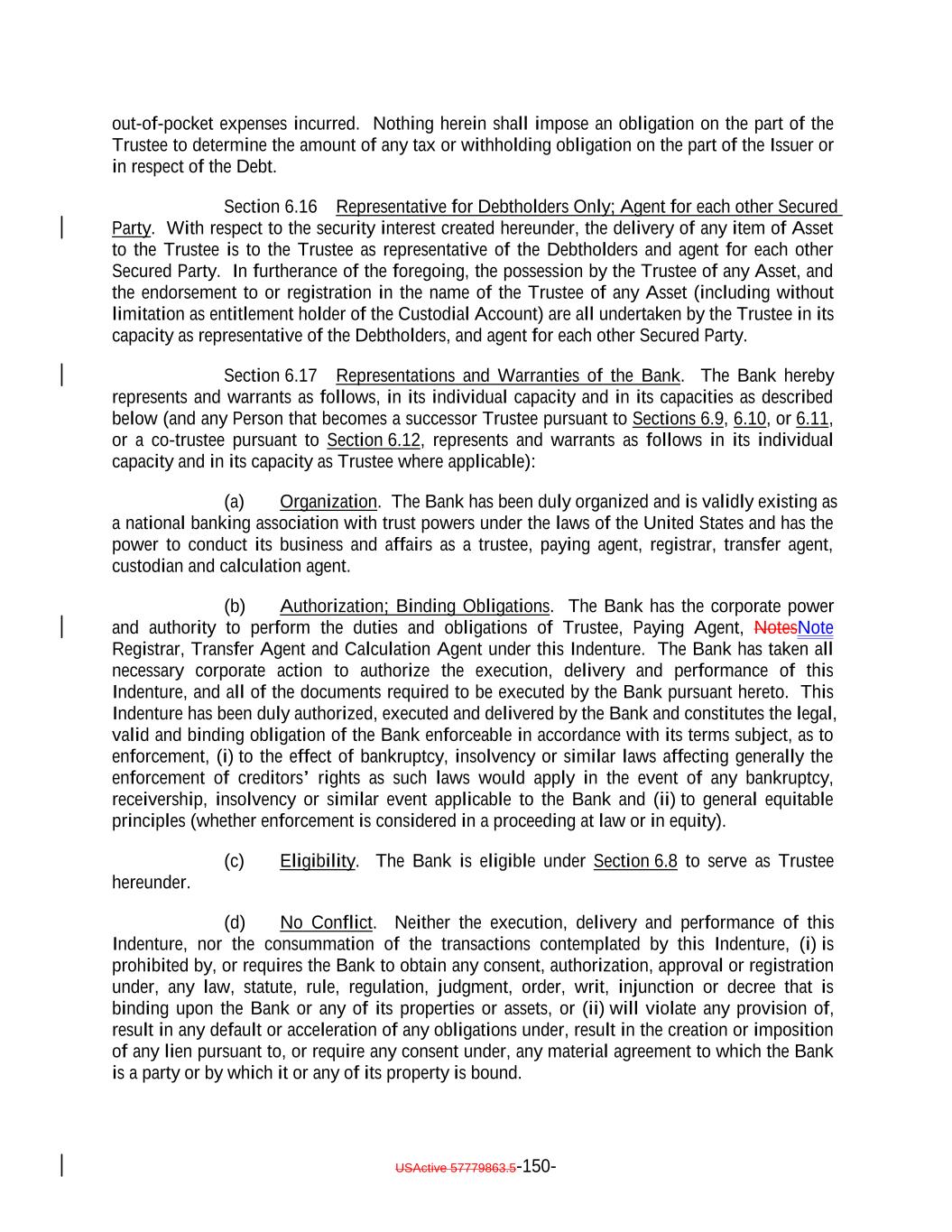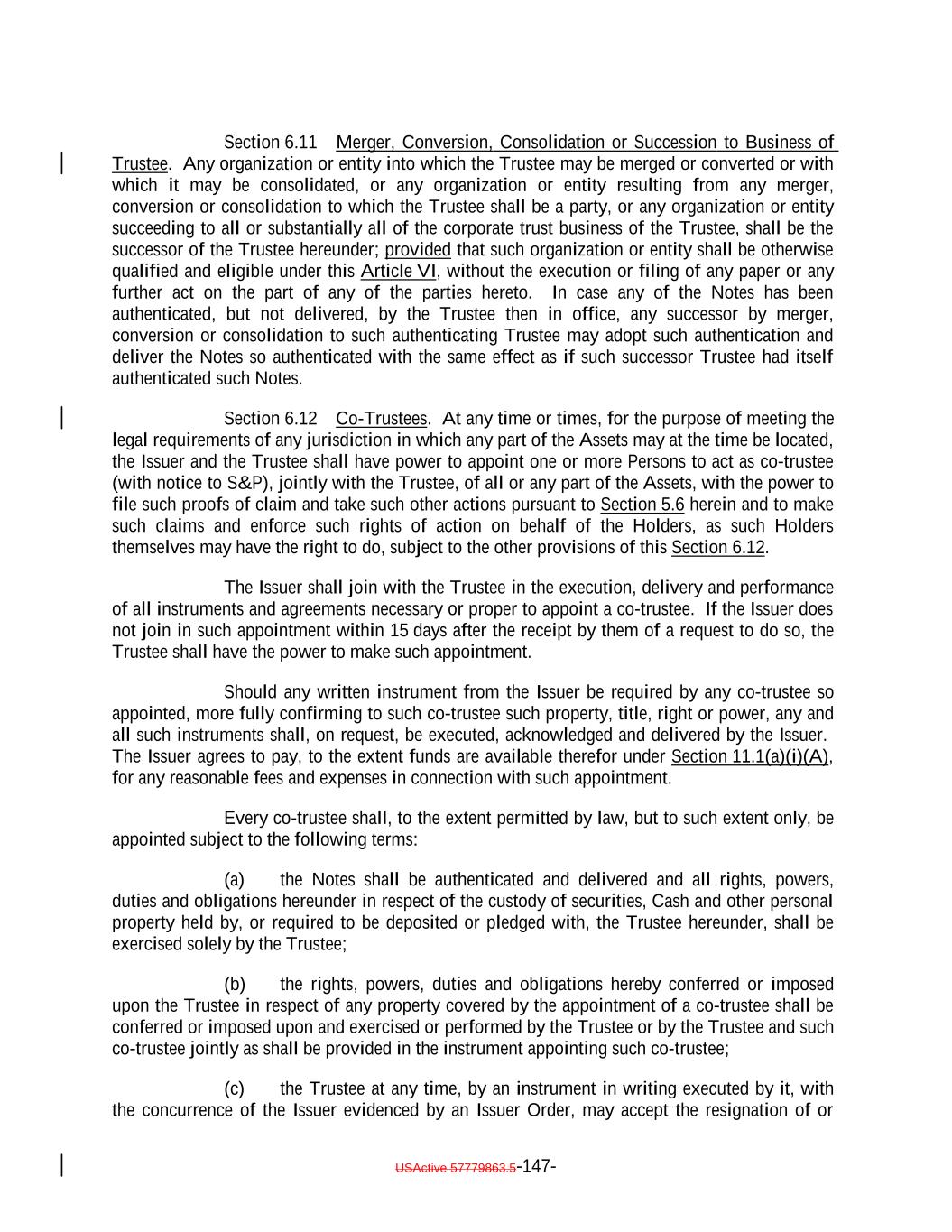 TABLE OF CONTENTS (continued) Page -iii- ARTICLE VI THE TRUSTEE Section 6.1 Certain Duties and Responsibilities. 125121 Section 6.2 Notice of Event of Default. 127123 Section 6.3 Certain Rights of Trustee. 127123 Section 6.4 Not Responsible for Recitals or Issuance of Debt 131127 Section 6.5 May Hold Debt. 131127 Section 6.6 Money Held for the Benefit of the Secured Debtholders. 132128 Section 6.7 Compensation and Reimbursement. 132128 Section 6.8 Corporate Trustee Required; Eligibility. 133129 Section 6.9 Resignation and Removal; Appointment of Successor. 133129 Section 6.10 Acceptance of Appointment by Successor. 135131 Section 6.11 Merger, Conversion, Consolidation or Succession to Business of Trustee. 135131 Section 6.12 Co-Trustees. 136132 Section 6.13 Certain Duties of Trustee Related to Delayed Payment of Proceeds. 137133 Section 6.14 Authenticating Agents. 137133 Section 6.15 Withholding. 138134 Section 6.16 Representative for Debtholders Only; Agent for each other Secured Party. 138134 Section 6.17 Representations and Warranties of the Bank. 138135 ARTICLE VII COVENANTS Section 7.1 Payment of Principal and Interest. 139135 Section 7.2 Maintenance of Office or Agency. 140136 Section 7.3 Money for Debt Payments to be Held for the Benefit of the Holders. 140136 Section 7.4 Existence of the Issuer. 142138 Section 7.5 Protection of Assets. 143139 Section 7.6 Opinions as to Assets. 144140 Section 7.7 Performance of Obligations. 144140 Section 7.8 Negative Covenants. 144140
