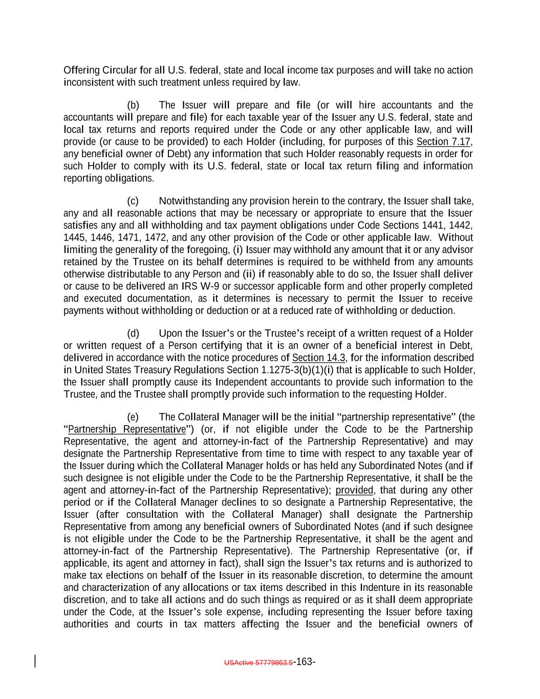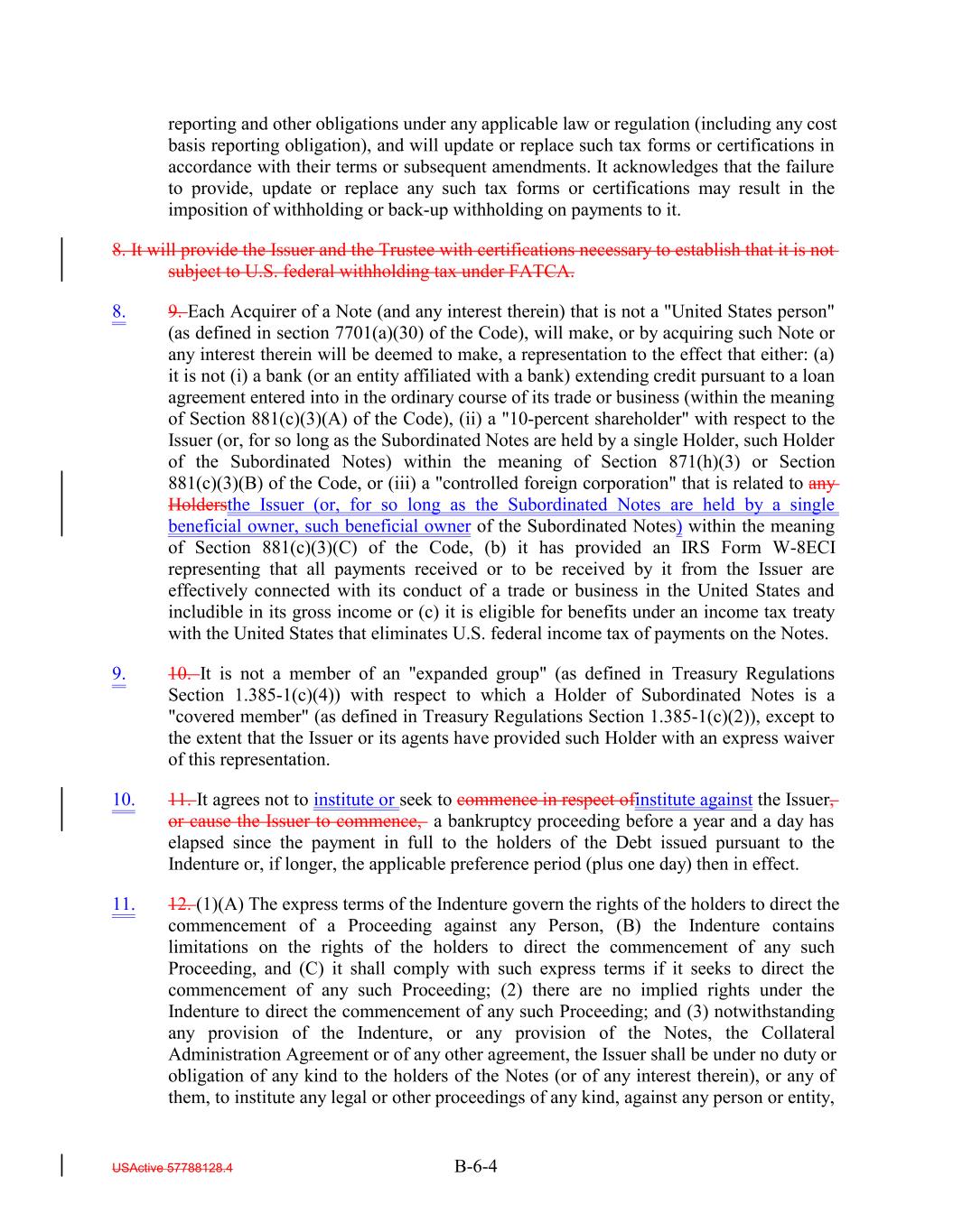 reporting and other obligations under any applicable law or regulation (including any cost basis reporting obligation), and will update or replace such tax forms or certifications in accordance with their terms or subsequent amendments. It acknowledges that the failure to provide, update or replace any such tax forms or certifications may result in the imposition of withholding or back-up withholding on payments to it. 8. It will provide the Issuer and the Trustee with certifications necessary to establish that it is not subject to U.S. federal withholding tax under FATCA. 8. 9. Each Acquirer of a Note (and any interest therein) that is not a "United States person" (as defined in section 7701(a)(30) of the Code), will make, or by acquiring such Note or any interest therein will be deemed to make, a representation to the effect that either: (a) it is not (i) a bank (or an entity affiliated with a bank) extending credit pursuant to a loan agreement entered into in the ordinary course of its trade or business (within the meaning of Section 881(c)(3)(A) of the Code), (ii) a "10-percent shareholder" with respect to the Issuer (or, for so long as the Subordinated Notes are held by a single Holder, such Holder of the Subordinated Notes) within the meaning of Section 871(h)(3) or Section 881(c)(3)(B) of the Code, or (iii) a "controlled foreign corporation" that is related to any Holdersthe Issuer (or, for so long as the Subordinated Notes are held by a single beneficial owner, such beneficial owner of the Subordinated Notes) within the meaning of Section 881(c)(3)(C) of the Code, (b) it has provided an IRS Form W-8ECI representing that all payments received or to be received by it from the Issuer are effectively connected with its conduct of a trade or business in the United States and includible in its gross income or (c) it is eligible for benefits under an income tax treaty with the United States that eliminates U.S. federal income tax of payments on the Notes. 9. 10. It is not a member of an "expanded group" (as defined in Treasury Regulations Section 1.385-1(c)(4)) with respect to which a Holder of Subordinated Notes is a "covered member" (as defined in Treasury Regulations Section 1.385-1(c)(2)), except to the extent that the Issuer or its agents have provided such Holder with an express waiver of this representation. 10. 11. It agrees not to institute or seek to commence in respect ofinstitute against the Issuer, or cause the Issuer to commence, a bankruptcy proceeding before a year and a day has elapsed since the payment in full to the holders of the Debt issued pursuant to the Indenture or, if longer, the applicable preference period (plus one day) then in effect. 11. 12. (1)(A) The express terms of the Indenture govern the rights of the holders to direct the commencement of a Proceeding against any Person, (B) the Indenture contains limitations on the rights of the holders to direct the commencement of any such Proceeding, and (C) it shall comply with such express terms if it seeks to direct the commencement of any such Proceeding; (2) there are no implied rights under the Indenture to direct the commencement of any such Proceeding; and (3) notwithstanding any provision of the Indenture, or any provision of the Notes, the Collateral Administration Agreement or of any other agreement, the Issuer shall be under no duty or obligation of any kind to the holders of the Notes (or of any interest therein), or any of them, to institute any legal or other proceedings of any kind, against any person or entity, USActive 57788128.4 B-6-4
