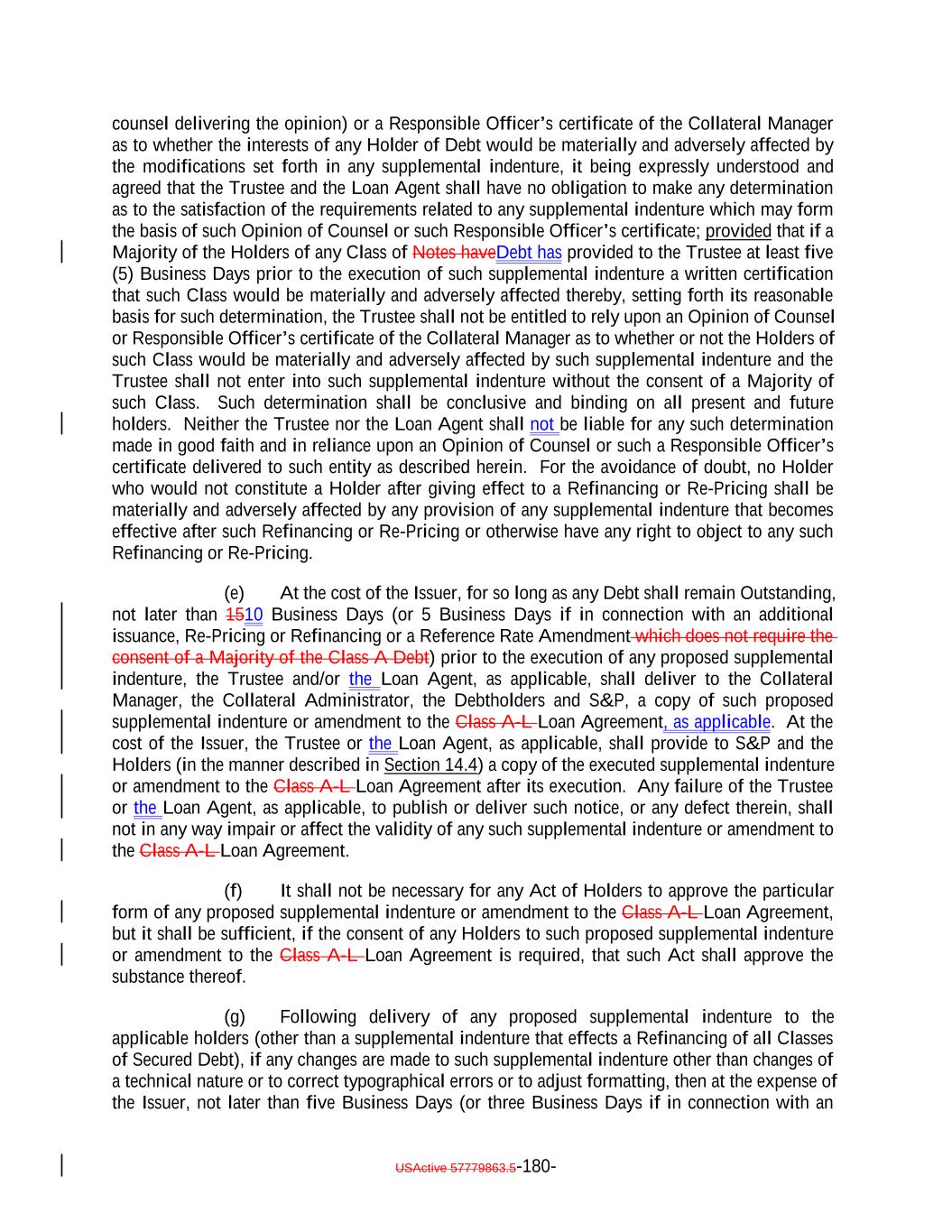 - 4 - its organizational documents, any indenture or other agreement or instrument to which it is a party or by which it is bound, or any order of any court or administrative agency entered in any Proceeding to which it is a party or by which it may be bound or to which it may be subject; that all conditions precedent provided in the Original Indenture and this Supplemental Indenture relating to the authentication and delivery of the Replacement Debt applied for by it have been complied with; that all expenses due or accrued with respect to the offering of the Replacement Debt or relating to actions taken on or in connection with the Refinancing Date have been paid or reserves therefor have been made; and, with respect to the Issuer, that all of its representations and warranties contained in the Original Indenture are true and correct as of the Refinancing Date. (v) a letter signed by each Rating Agency confirming that the Class X Notes are rated “AAA (sf)” by S&P, the Class A-R Notes are rated “AAA (sf)” by S&P, the Class A-L-R Loans are rated “AAA (sf)” by S&P and the Class B-R Notes are rated at least “AA (sf)” by S&P; and (vi) an Issuer Order by the Issuer directing the Trustee to authenticate the Replacement Debt in the amounts and names set forth therein and to apply the proceeds thereof to redeem the Redeemed Debt issued or incurred on the Closing Date at the applicable Redemption Prices therefor on the Refinancing Date. 4. Consents and Waivers. (a) Consent of the Holders of the Replacement Debt. Each Holder or beneficial owner of any Replacement Debt, by its acquisition thereof on the Refinancing Date, shall be deemed to agree to the terms of and the execution of the parties thereto, as applicable, of the Indenture including the amendments set forth in this Supplemental Indenture, the Loan Agreement, the Collateral Management Agreement, the Collateral Administration Agreement, the EU/UK Retention Agreement, and any other amendments to the Transaction Documents entered into on the Refinancing Date. (b) Consent of the Collateral Manager. The Collateral Manager hereby consents to the amendments set forth in this Supplemental Indenture, the Loan Agreement, the Collateral Management Agreement, the Collateral Administration Agreement, the EU/UK Retention Agreement, and any other amendments to the Transaction Documents entered into on the Refinancing Date. (c) Consent and Waiver of the Holder of the Subordinated Notes. The undersigned Holder of all of the Subordinated Notes hereby (i) consents to the amendments set forth in this Supplemental Indenture, the Loan Agreement, the Collateral Management Agreement, the Collateral Administration Agreement, the EU/UK Retention Agreement, and any other amendments to the Transaction Documents entered into on the Refinancing Date and (ii) waives any notice of supplemental indenture required pursuant to section 8.3(e) of the Original Indenture. (d) Consent of the Retention Holder. The Retention Holder hereby consents to the amendments set forth in this Supplemental Indenture.
