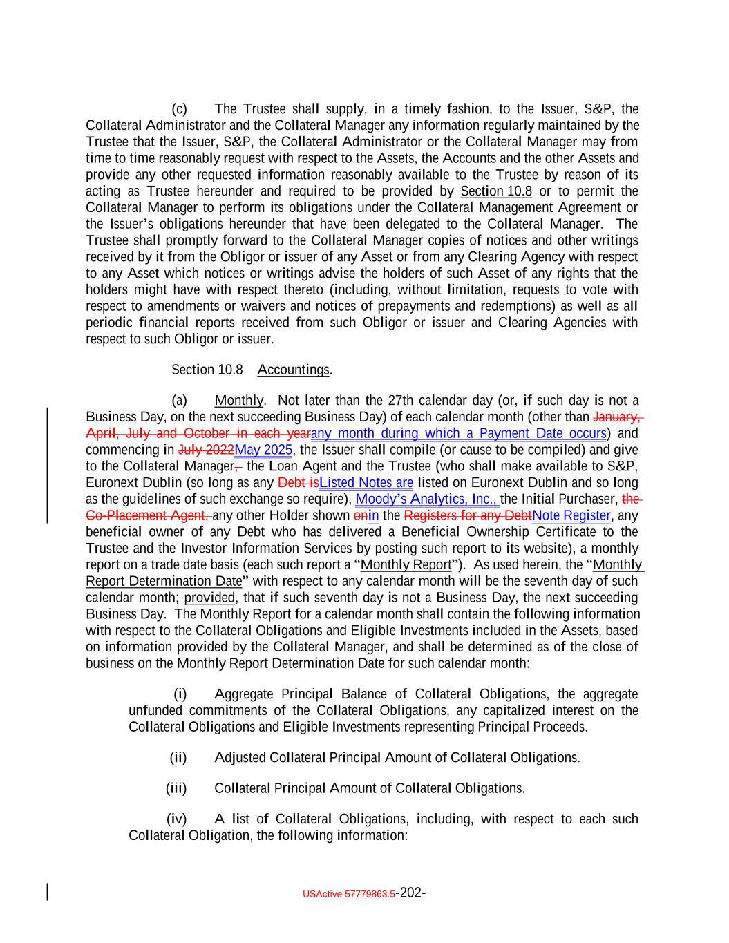than a Payment Date, only to the extent that such Interest Proceeds would be available under the Priority of Payments to pay accrued and unpaid interest on such Class on the next Payment Date, taking into account scheduled distributions on the Assets that are expected to be received prior to the next Determination Date). “Participation Interest”: A participation interest in a loan that, at the time of acquisition, or the Issuer’s commitment to acquire the same, satisfies each of the following criteria: (i) such loan would constitute a Collateral Obligation were it acquired directly, (ii) the Selling Institution is the lender on the loan, (iii) the aggregate participation in the loan does not exceed the principal amount or commitment of such loan, (iv) such participation does not grant, in the aggregate, to the participant in such participation a greater interest than the Selling Institution holds in the loan or commitment that is the subject of the participation, (v) the entire purchase price for such participation is paid in full at the time of its acquisition (or, in the case of a participation in a Revolving Collateral Obligation or Delayed Drawdown Collateral Obligation, at the time of the funding of such loan) without the benefit of financing from the Selling Institution or its affiliates, (vi) the participation provides the participant all of the economic benefit and risk of the whole or part of the loan or commitment that is the subject of the loan participation, and (vii) such participation is documented under a LSTA, Loan Market Association or similar agreement standard for loan participation transactions among institutional market participants. For the avoidance of doubt, a Participation Interest shall not include a sub-participation interest in any loan. “Partnership Tax Audit Rules”: The meaning specified in Section 7.17(m). “Partnership Representative”: The meaning specified in Section 7.17(f). “Paying Agent”: Any Person authorized by the Issuer to pay the principal of or interest on any Debt on behalf of the Issuer as specified in Section 7.2. “Payment Account”: The payment account of the Trustee established pursuant to Section 10.3(a). “Payment Date”: (a) The 20th day of January, April, July and October of each year (or, if such day is not a Business Day, then the next succeeding Business Day), commencing on the Payment Date in October 2022July 2025, except that the final scheduled Payment Date (subject to any earlier redemption or payment of the Debt) shall be the Payment Date in April 20342038, and (b) any other date not specified in clause (a) that is a Redemption Date in connection with a redemption of the Secured Debt in whole but not in part; provided that, at any time there is no Secured Debt Outstanding, Payment Dates shall be on such dates as determined by the Collateral Manager in its reasonable discretion (as acceptable to the Trustee and with five Business Days’ prior written notice to the Trustee but in no event less frequently than quarterly). “PBGC”: The United States Pension Benefit Guaranty Corporation. “Permitted Deferrable Obligation”: Any Deferrable Obligation that (or the, in accordance with its related Underlying Document of which)Documents, carries a current cash pay interest rate of not less than (a) in the case of a Floating Rate Obligation, the Reference Rate USActive 57779863.5-57-