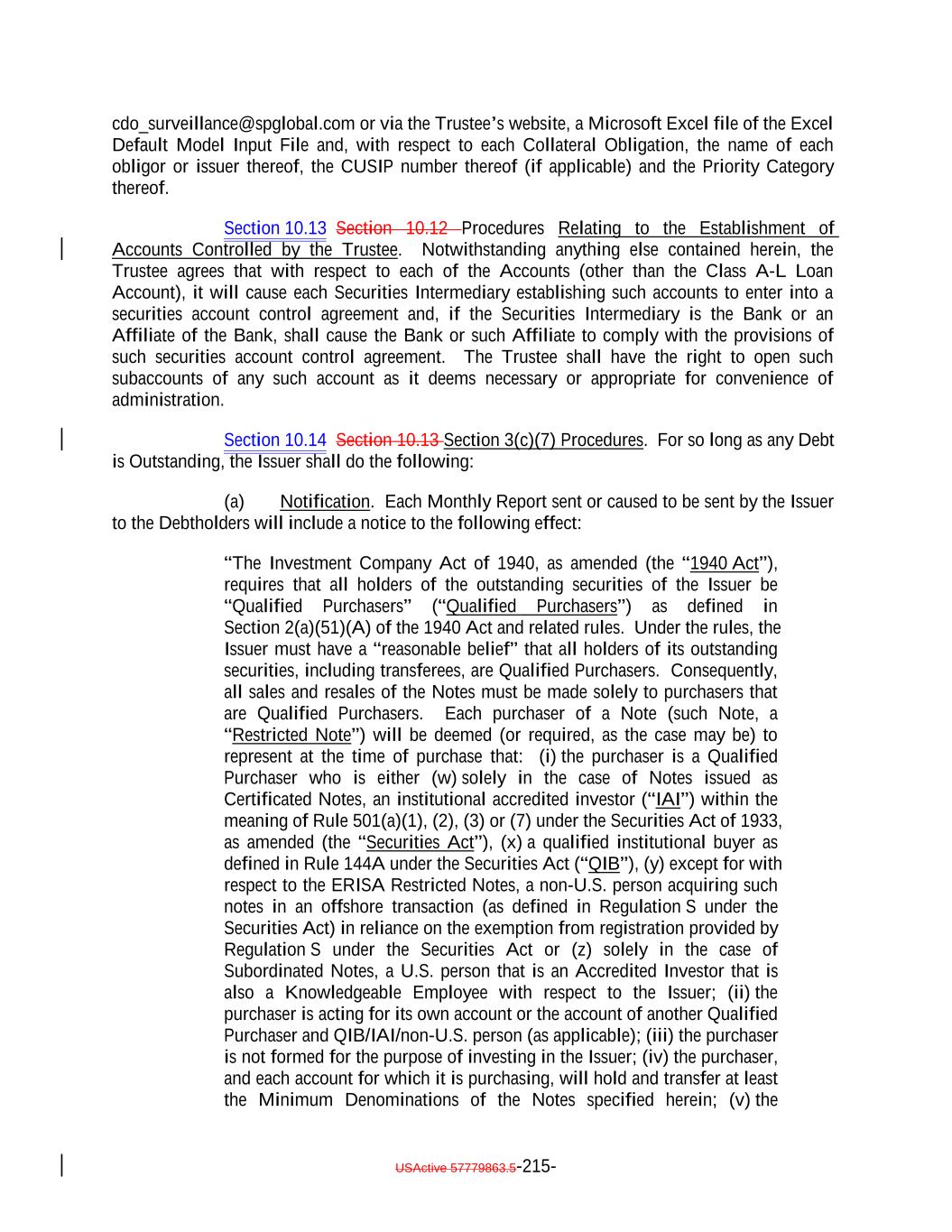 “1940 Act”: The Investment Company Act of 1940, as amended from time to time. “25% Limitation”: The meaning specified in Section 2.5(cb). “Accountants’ Effective Date Comparison AUP Report”: The meaning specified in Section 7.18(c). “Accountants’ Effective Date Recalculation AUP Report”: The meaning specified in Section 7.18(c). “Accountants’ Report”: A certificate of the firm or firms appointed by the Issuer pursuant to Section 10.1010.11(a). “Accounts”: (i) The Payment Account, (ii) the Collection Account, (iii) the Ramp-UpRamp-Up Account, (iv) the Revolver Funding Account, (v) the Custodial Account, (vi) the Expense Reserve Account, (vii) the Interest Reserve Account, (viii) the Permitted Use Account and (ixviii) the Class A-L Loan Account. “Accredited Investor”: The meaning specified in Rule 501(a) under the Securities Act. “Act”: The meaning specified in Section 14.2. “Adjusted Class Break-even Default Rate”: The rate equal to (a)(i) the Class Break-even Default Rate multiplied by (ii)(x) the Target Initial Par Amount divided by (y) the S&P Collateral Principal Amount plus (b)(i)(x) the S&P Collateral Principal Amount minus (y) the Target Initial Par Amount, divided by (ii)(x) the S&P Collateral Principal Amount multiplied by (y) 1 minus the Weighted Average S&P Recovery Rate. “Adjusted Collateral Principal Amount”: As of any date of determination: (a) the Aggregate Principal Balance of the Collateral Obligations (other than Defaulted Obligations, Deferring Obligations (other than Permitted Deferrable Obligations),, Discount Obligations and Long Dated Obligations), plus (b) without duplication, the amounts on deposit in the Collection Account and the Ramp-UpRamp-Up Account (in each case, including Eligible Investments therein) representing Principal Proceeds, plus (c) the aggregate of the Defaulted Obligation Balances for each Defaulted Obligation (except for Deferring Obligations), plus (d) the aggregate of the purchase prices for each Discount Obligation, excluding accrued interest, expressed as a percentage of par and multiplied by the Principal Balance thereof, for such Discount Obligation, plus USActive 57779863.5-3-