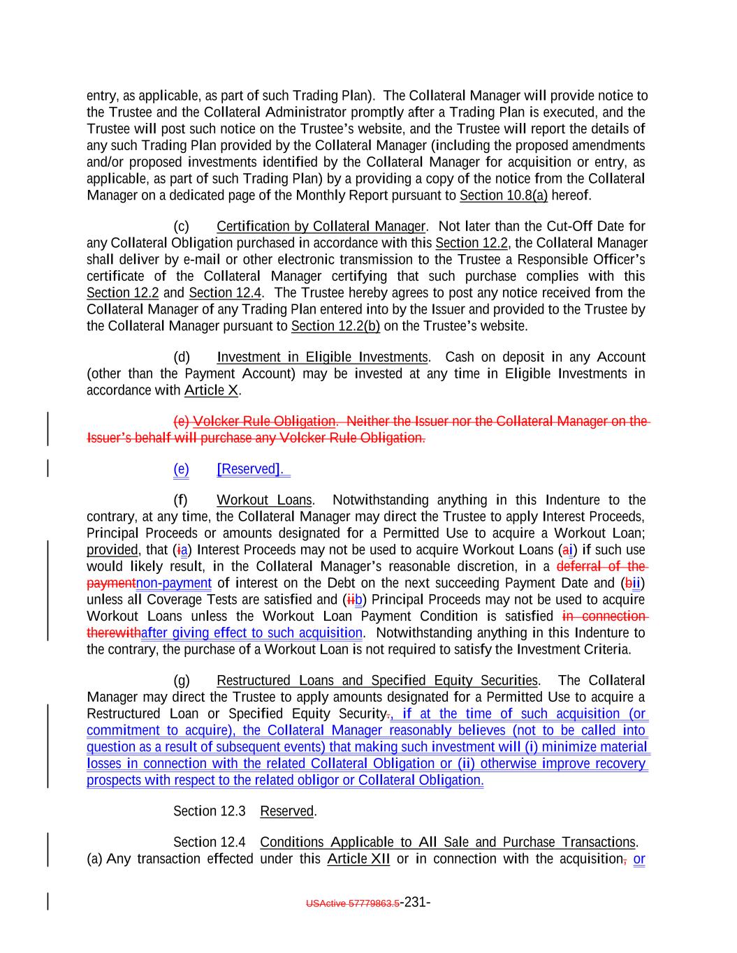“Cov-Lite Loan”: A Senior Secured Loan the Underlying Documents for which do not (i) contain any financial covenants or (ii) require the borrower thereunder to comply with any Maintenance Covenant (regardless of whether compliance with one or more Incurrence Covenants is otherwise required by such Underlying Documents); provided that, for all purposes other than the determination of the S&P Recovery Rate for such Collateral Obligation, a loan which either contains a cross-default or cross-acceleration provision to, or is pari passu with, another loan or debt obligation of the underlying Obligor that requires the underlying Obligor to comply with a Maintenance Covenant will be deemed not to be a Cov-Lite Loan. For the avoidance of doubt, for all purposes other than determining an S&P Recovery Rate, a Senior Secured Loan that is capable of satisfying the foregoing definition (not including the proviso thereto) only (x) until the expiration of a certain period of time after the initial issuance thereof or (y) for so long as there is no funded balance in respect thereof, in each case as set forth in the related Underlying Documents, shall be deemed not to be a Cov-Lite Loan. “Coverage Tests”: The Overcollateralization Ratio Test and the Interest Coverage Test, each as applied to each specified Class or Classes of Secured Debt. (other than the Class X Notes). No Coverage Tests will be applicable to the Class X Notes. “Covered Audit Adjustment”: The meaning specified in Section 7.17(m). “Credit Amendment”: The meaning specified in Section 7.20. “Credit Improved Criteria”: The criteria that will be met if, with respect to any Collateral Obligation, any of the following occur: (a) such Collateral Obligation has experienced a reduction in its credit spread of 10% or more compared to the credit spread in effect as of the Cut-Off Date for such Collateral Obligation, such reduction in spread being determined by reference to an Eligible Loan Index; or (b) such Collateral Obligation has a Market Value above the higher of (i) par and (ii) the initial purchase price paid by the Issuer for such Collateral Obligation. “Credit Improved Obligation”: Any Collateral Obligation, which in the Collateral Manager’s reasonable commercial judgment (which judgment shall not be called into question as a result of subsequent events), has significantly improved in credit quality after it was acquired by the Issuer, which may (but need not) be based on one or more of the Credit Improved Criteria; provided that, if a Restricted Trading Period is in effect, (i) such Collateral Obligation satisfies at least one of the Credit Improved Criteria or (ii) the Collateral Manager must obtain the consent of a Majority of the Controlling Class. “Credit Risk Criteria”: The criteria that will be met if, with respect to any Collateral Obligation, any of the following occur: (a) the spread over the Reference Rate or other Eligible Loan Index for such Collateral Obligation has been increased since the date of purchase by the Issuer by (A) 0.25% or more (in the case of a Collateral Obligation with a spread over the USActive 57779863.5-23-