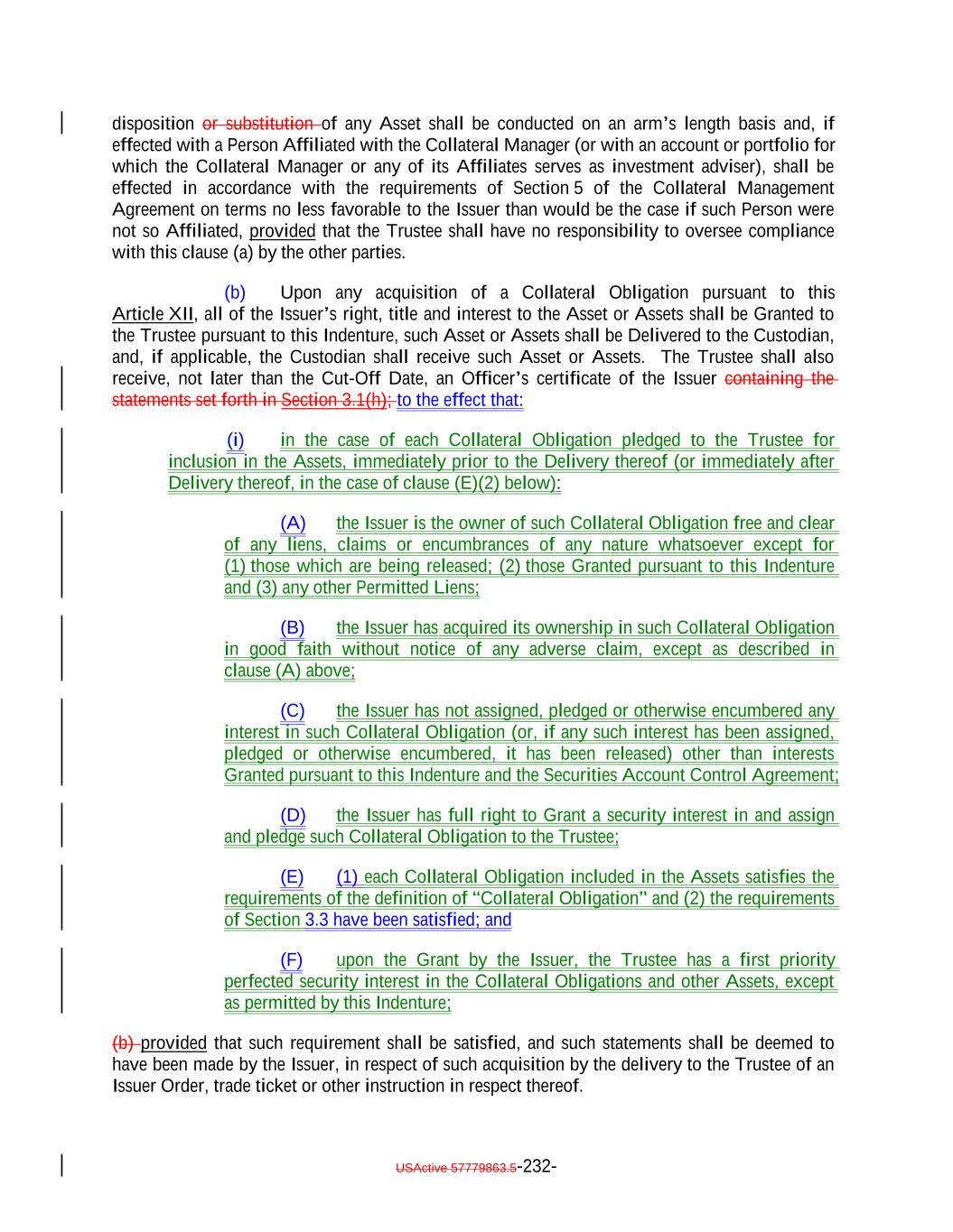 (xii) will not require the Issuer or the pool of Assets to be registered as an investment company under the 1940 Act; (xiii) is not an Equity Security or by its terms convertible into or exchangeable for an Equity Security; (xiv) is not the subject of an Offer of exchange, or tender by its Obligor, for cash, securities or any other type of consideration other than a Permitted Offer; (xv) does not have an S&P Rating that is below “CCC-”; (xvi) does not have an “f,” “p,” “pi,” “sf” or “t” subscript assigned by S&P or an “sf” subscript assigned by any other NRSRO; (xvii) does not mature after the earliest Stated Maturity of the Debt; (xviii) other than in the case of a Fixed Rate Obligation, accrues interest at a floating rate determined by reference to (a) the Dollar prime rate, federal funds rate, LIBOR or SOFR or (b) a similar interbank offered rate, commercial deposit rate or any other index in respect of which the S&P Rating Condition is satisfied; (xix) if it is a “registration-required obligation” within the meaning of the Code, is Registered; (xx) is not a Synthetic Security; (xxi) does not pay interest less frequently than semi-annually; (xxii) is not a letter of credit and does not support a letter of credit; (xxiii) is not an interest in a grantor trust; (xxiv) is purchased at a price at least equal to 65% of its outstanding principal balance; (xxv) is not issued by an Obligor Domiciled in Cyprus, Greece, Iceland, Ireland, Italy, Liechtenstein, Portugal or, Russia, Spain or Ukraine; (xxvi) is issued by a Non-Emerging Market Obligor Domiciled in the United States, Canada, a Group I Country, a Group II Country, or a Group III Country; (xxvii) if it is a Participation Interest, the Third Party Credit Exposure Limits are satisfied with respect to the acquisition thereof; (xxviii) is not an obligation of a Portfolio Company; (xxix) does not have attached equity warrants; USActive 57779863.5-17-