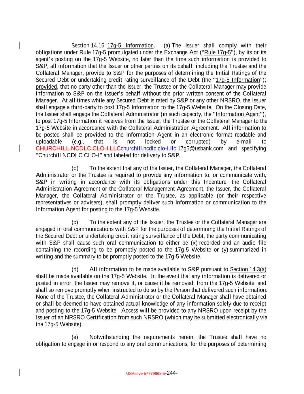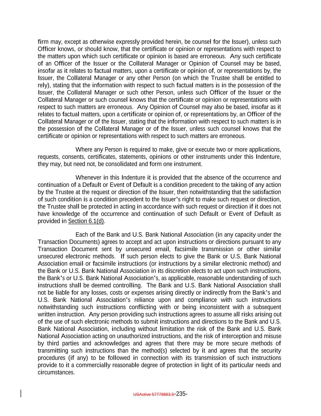 WITHOUT RELIANCE UPON, OR USE OF, IN ANY MANNER WHATSOEVER THE INFORMATION IN THE SECTION TITLED "CREDIT RISK RETENTION" IN THE FINAL OFFERING CIRCULAR; AND (E) IT UNDERSTANDS THAT EACH OF THE ISSUER AND COLLATERAL MANAGER IS RELYING ON THE FOREGOING AS A MATERIAL INDUCEMENT TO ENTER THIS TRANSACTION AND OTHERWISE WOULD NOT ENGAGE IN THIS TRANSACTION. USActive 57788128.4 A-43-4