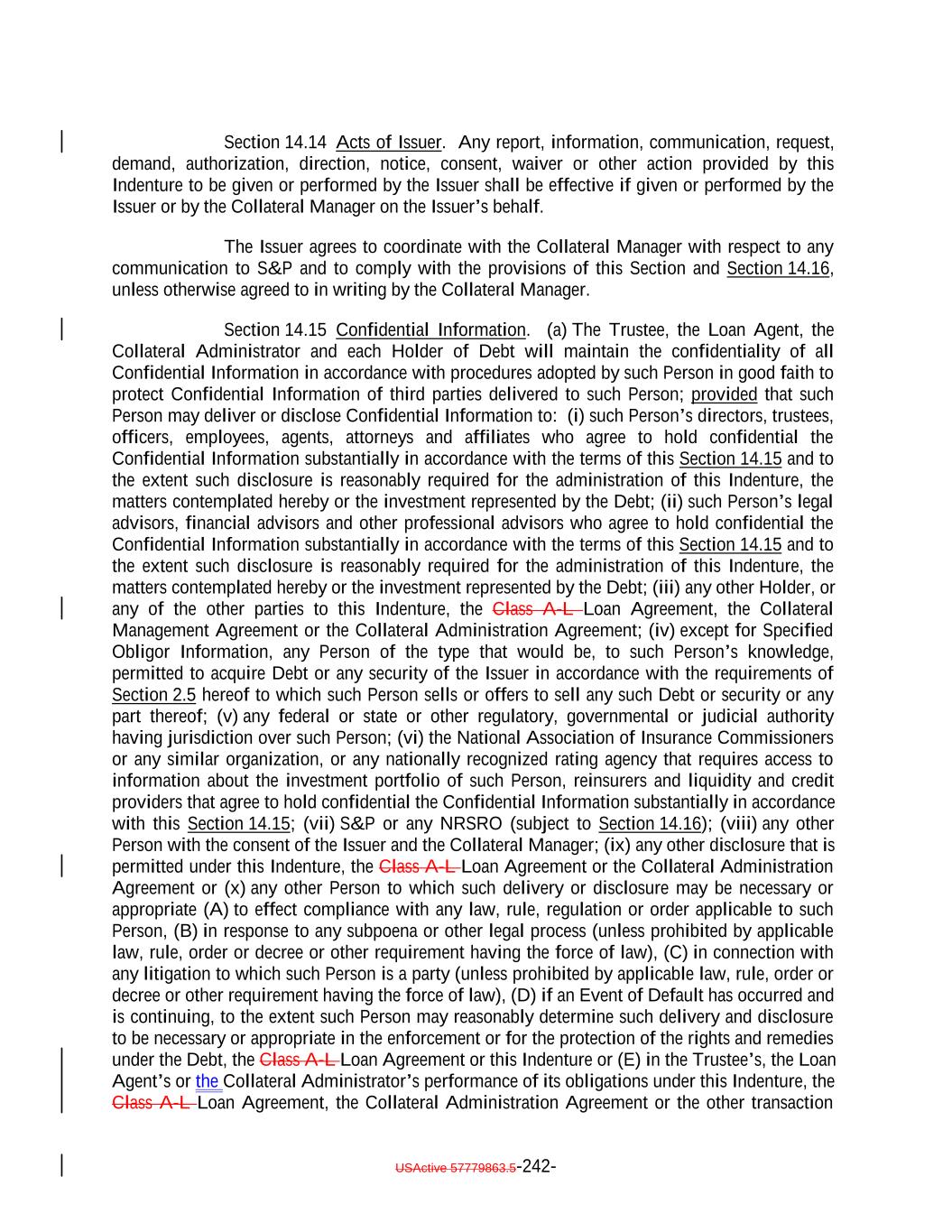 In consideration of the physical or electronic signature hereof by the beneficial owner, the Issuer, the Trustee, the Loan Agent, the Collateral Manager, or their respective agents may from time to time communicate or transmit to the beneficial owner (a) information upon the request of the beneficial owner pursuant to the Indenture and (b) other information or communications marked or otherwise identified as confidential (collectively, but subject to the following sentence, "Confidential Information"). Confidential Information relating to the Issuer shall not include, however, any information that (i) was publicly known or otherwise known to the beneficial owner prior to the time of such communication or transmission; (ii) subsequently becomes publicly known through no act or omission by the beneficial owner or any Person acting on behalf of beneficial owner; (iii) otherwise is known or becomes known to the beneficial owner other than (x) through disclosure by the Issuer or (y) to the knowledge of the beneficial owner after reasonable inquiry, as a result of the breach of a fiduciary duty to the Issuer or a contractual duty to the Issuer; or (iv) is allowed to be treated as non-confidential by consent of the Issuer. The beneficial owner will maintain the confidentiality of all Confidential Information in accordance with procedures adopted by the beneficial owner in good faith to protect Confidential Information of third parties delivered to the beneficial owner; provided that the beneficial owner may deliver or disclose Confidential Information to: (i) its directors, trustees, officers, employees, agents, attorneys and affiliates who agree to hold confidential the Confidential Information substantially in accordance with these terms and to the extent such disclosure is reasonably required for the administration of the matters contemplated hereby or the investment represented by the Debt; (ii) its legal advisors, financial advisors and other professional advisors who agree to hold confidential the Confidential Information substantially in accordance with these terms and to the extent such disclosure is reasonably required for the matters contemplated hereby or the investment represented by the Debt; (iii) any other Holder, or any of the other parties to the Indenture, the Class A-L Loan Agreement or the Collateral Management Agreement; (iv) except for Specified Obligor Information, any Person of the type that would be, to such Person's knowledge, permitted to acquire Debt or any other security of the Issuer in accordance with the requirements of Section 2.5 of the Indenture to which such Person sells or offers to sell any such Note or security or any part thereof; (v) any federal or state or other regulatory, governmental or judicial authority having jurisdiction over such Person; (vi) the National Association of Insurance Commissioners or any similar organization, or any nationally recognized rating agency that requires access to information about the investment portfolio of such Person, reinsurers and liquidity and credit providers that agree to hold confidential the Confidential Information substantially in accordance with these provisions; (vii) S&P or any NRSRO (subject to Section 14.16 of the Indenture); (viii) any other Person with the consent of the Issuer and the Collateral Manager; or (ix) any other Person to which such delivery or disclosure may be necessary or appropriate (A) to effect compliance with any law, rule, regulation or order applicable to such Person, (B) in response to any subpoena or other legal process (unless prohibited by applicable law, rule, order or decree or other requirement having the force of law), (C) in connection with any litigation to which such Person is a party (unless prohibited by applicable law, rule, order or decree or other requirement having the force of law) or (D) if an Event of Default has occurred and is continuing, to the extent such Person may reasonably determine such delivery and disclosure to be necessary or appropriate in the enforcement or for the protection of the rights and remedies under the Debt, the Class A-L Loan USActive 57788128.4D-2