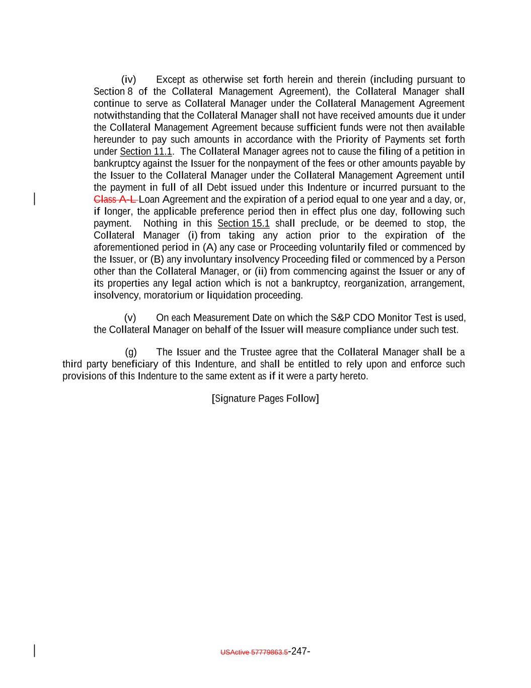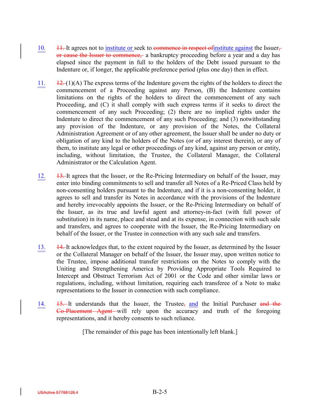 10. 11. It agrees not to institute or seek to commence in respect ofinstitute against the Issuer, or cause the Issuer to commence, a bankruptcy proceeding before a year and a day has elapsed since the payment in full to the holders of the Debt issued pursuant to the Indenture or, if longer, the applicable preference period (plus one day) then in effect. 11. 12. (1)(A) The express terms of the Indenture govern the rights of the holders to direct the commencement of a Proceeding against any Person, (B) the Indenture contains limitations on the rights of the holders to direct the commencement of any such Proceeding, and (C) it shall comply with such express terms if it seeks to direct the commencement of any such Proceeding; (2) there are no implied rights under the Indenture to direct the commencement of any such Proceeding; and (3) notwithstanding any provision of the Indenture, or any provision of the Notes, the Collateral Administration Agreement or of any other agreement, the Issuer shall be under no duty or obligation of any kind to the holders of the Notes (or of any interest therein), or any of them, to institute any legal or other proceedings of any kind, against any person or entity, including, without limitation, the Trustee, the Collateral Manager, the Collateral Administrator or the Calculation Agent. 12. 13. It agrees that the Issuer, or the Re-Pricing Intermediary on behalf of the Issuer, may enter into binding commitments to sell and transfer all Notes of a Re-Priced Class held by non-consenting holders pursuant to the Indenture, and if it is a non-consenting holder, it agrees to sell and transfer its Notes in accordance with the provisions of the Indenture and hereby irrevocably appoints the Issuer, or the Re-Pricing Intermediary on behalf of the Issuer, as its true and lawful agent and attorney-in-fact (with full power of substitution) in its name, place and stead and at its expense, in connection with such sale and transfers, and agrees to cooperate with the Issuer, the Re-Pricing Intermediary on behalf of the Issuer, or the Trustee in connection with any such sale and transfers. 13. 14. It acknowledges that, to the extent required by the Issuer, as determined by the Issuer or the Collateral Manager on behalf of the Issuer, the Issuer may, upon written notice to the Trustee, impose additional transfer restrictions on the Notes to comply with the Uniting and Strengthening America by Providing Appropriate Tools Required to Intercept and Obstruct Terrorism Act of 2001 or the Code and other similar laws or regulations, including, without limitation, requiring each transferee of a Note to make representations to the Issuer in connection with such compliance. 14. 15. It understands that the Issuer, the Trustee, and the Initial Purchaser and the Co-Placement Agent will rely upon the accuracy and truth of the foregoing representations, and it hereby consents to such reliance. [The remainder of this page has been intentionally left blank.] USActive 57788128.4 B-2-5