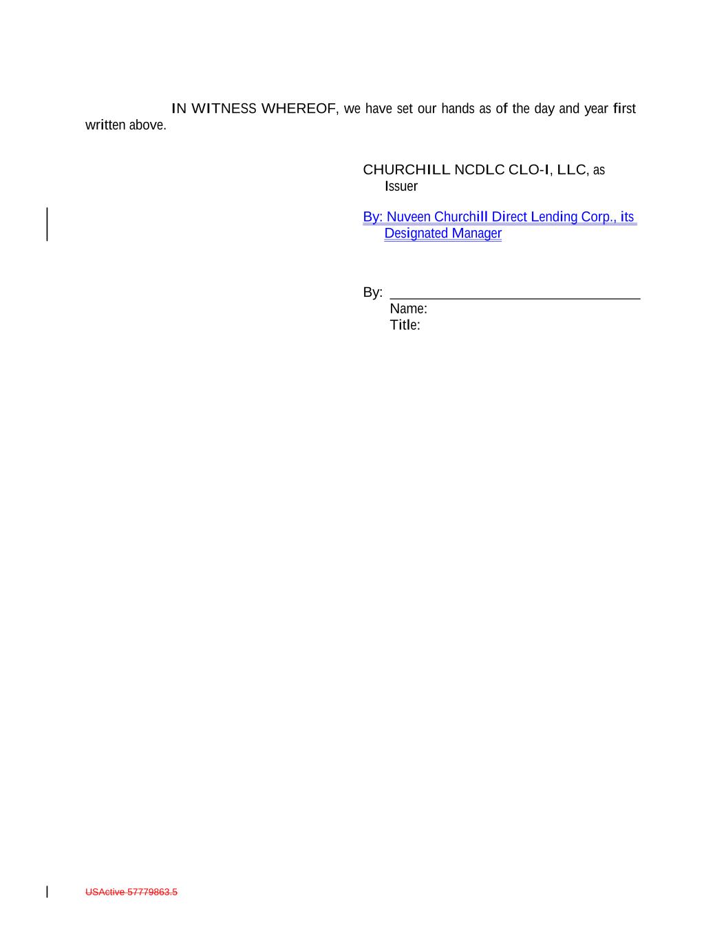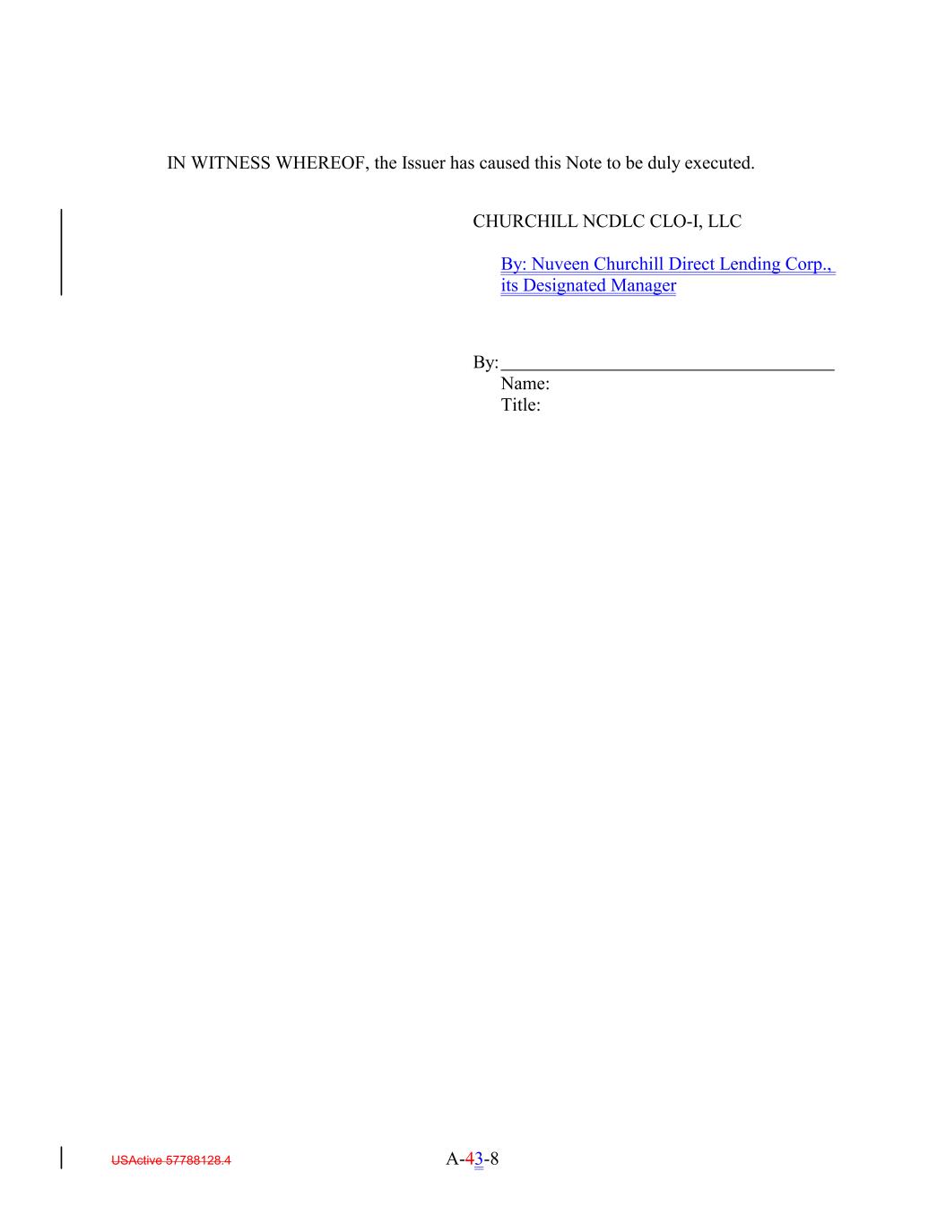 IN WITNESS WHEREOF, the Issuer has caused this Note to be duly executed. CHURCHILL NCDLC CLO-I, LLC By: Nuveen Churchill Direct Lending Corp., its Designated Manager By: Name: Title: USActive 57788128.4 A-43-8