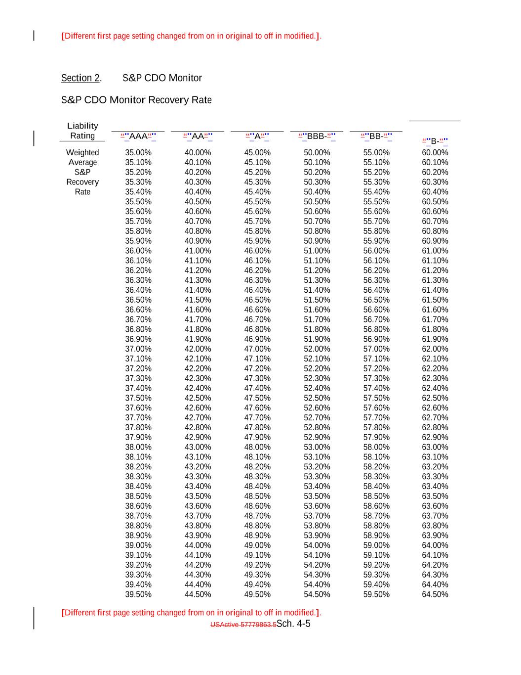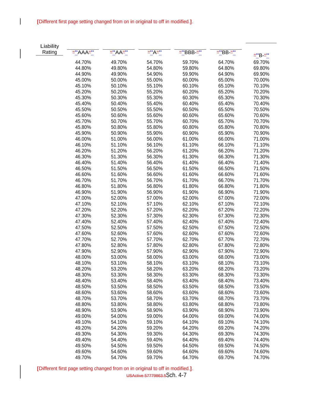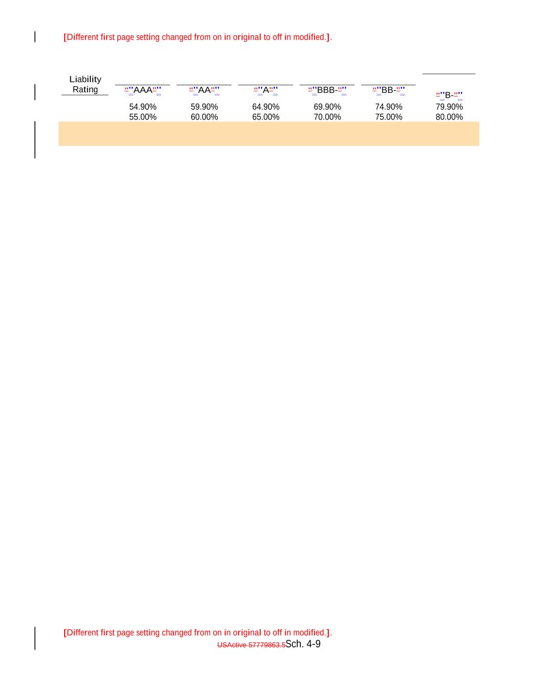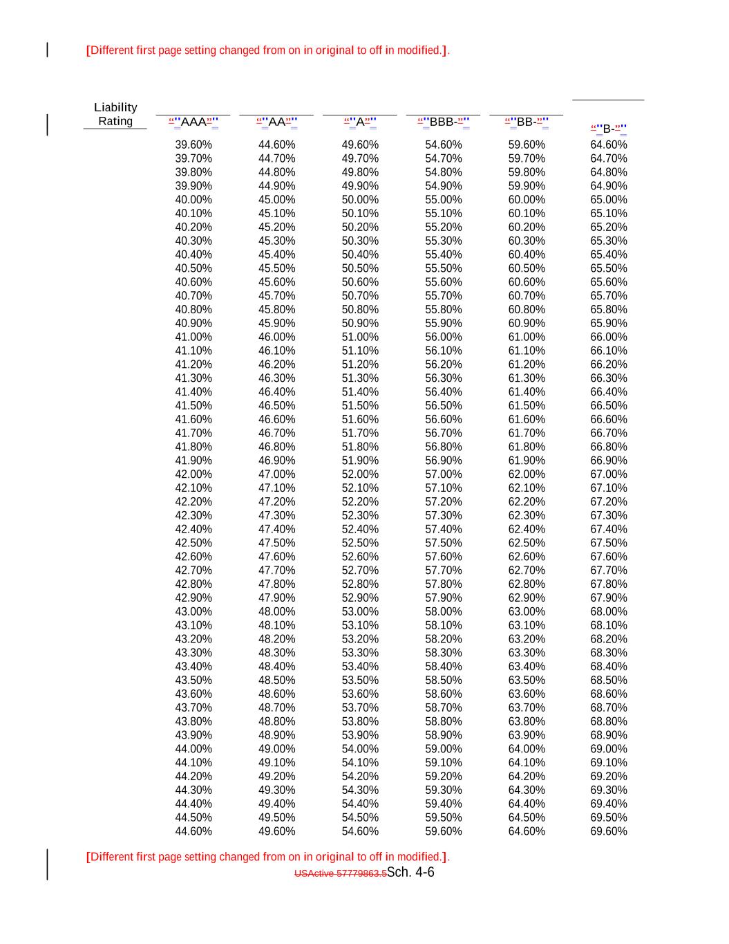 [Different first page setting changed from on in original to off in modified.]. [Different first page setting changed from on in original to off in modified.]. USActive 57779863.5Sch. 4-9 “"AA”" 65.00% 70.00% 75.00% 54.90% 80.00% “"A”" 59.90% Liability Rating 64.90% “"BBB-”" 69.90% 74.90% “"BB-”" 79.90% “"AAA”" “"B-”" 55.00% 60.00%