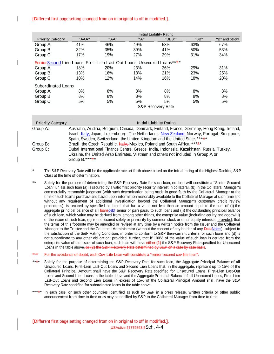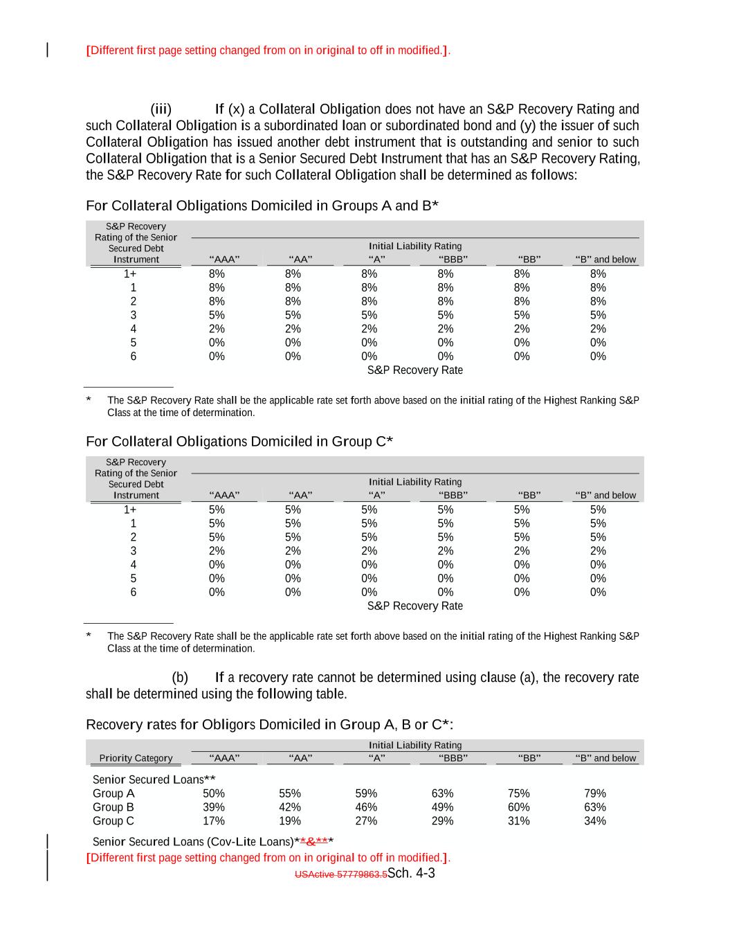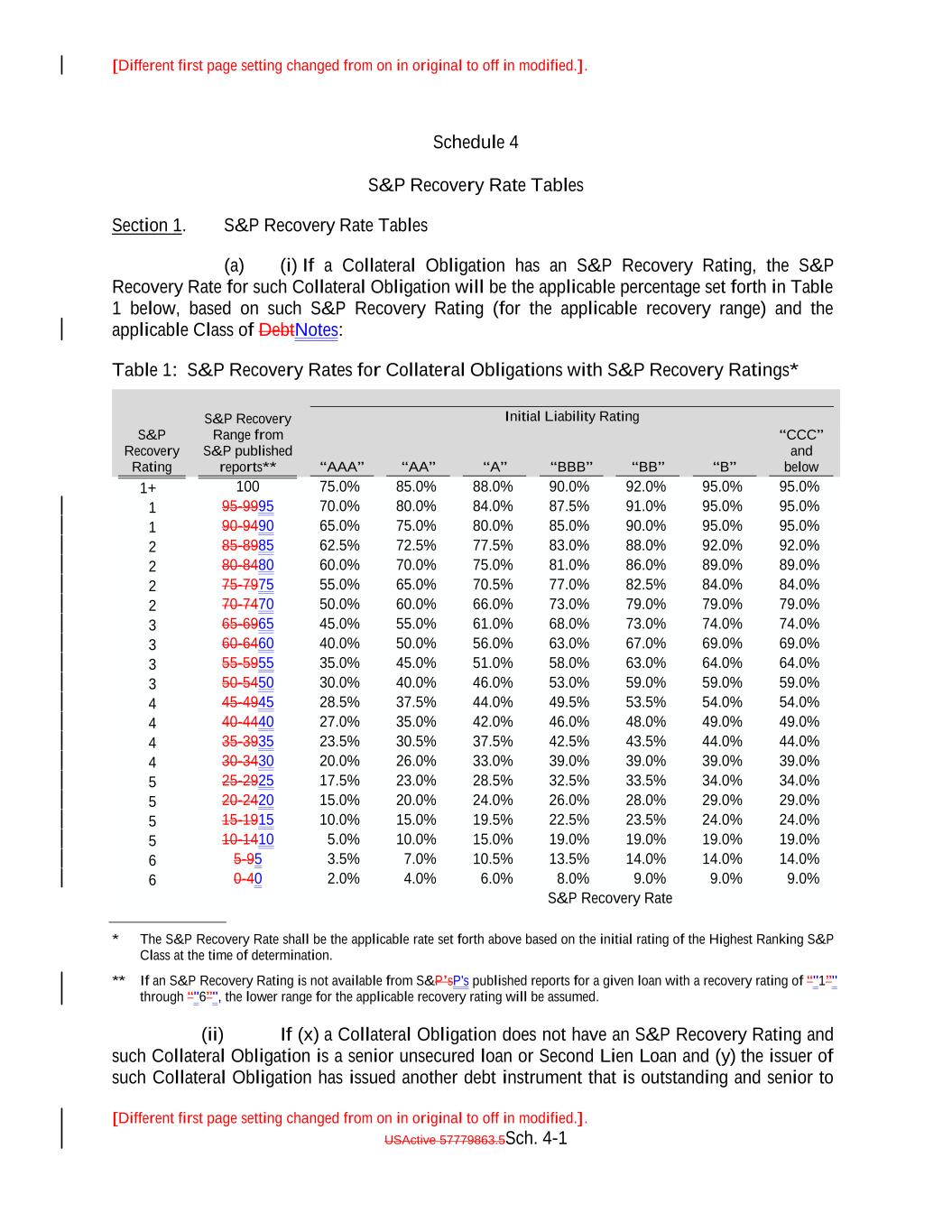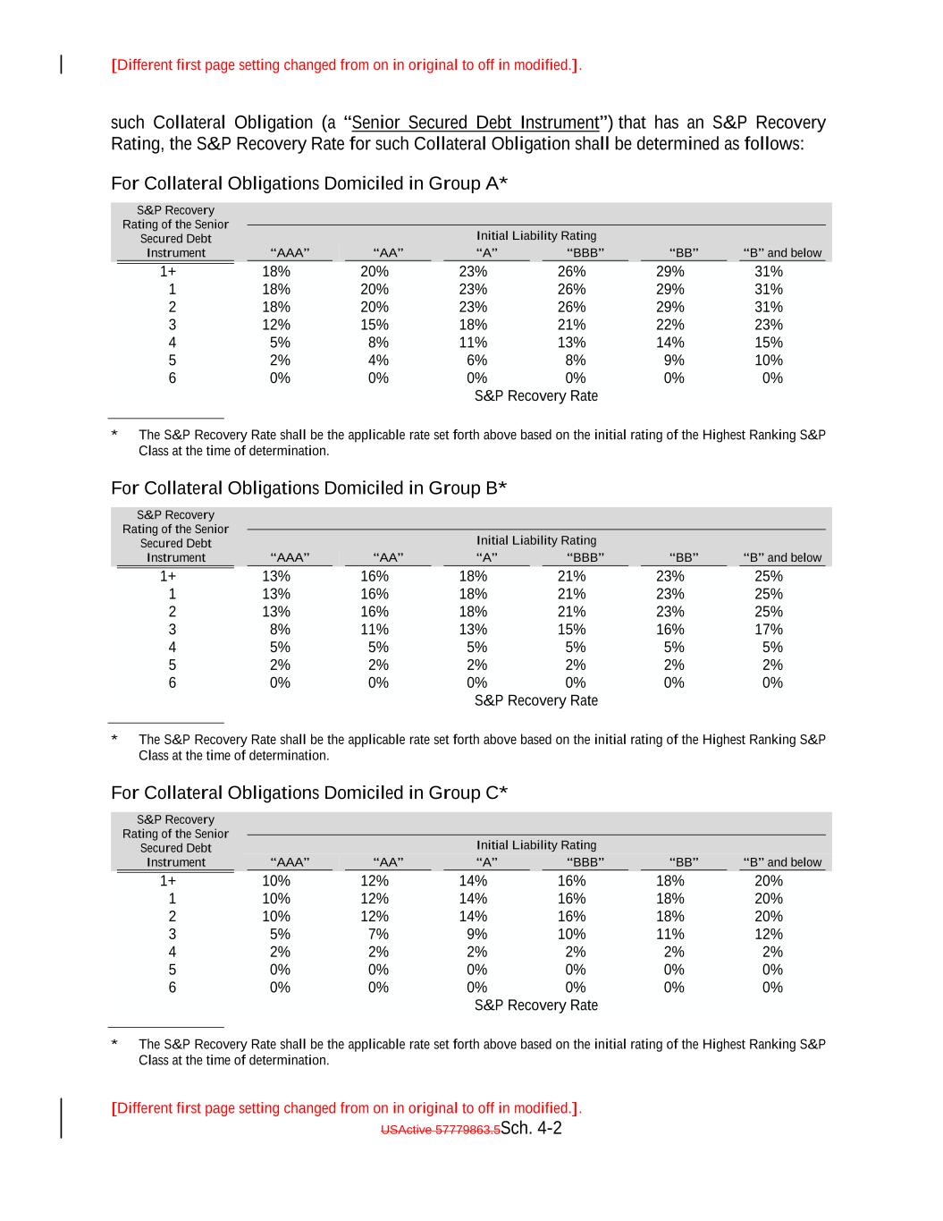 [Different first page setting changed from on in original to off in modified.]. [Different first page setting changed from on in original to off in modified.]. USActive 57779863.5Sch. 4-9 “"AA”" 65.00% 70.00% 75.00% 54.90% 80.00% “"A”" 59.90% Liability Rating 64.90% “"BBB-”" 69.90% 74.90% “"BB-”" 79.90% “"AAA”" “"B-”" 55.00% 60.00%