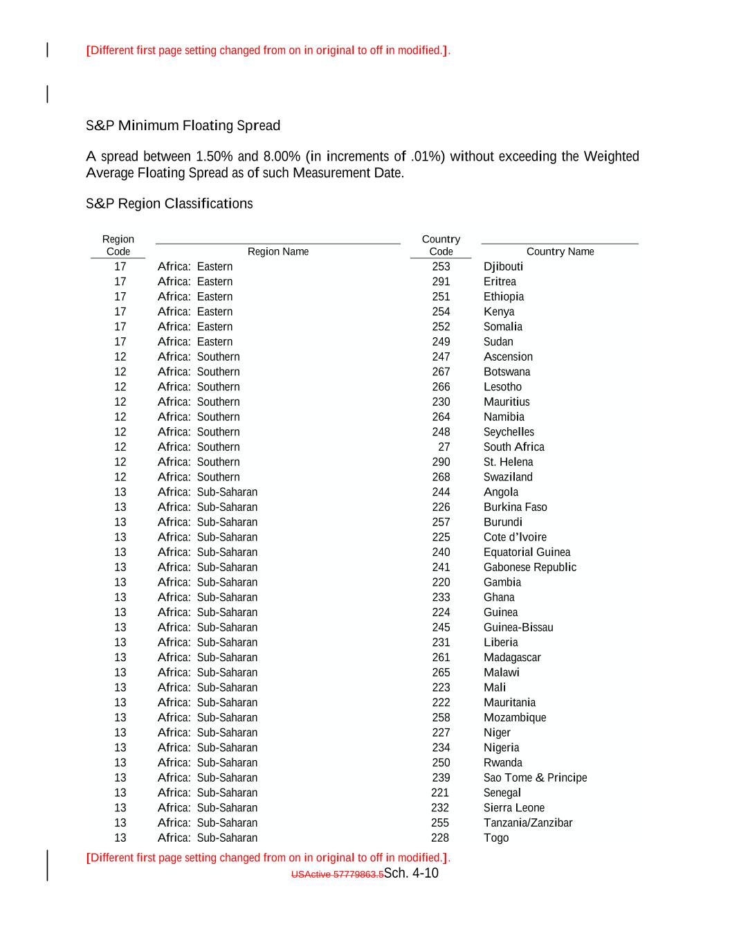 [Different first page setting changed from on in original to off in modified.]. [Different first page setting changed from on in original to off in modified.]. USActive 57779863.5Sch. 4-10 Cote d’lvoire 266 Country Code 13 Lesotho Africa: Sub-Saharan 254 240 Equatorial Guinea 12 13 Kenya Africa: Sub-Saharan Africa: Southern 241 Gabonese Republic 230 13 Mauritius Africa: Sub-Saharan 17 220 Gambia 17 12 13 Country Name Africa: Sub-Saharan Africa: Southern 233 Africa: Eastern Ghana 264 Africa: Eastern 13 Namibia Africa: Sub-Saharan 252 224 Guinea 12 13 Somalia Africa: Sub-Saharan Africa: Southern 245 291 Guinea-Bissau 248 13 Seychelles Africa: Sub-Saharan 231 Liberia 17 12 13 Eritrea Africa: Sub-Saharan Africa: Southern 261 Africa: Eastern Madagascar 27 Region Code 13 South Africa Africa: Sub-Saharan 249 265 Malawi 12 13 Sudan Africa: Sub-Saharan Africa: Southern 223 17 Mali 290 13 St. Helena Africa: Sub-Saharan 17 222 Mauritania 12 12 13 Africa: Sub-Saharan Africa: Southern 258 Africa: Southern Mozambique 268 Africa: Eastern 13 Swaziland Africa: Sub-Saharan 247 227 Niger Africa: Eastern 13 13 Ascension Africa: Sub-Saharan Africa: Sub-Saharan 234 251 Nigeria 244 13 Angola Africa: Sub-Saharan Region Name 250 Rwanda 12 13 13 Ethiopia Africa: Sub-Saharan Africa: Sub-Saharan 239 Africa: Southern Sao Tome & Principe 226 253 13 Burkina Faso Africa: Sub-Saharan 267 221 Senegal 13 13 Botswana Africa: Sub-Saharan Africa: Sub-Saharan 232 S&P Minimum Floating Spread A spread between 1.50% and 8.00% (in increments of .01%) without exceeding the Weighted Average Floating Spread as of such Measurement Date. S&P Region Classifications Sierra Leone 257 13 Burundi Africa: Sub-Saharan 17 255 Tanzania/Zanzibar 12 13 13 Djibouti Africa: Sub-Saharan Africa: Sub-Saharan 228 Africa: Southern Togo 225 Africa: Eastern