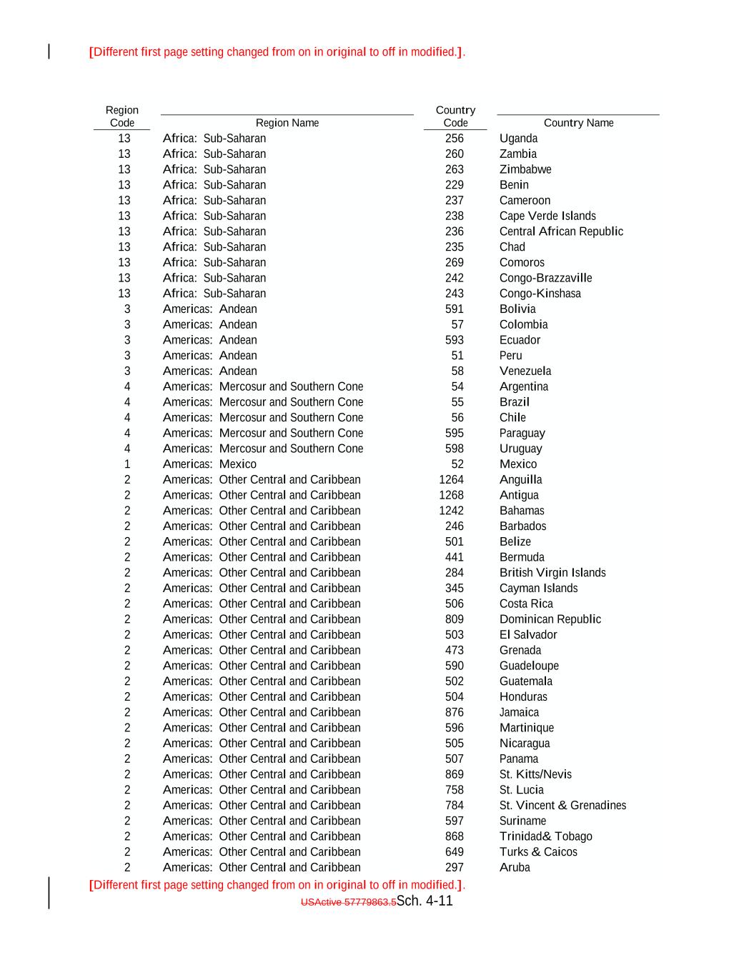[Different first page setting changed from on in original to off in modified.]. [Different first page setting changed from on in original to off in modified.]. USActive 57779863.5Sch. 4-11 Americas: Other Central and Caribbean 1268 Cameroon Antigua 3 2 Americas: Andean Americas: Other Central and Caribbean 1242 591 Bahamas Zambia Bolivia 2 13 Americas: Other Central and Caribbean 246 13 Barbados 3 Africa: Sub-Saharan 2 Americas: Andean Americas: Other Central and Caribbean 501 57 Belize 238 Colombia 2 Region Name Americas: Other Central and Caribbean 441 Cape Verde Islands Bermuda 3 13 2 Americas: Andean Americas: Other Central and Caribbean 284 593 British Virgin Islands Africa: Sub-Saharan Ecuador 2 13 Americas: Other Central and Caribbean 345 Africa: Sub-Saharan Cayman Islands 3 Africa: Sub-Saharan 2 Americas: Andean Americas: Other Central and Caribbean 506 51 Costa Rica 236 Peru 2 263 Americas: Other Central and Caribbean 809 Central African Republic Dominican Republic 3 256 2 Americas: Andean Americas: Other Central and Caribbean 503 58 El Salvador Zimbabwe Venezuela 2 13 Americas: Other Central and Caribbean 473 Country Code Grenada 4 Africa: Sub-Saharan 2 Americas: Mercosur and Southern Cone Americas: Other Central and Caribbean 590 54 Guadeloupe 235 Argentina 2 Uganda Americas: Other Central and Caribbean 502 Chad Guatemala 4 13 2 Americas: Mercosur and Southern Cone Americas: Other Central and Caribbean 504 55 Honduras Brazil 2 13 Americas: Other Central and Caribbean 876 Africa: Sub-Saharan Jamaica 4 Africa: Sub-Saharan 2 Americas: Mercosur and Southern Cone Americas: Other Central and Caribbean 596 56 Martinique 269 Chile 2 229 Americas: Other Central and Caribbean 505 Comoros Nicaragua 4 Country Name 2 Americas: Mercosur and Southern Cone Americas: Other Central and Caribbean 507 595 Panama Benin Paraguay 2 13 Americas: Other Central and Caribbean 869 13 St. Kitts/Nevis 4 Africa: Sub-Saharan 2 Americas: Mercosur and Southern Cone Americas: Other Central and Caribbean 758 598 St. Lucia 242 Uruguay 2 Region Code Americas: Other Central and Caribbean 784 Congo-Brazzaville St. Vincent & Grenadines 1 13 2 Americas: Mexico Americas: Other Central and Caribbean 597 52 Suriname Africa: Sub-Saharan Mexico 2 13 Americas: Other Central and Caribbean 868 Africa: Sub-Saharan Trinidad& Tobago 2 Africa: Sub-Saharan 2 Americas: Other Central and Caribbean Americas: Other Central and Caribbean 649 1264 Turks & Caicos 243 Anguilla 2 237 Americas: Other Central and Caribbean 297 Congo-Kinshasa Aruba 2 260
