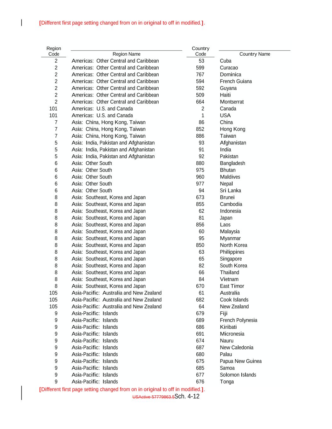 [Different first page setting changed from on in original to off in modified.]. [Different first page setting changed from on in original to off in modified.]. USActive 57779863.5Sch. 4-12 Asia: Southeast, Korea and Japan 81 Guyana Japan 7 8 Asia: China, Hong Kong, Taiwan Asia: Southeast, Korea and Japan 856 886 Laos Curacao Taiwan 8 2 Asia: Southeast, Korea and Japan 60 2 Malaysia 5 Americas: Other Central and Caribbean 8 Asia: India, Pakistan and Afghanistan Asia: Southeast, Korea and Japan 95 93 Myanmar 509 Afghanistan 8 Region Name Asia: Southeast, Korea and Japan 850 Haiti North Korea 5 2 8 Asia: India, Pakistan and Afghanistan Asia: Southeast, Korea and Japan 63 91 Philippines Americas: Other Central and Caribbean India 8 2 Asia: Southeast, Korea and Japan 65 Americas: Other Central and Caribbean Singapore 5 Americas: Other Central and Caribbean 8 Asia: India, Pakistan and Afghanistan Asia: Southeast, Korea and Japan 82 92 South Korea 664 Pakistan 8 767 Asia: Southeast, Korea and Japan 66 Montserrat Thailand 6 53 8 Asia: Other South Asia: Southeast, Korea and Japan 84 880 Vietnam Dominica Bangladesh 8 101 Asia: Southeast, Korea and Japan 670 Country Code East Timor 6 Americas: U.S. and Canada 105 Asia: Other South Asia-Pacific: Australia and New Zealand 61 975 Australia 2 Bhutan 105 Cuba Asia-Pacific: Australia and New Zealand 682 Canada Cook Islands 6 2 105 Asia: Other South Asia-Pacific: Australia and New Zealand 64 960 New Zealand Maldives 9 101 Asia-Pacific: Islands 679 Americas: Other Central and Caribbean Fiji 6 Americas: U.S. and Canada 9 Asia: Other South Asia-Pacific: Islands 689 977 French Polynesia 1 Nepal 9 594 Asia-Pacific: Islands 686 USA Kiribati 6 Country Name 9 Asia: Other South Asia-Pacific: Islands 691 94 Micronesia French Guiana Sri Lanka 9 7 Asia-Pacific: Islands 674 2 Nauru 8 Asia: China, Hong Kong, Taiwan 9 Asia: Southeast, Korea and Japan Asia-Pacific: Islands 687 673 New Caledonia 86 Brunei 9 Region Code Asia-Pacific: Islands 680 China Palau 8 2 9 Asia: Southeast, Korea and Japan Asia-Pacific: Islands 675 855 Papua New Guinea Americas: Other Central and Caribbean Cambodia 9 7 Asia-Pacific: Islands 685 Americas: Other Central and Caribbean Samoa 8 Asia: China, Hong Kong, Taiwan 9 Asia: Southeast, Korea and Japan Asia-Pacific: Islands 677 62 Solomon Islands 852 Indonesia 9 592 Asia-Pacific: Islands 676 Hong Kong Tonga 8 599
