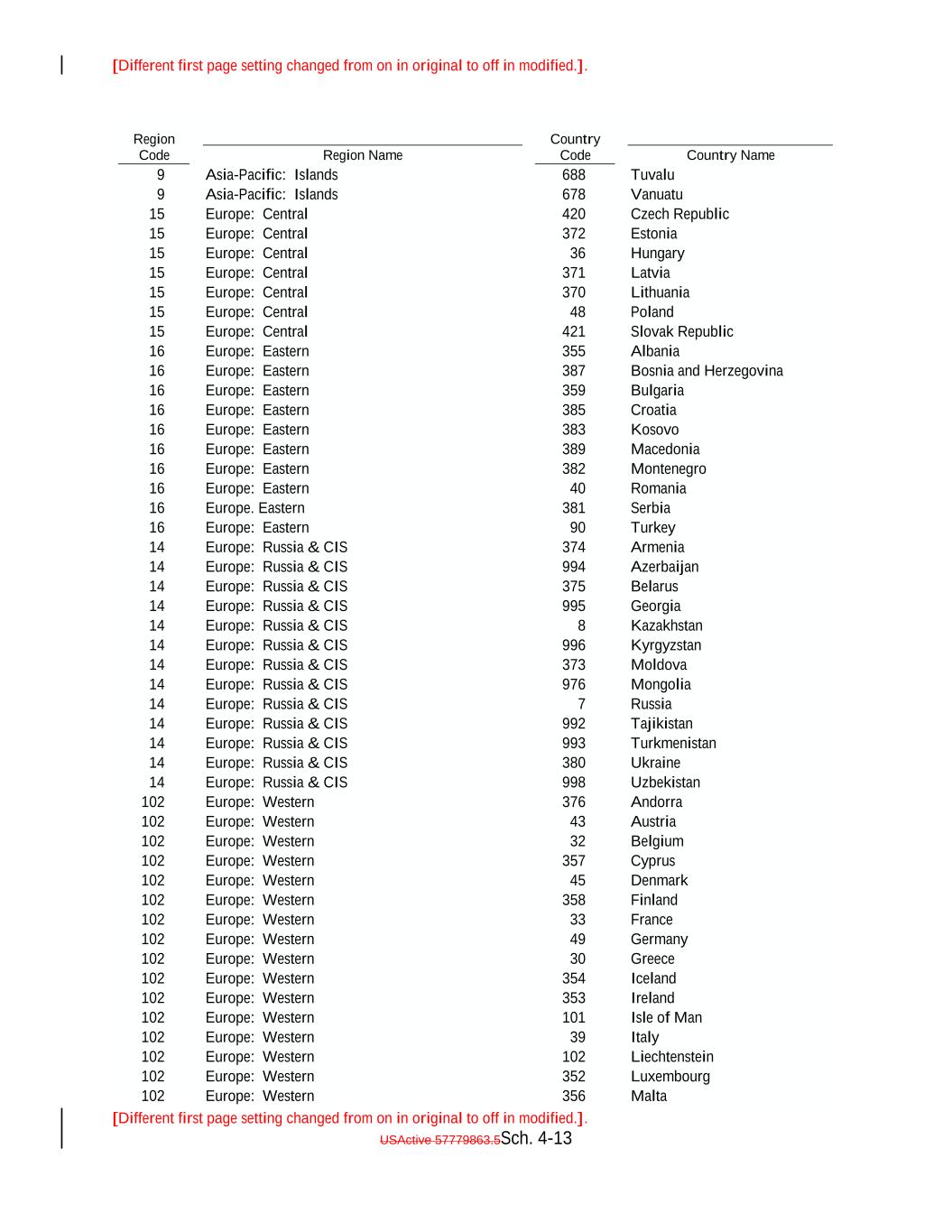 [Different first page setting changed from on in original to off in modified.]. [Different first page setting changed from on in original to off in modified.]. USActive 57779863.5Sch. 4-13 Europe: Russia & CIS 8 Hungary Kazakhstan 16 14 Europe: Eastern Europe: Russia & CIS 996 359 Kyrgyzstan Vanuatu Bulgaria 14 15 Europe: Russia & CIS 373 9 Moldova 16 Europe: Central 14 Europe: Eastern Europe: Russia & CIS 976 385 Mongolia 371 Croatia 14 Region Name Europe: Russia & CIS 7 Latvia Russia 16 15 14 Europe: Eastern Europe: Russia & CIS 992 383 Tajikistan Asia-Pacific: Islands Kosovo 14 15 Europe: Russia & CIS 993 Europe: Central Turkmenistan 16 Europe: Central 14 Europe: Eastern Europe: Russia & CIS 380 389 Ukraine 370 Macedonia 14 420 Europe: Russia & CIS 998 Lithuania Uzbekistan 16 688 102 Europe: Eastern Europe: Western 376 382 Andorra Czech Republic Montenegro 102 15 Europe: Western 43 Country Code Austria 16 Europe: Central 102 Europe: Eastern Europe: Western 32 40 Belgium 48 Romania 102 Tuvalu Europe: Western 357 Poland Cyprus 16 15 102 Europe. Eastern Europe: Western 45 381 Denmark Serbia 102 15 Europe: Western 358 Europe: Central Finland 16 Europe: Central 102 Europe: Eastern Europe: Western 33 90 France 421 Turkey 102 372 Europe: Western 49 Slovak Republic Germany 14 Country Name 102 Europe: Russia & CIS Europe: Western 30 374 Greece Estonia Armenia 102 16 Europe: Western 354 9 Iceland 14 Europe: Eastern 102 Europe: Russia & CIS Europe: Western 353 994 Ireland 355 Azerbaijan 102 Region Code Europe: Western 101 Albania Isle of Man 14 15 102 Europe: Russia & CIS Europe: Western 39 375 Italy Asia-Pacific: Islands Belarus 102 16 Europe: Western 102 Europe: Central Liechtenstein 14 Europe: Eastern 102 Europe: Russia & CIS Europe: Western 352 995 Luxembourg 387 Georgia 102 36 Europe: Western 356 Bosnia and Herzegovina Malta 14 678