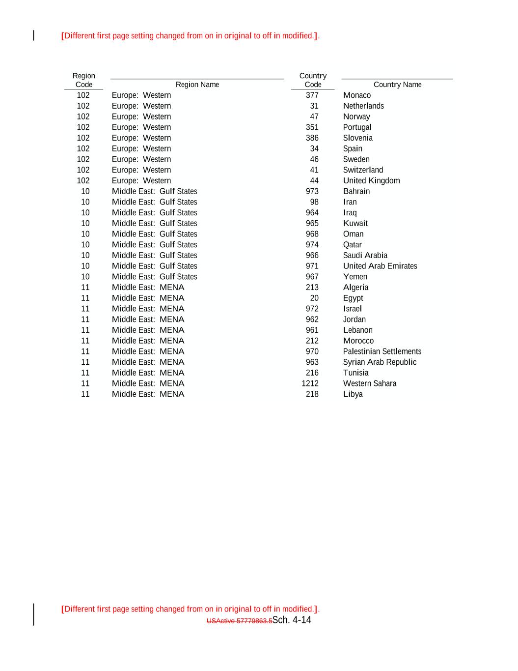 [Different first page setting changed from on in original to off in modified.]. [Different first page setting changed from on in original to off in modified.]. USActive 57779863.5Sch. 4-14 102 Europe: Western 10 Europe: Western Middle East: Gulf States 974 46 Qatar 47 Sweden 10 377 Middle East: Gulf States 966 Norway Saudi Arabia 102 Country Code 10 Europe: Western Middle East: Gulf States 971 41 United Arab Emirates Monaco Switzerland 10 102 Middle East: Gulf States 967 Yemen 102 Europe: Western 11 Europe: Western Middle East: MENA 213 44 Algeria 351 United Kingdom 11 Country Name Middle East: MENA 20 Portugal Egypt 10 102 11 Middle East: Gulf States Middle East: MENA 972 973 Israel Region Code Bahrain 11 102 Middle East: MENA 962 Europe: Western Jordan 10 Europe: Western 11 Middle East: Gulf States Middle East: MENA 961 98 Lebanon 386 Iran 11 31 Middle East: MENA 212 Slovenia Morocco 10 11 Middle East: Gulf States Middle East: MENA 970 964 Palestinian Settlements Netherlands Iraq 11 102 Middle East: MENA 963 102 Syrian Arab Republic 10 Europe: Western 11 Middle East: Gulf States Middle East: MENA 216 965 Tunisia 34 Kuwait 11 Region Name Middle East: MENA 1212 Spain Western Sahara 10 102 11 Middle East: Gulf States Middle East: MENA 218 968 Libya Europe: Western Oman
