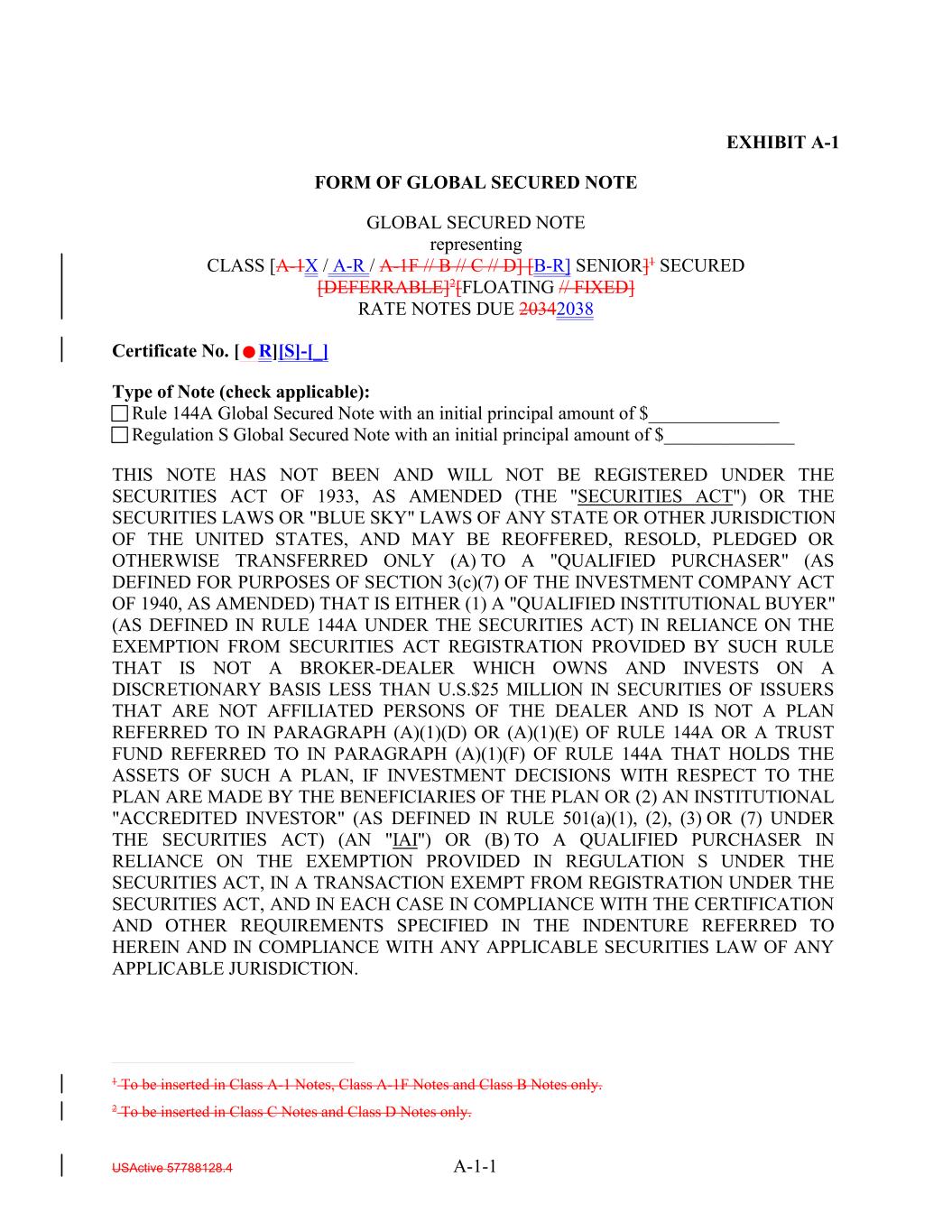 USActive 57788128.4 A-1-1 GLOBAL SECURED NOTE representing CLASS [A-1X / A-R / A-1F // B // C // D] [B-R] SENIOR]1 SECURED [DEFERRABLE]2[FLOATING // FIXED] RATE NOTES DUE 20342038 Certificate No. [R][S]-[_] Type of Note (check applicable): Rule 144A Global Secured Note with an initial principal amount of $______________ Regulation S Global Secured Note with an initial principal amount of $______________ THIS NOTE HAS NOT BEEN AND WILL NOT BE REGISTERED UNDER THE SECURITIES ACT OF 1933, AS AMENDED (THE "SECURITIES ACT") OR THE SECURITIES LAWS OR "BLUE SKY" LAWS OF ANY STATE OR OTHER JURISDICTION OF THE UNITED STATES, AND MAY BE REOFFERED, RESOLD, PLEDGED OR OTHERWISE TRANSFERRED ONLY (A) TO A "QUALIFIED PURCHASER" (AS DEFINED FOR PURPOSES OF SECTION 3(c)(7) OF THE INVESTMENT COMPANY ACT OF 1940, AS AMENDED) THAT IS EITHER (1) A "QUALIFIED INSTITUTIONAL BUYER" (AS DEFINED IN RULE 144A UNDER THE SECURITIES ACT) IN RELIANCE ON THE EXEMPTION FROM SECURITIES ACT REGISTRATION PROVIDED BY SUCH RULE THAT IS NOT A BROKER-DEALER WHICH OWNS AND INVESTS ON A DISCRETIONARY BASIS LESS THAN U.S.$25 MILLION IN SECURITIES OF ISSUERS THAT ARE NOT AFFILIATED PERSONS OF THE DEALER AND IS NOT A PLAN REFERRED TO IN PARAGRAPH (A)(1)(D) OR (A)(1)(E) OF RULE 144A OR A TRUST FUND REFERRED TO IN PARAGRAPH (A)(1)(F) OF RULE 144A THAT HOLDS THE ASSETS OF SUCH A PLAN, IF INVESTMENT DECISIONS WITH RESPECT TO THE PLAN ARE MADE BY THE BENEFICIARIES OF THE PLAN OR (2) AN INSTITUTIONAL "ACCREDITED INVESTOR" (AS DEFINED IN RULE 501(a)(1), (2), (3) OR (7) UNDER THE SECURITIES ACT) (AN "IAI") OR (B) TO A QUALIFIED PURCHASER IN RELIANCE ON THE EXEMPTION PROVIDED IN REGULATION S UNDER THE SECURITIES ACT, IN A TRANSACTION EXEMPT FROM REGISTRATION UNDER THE SECURITIES ACT, AND IN EACH CASE IN COMPLIANCE WITH THE CERTIFICATION AND OTHER REQUIREMENTS SPECIFIED IN THE INDENTURE REFERRED TO HEREIN AND IN COMPLIANCE WITH ANY APPLICABLE SECURITIES LAW OF ANY APPLICABLE JURISDICTION. EXHIBIT A-1 FORM OF GLOBAL SECURED NOTE 1 To be inserted in Class A-1 Notes, Class A-1F Notes and Class B Notes only. 2 To be inserted in Class C Notes and Class D Notes only.