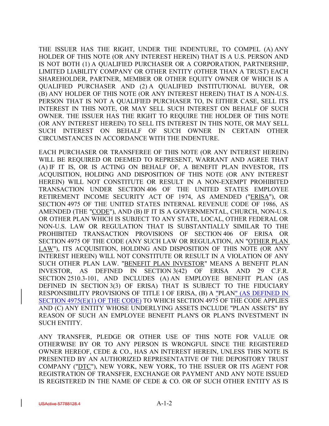 THE ISSUER HAS THE RIGHT, UNDER THE INDENTURE, TO COMPEL (A) ANY HOLDER OF THIS NOTE (OR ANY INTEREST HEREIN) THAT IS A U.S. PERSON AND IS NOT BOTH (1) A QUALIFIED PURCHASER OR A CORPORATION, PARTNERSHIP, LIMITED LIABILITY COMPANY OR OTHER ENTITY (OTHER THAN A TRUST) EACH SHAREHOLDER, PARTNER, MEMBER OR OTHER EQUITY OWNER OF WHICH IS A QUALIFIED PURCHASER AND (2) A QUALIFIED INSTITUTIONAL BUYER, OR (B) ANY HOLDER OF THIS NOTE (OR ANY INTEREST HEREIN) THAT IS A NON-U.S. PERSON THAT IS NOT A QUALIFIED PURCHASER TO, IN EITHER CASE, SELL ITS INTEREST IN THIS NOTE, OR MAY SELL SUCH INTEREST ON BEHALF OF SUCH OWNER. THE ISSUER HAS THE RIGHT TO REQUIRE THE HOLDER OF THIS NOTE (OR ANY INTEREST HEREIN) TO SELL ITS INTEREST IN THIS NOTE, OR MAY SELL SUCH INTEREST ON BEHALF OF SUCH OWNER IN CERTAIN OTHER CIRCUMSTANCES IN ACCORDANCE WITH THE INDENTURE. EACH PURCHASER OR TRANSFEREE OF THIS NOTE (OR ANY INTEREST HEREIN) WILL BE REQUIRED OR DEEMED TO REPRESENT, WARRANT AND AGREE THAT (A) IF IT IS, OR IS ACTING ON BEHALF OF, A BENEFIT PLAN INVESTOR, ITS ACQUISITION, HOLDING AND DISPOSITION OF THIS NOTE (OR ANY INTEREST HEREIN) WILL NOT CONSTITUTE OR RESULT IN A NON-EXEMPT PROHIBITED TRANSACTION UNDER SECTION 406 OF THE UNITED STATES EMPLOYEE RETIREMENT INCOME SECURITY ACT OF 1974, AS AMENDED ("ERISA"), OR SECTION 4975 OF THE UNITED STATES INTERNAL REVENUE CODE OF 1986, AS AMENDED (THE "CODE"), AND (B) IF IT IS A GOVERNMENTAL, CHURCH, NON-U.S. OR OTHER PLAN WHICH IS SUBJECT TO ANY STATE, LOCAL, OTHER FEDERAL OR NON-U.S. LAW OR REGULATION THAT IS SUBSTANTIALLY SIMILAR TO THE PROHIBITED TRANSACTION PROVISIONS OF SECTION 406 OF ERISA OR SECTION 4975 OF THE CODE (ANY SUCH LAW OR REGULATION, AN "OTHER PLAN LAW"), ITS ACQUISITION, HOLDING AND DISPOSITION OF THIS NOTE (OR ANY INTEREST HEREIN) WILL NOT CONSTITUTE OR RESULT IN A VIOLATION OF ANY SUCH OTHER PLAN LAW. "BENEFIT PLAN INVESTOR" MEANS A BENEFIT PLAN INVESTOR, AS DEFINED IN SECTION 3(42) OF ERISA AND 29 C.F.R. SECTION 2510.3-101, AND INCLUDES (A) AN EMPLOYEE BENEFIT PLAN (AS DEFINED IN SECTION 3(3) OF ERISA) THAT IS SUBJECT TO THE FIDUCIARY RESPONSIBILITY PROVISIONS OF TITLE I OF ERISA, (B) A "PLAN" (AS DEFINED IN SECTION 4975(E)(1) OF THE CODE) TO WHICH SECTION 4975 OF THE CODE APPLIES AND (C) ANY ENTITY WHOSE UNDERLYING ASSETS INCLUDE "PLAN ASSETS" BY REASON OF SUCH AN EMPLOYEE BENEFIT PLAN'S OR PLAN'S INVESTMENT IN SUCH ENTITY. ANY TRANSFER, PLEDGE OR OTHER USE OF THIS NOTE FOR VALUE OR OTHERWISE BY OR TO ANY PERSON IS WRONGFUL SINCE THE REGISTERED OWNER HEREOF, CEDE & CO., HAS AN INTEREST HEREIN, UNLESS THIS NOTE IS PRESENTED BY AN AUTHORIZED REPRESENTATIVE OF THE DEPOSITORY TRUST COMPANY ("DTC"), NEW YORK, NEW YORK, TO THE ISSUER OR ITS AGENT FOR REGISTRATION OF TRANSFER, EXCHANGE OR PAYMENT AND ANY NOTE ISSUED IS REGISTERED IN THE NAME OF CEDE & CO. OR OF SUCH OTHER ENTITY AS IS USActive 57788128.4 A-1-2