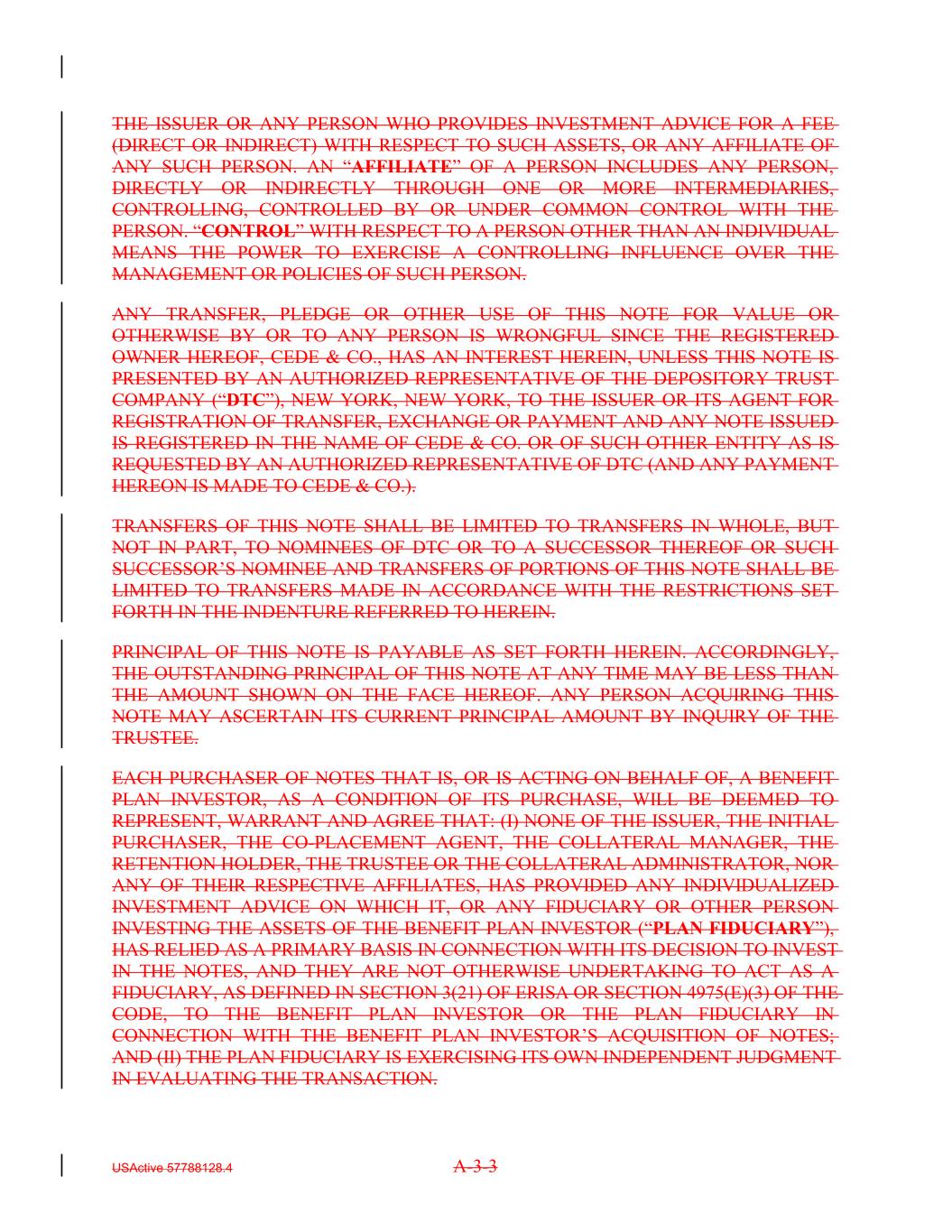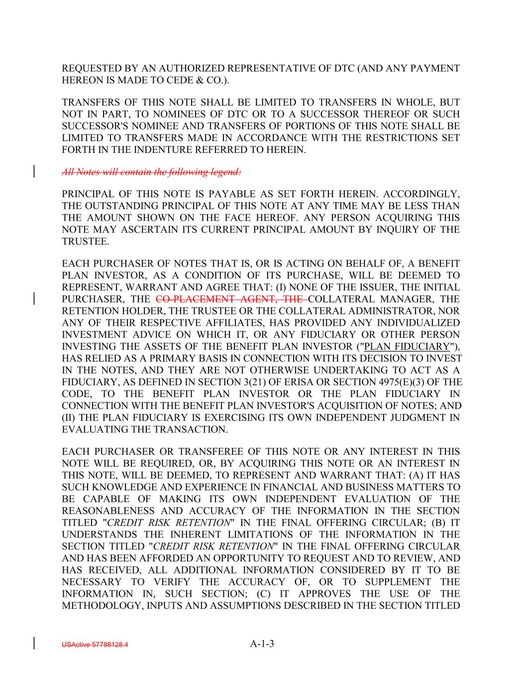 REQUESTED BY AN AUTHORIZED REPRESENTATIVE OF DTC (AND ANY PAYMENT HEREON IS MADE TO CEDE & CO.). TRANSFERS OF THIS NOTE SHALL BE LIMITED TO TRANSFERS IN WHOLE, BUT NOT IN PART, TO NOMINEES OF DTC OR TO A SUCCESSOR THEREOF OR SUCH SUCCESSOR'S NOMINEE AND TRANSFERS OF PORTIONS OF THIS NOTE SHALL BE LIMITED TO TRANSFERS MADE IN ACCORDANCE WITH THE RESTRICTIONS SET FORTH IN THE INDENTURE REFERRED TO HEREIN. All Notes will contain the following legend: PRINCIPAL OF THIS NOTE IS PAYABLE AS SET FORTH HEREIN. ACCORDINGLY, THE OUTSTANDING PRINCIPAL OF THIS NOTE AT ANY TIME MAY BE LESS THAN THE AMOUNT SHOWN ON THE FACE HEREOF. ANY PERSON ACQUIRING THIS NOTE MAY ASCERTAIN ITS CURRENT PRINCIPAL AMOUNT BY INQUIRY OF THE TRUSTEE. EACH PURCHASER OF NOTES THAT IS, OR IS ACTING ON BEHALF OF, A BENEFIT PLAN INVESTOR, AS A CONDITION OF ITS PURCHASE, WILL BE DEEMED TO REPRESENT, WARRANT AND AGREE THAT: (I) NONE OF THE ISSUER, THE INITIAL PURCHASER, THE CO-PLACEMENT AGENT, THE COLLATERAL MANAGER, THE RETENTION HOLDER, THE TRUSTEE OR THE COLLATERAL ADMINISTRATOR, NOR ANY OF THEIR RESPECTIVE AFFILIATES, HAS PROVIDED ANY INDIVIDUALIZED INVESTMENT ADVICE ON WHICH IT, OR ANY FIDUCIARY OR OTHER PERSON INVESTING THE ASSETS OF THE BENEFIT PLAN INVESTOR ("PLAN FIDUCIARY"), HAS RELIED AS A PRIMARY BASIS IN CONNECTION WITH ITS DECISION TO INVEST IN THE NOTES, AND THEY ARE NOT OTHERWISE UNDERTAKING TO ACT AS A FIDUCIARY, AS DEFINED IN SECTION 3(21) OF ERISA OR SECTION 4975(E)(3) OF THE CODE, TO THE BENEFIT PLAN INVESTOR OR THE PLAN FIDUCIARY IN CONNECTION WITH THE BENEFIT PLAN INVESTOR'S ACQUISITION OF NOTES; AND (II) THE PLAN FIDUCIARY IS EXERCISING ITS OWN INDEPENDENT JUDGMENT IN EVALUATING THE TRANSACTION. EACH PURCHASER OR TRANSFEREE OF THIS NOTE OR ANY INTEREST IN THIS NOTE WILL BE REQUIRED, OR, BY ACQUIRING THIS NOTE OR AN INTEREST IN THIS NOTE, WILL BE DEEMED, TO REPRESENT AND WARRANT THAT: (A) IT HAS SUCH KNOWLEDGE AND EXPERIENCE IN FINANCIAL AND BUSINESS MATTERS TO BE CAPABLE OF MAKING ITS OWN INDEPENDENT EVALUATION OF THE REASONABLENESS AND ACCURACY OF THE INFORMATION IN THE SECTION TITLED "CREDIT RISK RETENTION" IN THE FINAL OFFERING CIRCULAR; (B) IT UNDERSTANDS THE INHERENT LIMITATIONS OF THE INFORMATION IN THE SECTION TITLED "CREDIT RISK RETENTION" IN THE FINAL OFFERING CIRCULAR AND HAS BEEN AFFORDED AN OPPORTUNITY TO REQUEST AND TO REVIEW, AND HAS RECEIVED, ALL ADDITIONAL INFORMATION CONSIDERED BY IT TO BE NECESSARY TO VERIFY THE ACCURACY OF, OR TO SUPPLEMENT THE INFORMATION IN, SUCH SECTION; (C) IT APPROVES THE USE OF THE METHODOLOGY, INPUTS AND ASSUMPTIONS DESCRIBED IN THE SECTION TITLED USActive 57788128.4 A-1-3