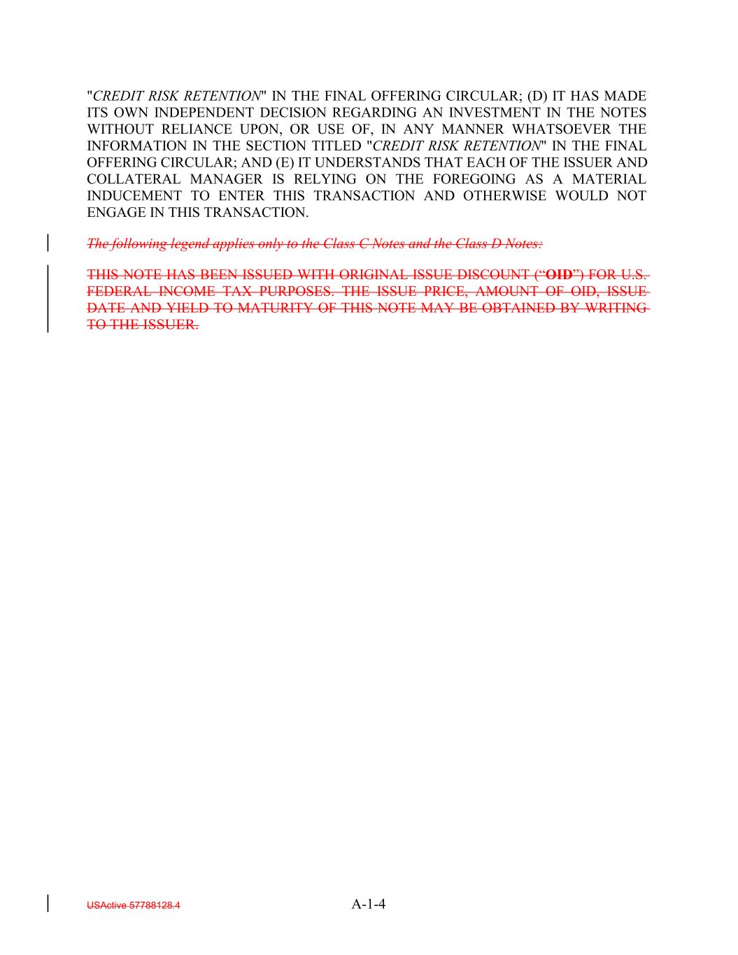 "CREDIT RISK RETENTION" IN THE FINAL OFFERING CIRCULAR; (D) IT HAS MADE ITS OWN INDEPENDENT DECISION REGARDING AN INVESTMENT IN THE NOTES WITHOUT RELIANCE UPON, OR USE OF, IN ANY MANNER WHATSOEVER THE INFORMATION IN THE SECTION TITLED "CREDIT RISK RETENTION" IN THE FINAL OFFERING CIRCULAR; AND (E) IT UNDERSTANDS THAT EACH OF THE ISSUER AND COLLATERAL MANAGER IS RELYING ON THE FOREGOING AS A MATERIAL INDUCEMENT TO ENTER THIS TRANSACTION AND OTHERWISE WOULD NOT ENGAGE IN THIS TRANSACTION. The following legend applies only to the Class C Notes and the Class D Notes: THIS NOTE HAS BEEN ISSUED WITH ORIGINAL ISSUE DISCOUNT (“OID”) FOR U.S. FEDERAL INCOME TAX PURPOSES. THE ISSUE PRICE, AMOUNT OF OID, ISSUE DATE AND YIELD TO MATURITY OF THIS NOTE MAY BE OBTAINED BY WRITING TO THE ISSUER. USActive 57788128.4 A-1-4