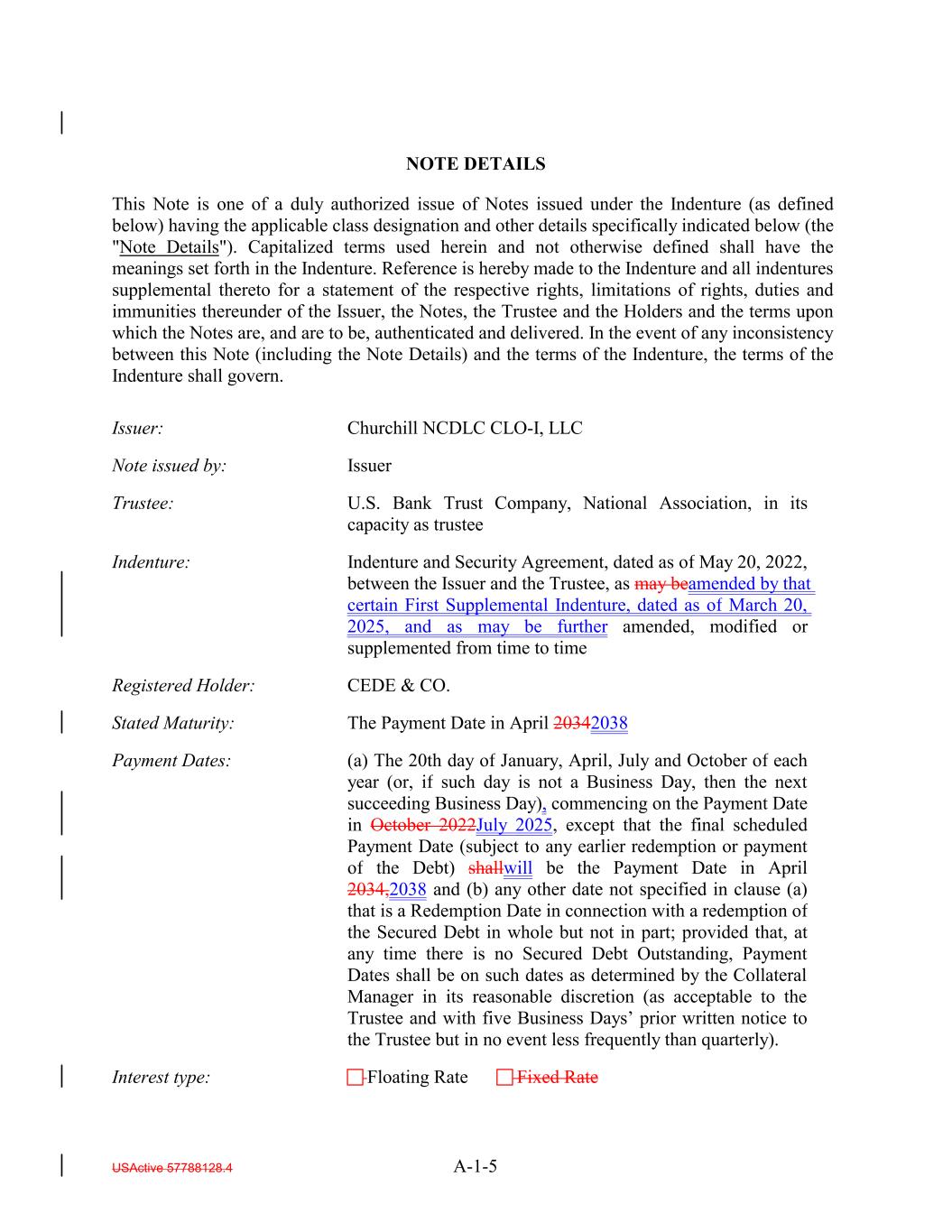 USActive 57788128.4 A-1-5 Indenture and Security Agreement, dated as of May 20, 2022, between the Issuer and the Trustee, as may beamended by that certain First Supplemental Indenture, dated as of March 20, 2025, and as may be further amended, modified or supplemented from time to time Note issued by: Registered Holder: CEDE & CO. Issuer Stated Maturity: The Payment Date in April 20342038 Issuer: Trustee: Payment Dates: (a) The 20th day of January, April, July and October of each year (or, if such day is not a Business Day, then the next succeeding Business Day), commencing on the Payment Date in October 2022July 2025, except that the final scheduled Payment Date (subject to any earlier redemption or payment of the Debt) shallwill be the Payment Date in April 2034,2038 and (b) any other date not specified in clause (a) that is a Redemption Date in connection with a redemption of the Secured Debt in whole but not in part; provided that, at any time there is no Secured Debt Outstanding, Payment Dates shall be on such dates as determined by the Collateral Manager in its reasonable discretion (as acceptable to the Trustee and with five Business Days’ prior written notice to the Trustee but in no event less frequently than quarterly). U.S. Bank Trust Company, National Association, in its capacity as trustee Churchill NCDLC CLO-I, LLC Interest type: Floating Rate Fixed Rate NOTE DETAILS This Note is one of a duly authorized issue of Notes issued under the Indenture (as defined below) having the applicable class designation and other details specifically indicated below (the "Note Details"). Capitalized terms used herein and not otherwise defined shall have the meanings set forth in the Indenture. Reference is hereby made to the Indenture and all indentures supplemental thereto for a statement of the respective rights, limitations of rights, duties and immunities thereunder of the Issuer, the Notes, the Trustee and the Holders and the terms upon which the Notes are, and are to be, authenticated and delivered. In the event of any inconsistency between this Note (including the Note Details) and the terms of the Indenture, the terms of the Indenture shall govern. Indenture: