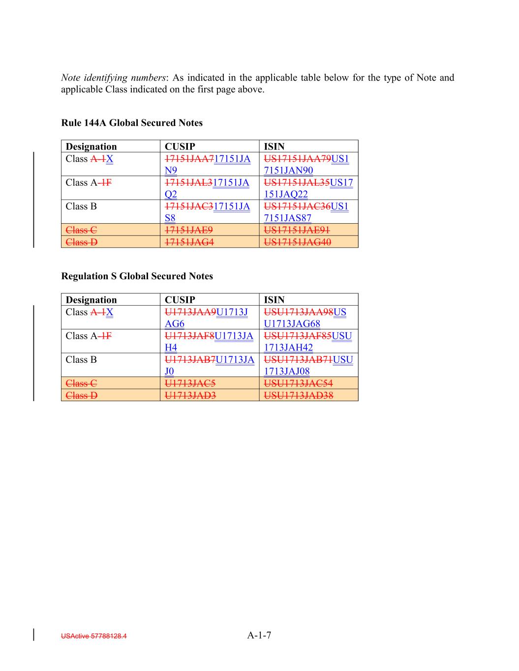 USActive 57788128.4 A-1-7 US17151JAG40 17151JAL317151JA Q2 Regulation S Global Secured Notes Designation US17151JAL35US17 151JAQ22 CUSIP ISIN Class A-1X Class B U1713JAA9U1713J AG6 Class A-1X USU1713JAA98US U1713JAG68 17151JAC317151JA S8 Designation Class A-1F US17151JAC36US1 7151JAS87 U1713JAF8U1713JA H4 17151JAA717151JA N9 USU1713JAF85USU 1713JAH42 Class B Class C U1713JAB7U1713JA J0 US17151JAA79US1 7151JAN90 USU1713JAB71USU 1713JAJ08 17151JAE9 CUSIP Class C US17151JAE91 U1713JAC5 USU1713JAC54 Note identifying numbers: As indicated in the applicable table below for the type of Note and applicable Class indicated on the first page above. Rule 144A Global Secured Notes Class D Class D U1713JAD3 Class A-1F USU1713JAD38 17151JAG4 ISIN