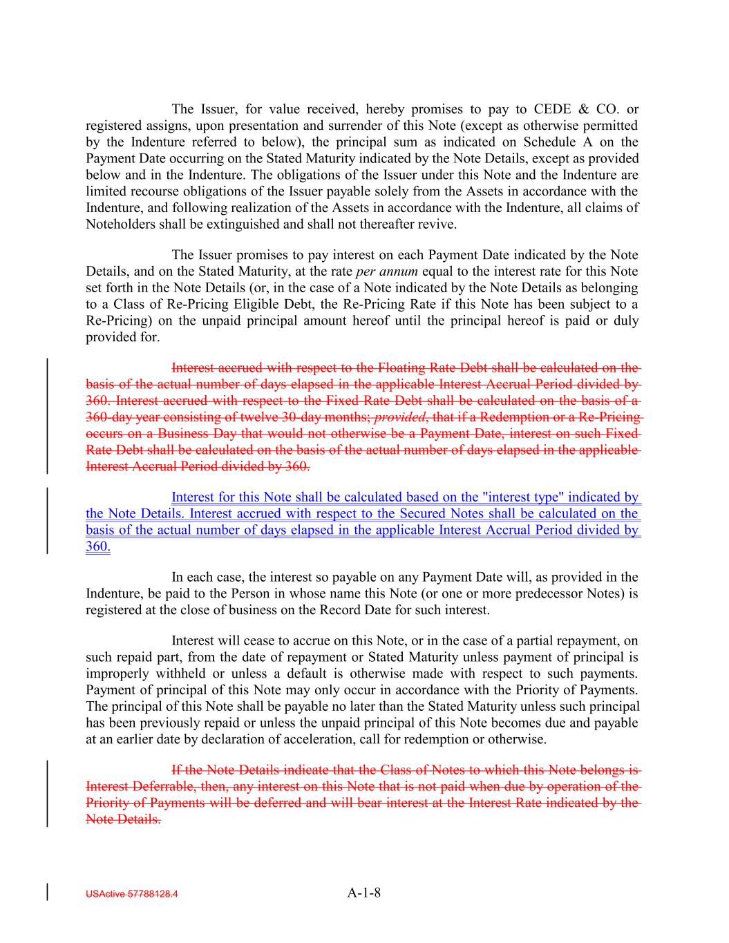 The Issuer, for value received, hereby promises to pay to CEDE & CO. or registered assigns, upon presentation and surrender of this Note (except as otherwise permitted by the Indenture referred to below), the principal sum as indicated on Schedule A on the Payment Date occurring on the Stated Maturity indicated by the Note Details, except as provided below and in the Indenture. The obligations of the Issuer under this Note and the Indenture are limited recourse obligations of the Issuer payable solely from the Assets in accordance with the Indenture, and following realization of the Assets in accordance with the Indenture, all claims of Noteholders shall be extinguished and shall not thereafter revive. The Issuer promises to pay interest on each Payment Date indicated by the Note Details, and on the Stated Maturity, at the rate per annum equal to the interest rate for this Note set forth in the Note Details (or, in the case of a Note indicated by the Note Details as belonging to a Class of Re-Pricing Eligible Debt, the Re-Pricing Rate if this Note has been subject to a Re-Pricing) on the unpaid principal amount hereof until the principal hereof is paid or duly provided for. Interest accrued with respect to the Floating Rate Debt shall be calculated on the basis of the actual number of days elapsed in the applicable Interest Accrual Period divided by 360. Interest accrued with respect to the Fixed Rate Debt shall be calculated on the basis of a 360-day year consisting of twelve 30-day months; provided, that if a Redemption or a Re-Pricing occurs on a Business Day that would not otherwise be a Payment Date, interest on such Fixed Rate Debt shall be calculated on the basis of the actual number of days elapsed in the applicable Interest Accrual Period divided by 360. Interest for this Note shall be calculated based on the "interest type" indicated by the Note Details. Interest accrued with respect to the Secured Notes shall be calculated on the basis of the actual number of days elapsed in the applicable Interest Accrual Period divided by 360. In each case, the interest so payable on any Payment Date will, as provided in the Indenture, be paid to the Person in whose name this Note (or one or more predecessor Notes) is registered at the close of business on the Record Date for such interest. Interest will cease to accrue on this Note, or in the case of a partial repayment, on such repaid part, from the date of repayment or Stated Maturity unless payment of principal is improperly withheld or unless a default is otherwise made with respect to such payments. Payment of principal of this Note may only occur in accordance with the Priority of Payments. The principal of this Note shall be payable no later than the Stated Maturity unless such principal has been previously repaid or unless the unpaid principal of this Note becomes due and payable at an earlier date by declaration of acceleration, call for redemption or otherwise. If the Note Details indicate that the Class of Notes to which this Note belongs is Interest Deferrable, then, any interest on this Note that is not paid when due by operation of the Priority of Payments will be deferred and will bear interest at the Interest Rate indicated by the Note Details. USActive 57788128.4 A-1-8