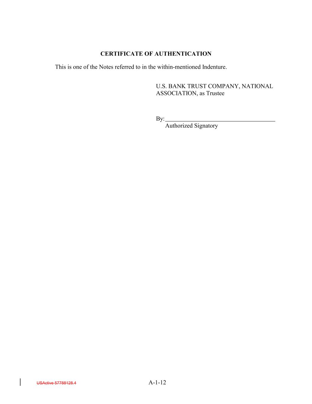 CERTIFICATE OF AUTHENTICATION This is one of the Notes referred to in the within-mentioned Indenture. U.S. BANK TRUST COMPANY, NATIONAL ASSOCIATION, as Trustee By: Authorized Signatory USActive 57788128.4 A-1-12