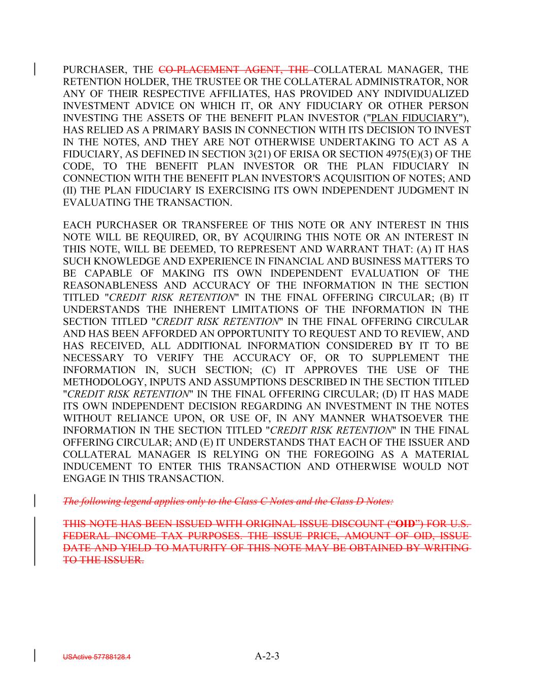 PURCHASER, THE CO-PLACEMENT AGENT, THE COLLATERAL MANAGER, THE RETENTION HOLDER, THE TRUSTEE OR THE COLLATERAL ADMINISTRATOR, NOR ANY OF THEIR RESPECTIVE AFFILIATES, HAS PROVIDED ANY INDIVIDUALIZED INVESTMENT ADVICE ON WHICH IT, OR ANY FIDUCIARY OR OTHER PERSON INVESTING THE ASSETS OF THE BENEFIT PLAN INVESTOR ("PLAN FIDUCIARY"), HAS RELIED AS A PRIMARY BASIS IN CONNECTION WITH ITS DECISION TO INVEST IN THE NOTES, AND THEY ARE NOT OTHERWISE UNDERTAKING TO ACT AS A FIDUCIARY, AS DEFINED IN SECTION 3(21) OF ERISA OR SECTION 4975(E)(3) OF THE CODE, TO THE BENEFIT PLAN INVESTOR OR THE PLAN FIDUCIARY IN CONNECTION WITH THE BENEFIT PLAN INVESTOR'S ACQUISITION OF NOTES; AND (II) THE PLAN FIDUCIARY IS EXERCISING ITS OWN INDEPENDENT JUDGMENT IN EVALUATING THE TRANSACTION. EACH PURCHASER OR TRANSFEREE OF THIS NOTE OR ANY INTEREST IN THIS NOTE WILL BE REQUIRED, OR, BY ACQUIRING THIS NOTE OR AN INTEREST IN THIS NOTE, WILL BE DEEMED, TO REPRESENT AND WARRANT THAT: (A) IT HAS SUCH KNOWLEDGE AND EXPERIENCE IN FINANCIAL AND BUSINESS MATTERS TO BE CAPABLE OF MAKING ITS OWN INDEPENDENT EVALUATION OF THE REASONABLENESS AND ACCURACY OF THE INFORMATION IN THE SECTION TITLED "CREDIT RISK RETENTION" IN THE FINAL OFFERING CIRCULAR; (B) IT UNDERSTANDS THE INHERENT LIMITATIONS OF THE INFORMATION IN THE SECTION TITLED "CREDIT RISK RETENTION" IN THE FINAL OFFERING CIRCULAR AND HAS BEEN AFFORDED AN OPPORTUNITY TO REQUEST AND TO REVIEW, AND HAS RECEIVED, ALL ADDITIONAL INFORMATION CONSIDERED BY IT TO BE NECESSARY TO VERIFY THE ACCURACY OF, OR TO SUPPLEMENT THE INFORMATION IN, SUCH SECTION; (C) IT APPROVES THE USE OF THE METHODOLOGY, INPUTS AND ASSUMPTIONS DESCRIBED IN THE SECTION TITLED "CREDIT RISK RETENTION" IN THE FINAL OFFERING CIRCULAR; (D) IT HAS MADE ITS OWN INDEPENDENT DECISION REGARDING AN INVESTMENT IN THE NOTES WITHOUT RELIANCE UPON, OR USE OF, IN ANY MANNER WHATSOEVER THE INFORMATION IN THE SECTION TITLED "CREDIT RISK RETENTION" IN THE FINAL OFFERING CIRCULAR; AND (E) IT UNDERSTANDS THAT EACH OF THE ISSUER AND COLLATERAL MANAGER IS RELYING ON THE FOREGOING AS A MATERIAL INDUCEMENT TO ENTER THIS TRANSACTION AND OTHERWISE WOULD NOT ENGAGE IN THIS TRANSACTION. The following legend applies only to the Class C Notes and the Class D Notes: THIS NOTE HAS BEEN ISSUED WITH ORIGINAL ISSUE DISCOUNT (“OID”) FOR U.S. FEDERAL INCOME TAX PURPOSES. THE ISSUE PRICE, AMOUNT OF OID, ISSUE DATE AND YIELD TO MATURITY OF THIS NOTE MAY BE OBTAINED BY WRITING TO THE ISSUER. USActive 57788128.4 A-2-3