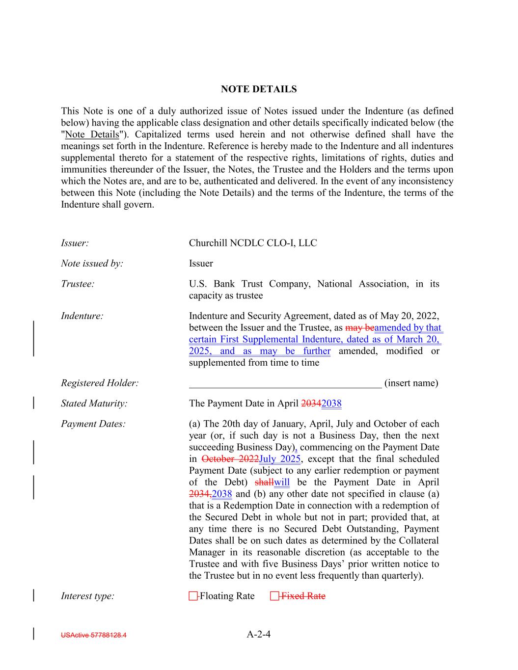 USActive 57788128.4 A-2-4 Indenture and Security Agreement, dated as of May 20, 2022, between the Issuer and the Trustee, as may beamended by that certain First Supplemental Indenture, dated as of March 20, 2025, and as may be further amended, modified or supplemented from time to time Note issued by: Registered Holder: ______________________________________ (insert name) Issuer Stated Maturity: The Payment Date in April 20342038 Issuer: Trustee: Payment Dates: (a) The 20th day of January, April, July and October of each year (or, if such day is not a Business Day, then the next succeeding Business Day), commencing on the Payment Date in October 2022July 2025, except that the final scheduled Payment Date (subject to any earlier redemption or payment of the Debt) shallwill be the Payment Date in April 2034,2038 and (b) any other date not specified in clause (a) that is a Redemption Date in connection with a redemption of the Secured Debt in whole but not in part; provided that, at any time there is no Secured Debt Outstanding, Payment Dates shall be on such dates as determined by the Collateral Manager in its reasonable discretion (as acceptable to the Trustee and with five Business Days’ prior written notice to the Trustee but in no event less frequently than quarterly). U.S. Bank Trust Company, National Association, in its capacity as trustee Churchill NCDLC CLO-I, LLC Interest type: Floating Rate Fixed Rate NOTE DETAILS This Note is one of a duly authorized issue of Notes issued under the Indenture (as defined below) having the applicable class designation and other details specifically indicated below (the "Note Details"). Capitalized terms used herein and not otherwise defined shall have the meanings set forth in the Indenture. Reference is hereby made to the Indenture and all indentures supplemental thereto for a statement of the respective rights, limitations of rights, duties and immunities thereunder of the Issuer, the Notes, the Trustee and the Holders and the terms upon which the Notes are, and are to be, authenticated and delivered. In the event of any inconsistency between this Note (including the Note Details) and the terms of the Indenture, the terms of the Indenture shall govern. Indenture: