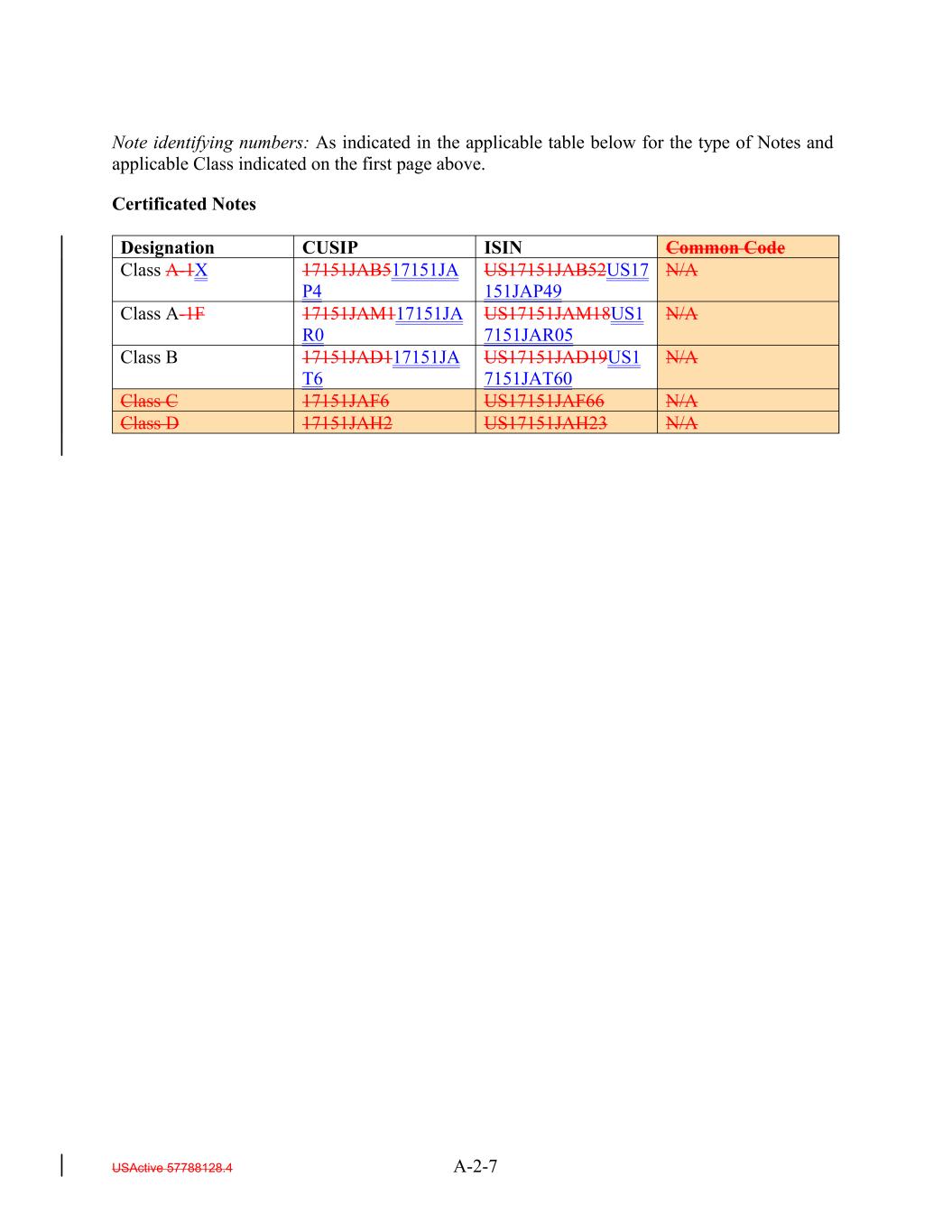 USActive 57788128.4 A-2-7 N/A Designation Class A-1X Class B 17151JAD117151JA T6 17151JAB517151JA P4 US17151JAD19US1 7151JAT60 CUSIP N/A US17151JAB52US17 151JAP49 Note identifying numbers: As indicated in the applicable table below for the type of Notes and applicable Class indicated on the first page above. Certificated Notes Class C N/A 17151JAF6 ISIN US17151JAF66 N/A Class A-1F Class D Common Code 17151JAH2 17151JAM117151JA R0 US17151JAH23 N/A US17151JAM18US1 7151JAR05