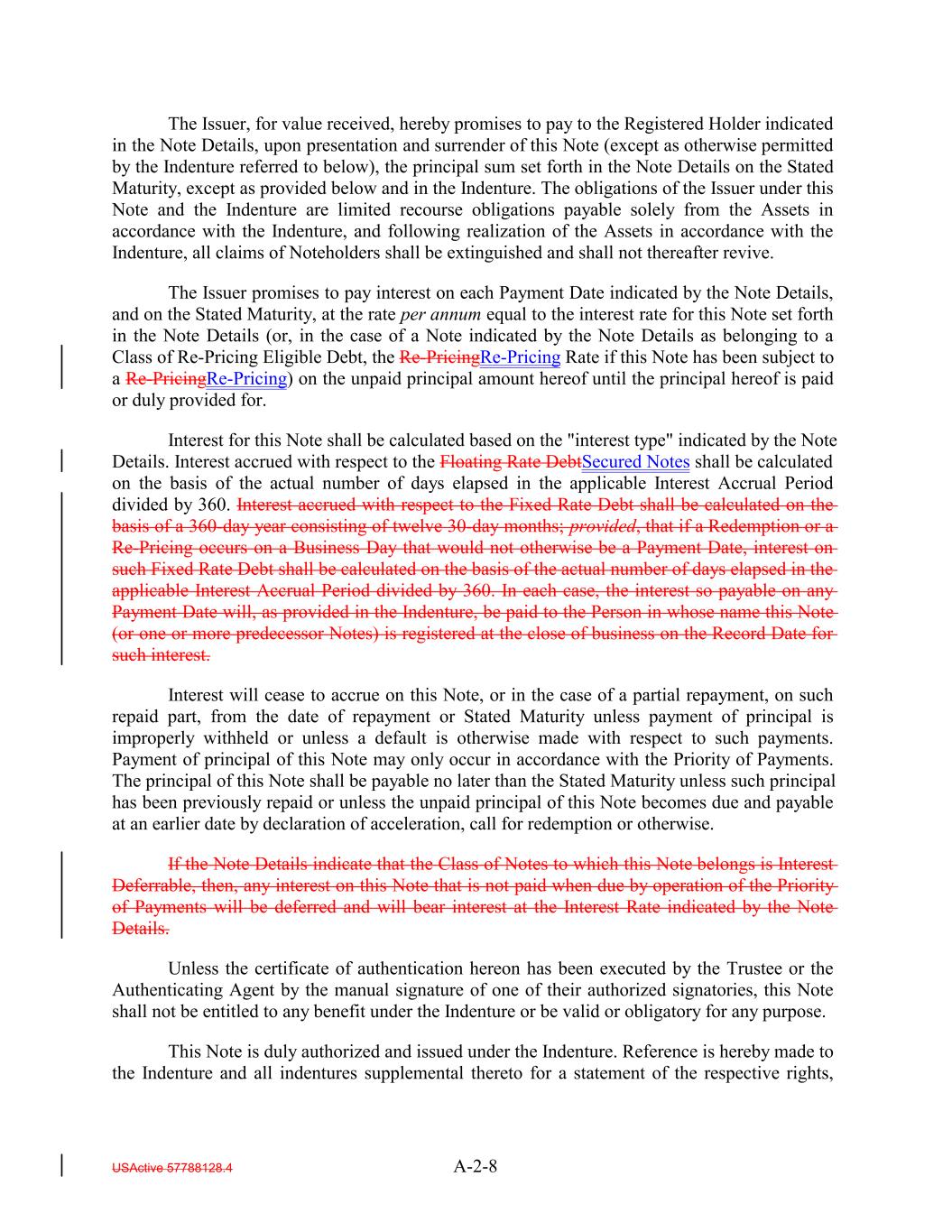 The Issuer, for value received, hereby promises to pay to the Registered Holder indicated in the Note Details, upon presentation and surrender of this Note (except as otherwise permitted by the Indenture referred to below), the principal sum set forth in the Note Details on the Stated Maturity, except as provided below and in the Indenture. The obligations of the Issuer under this Note and the Indenture are limited recourse obligations payable solely from the Assets in accordance with the Indenture, and following realization of the Assets in accordance with the Indenture, all claims of Noteholders shall be extinguished and shall not thereafter revive. The Issuer promises to pay interest on each Payment Date indicated by the Note Details, and on the Stated Maturity, at the rate per annum equal to the interest rate for this Note set forth in the Note Details (or, in the case of a Note indicated by the Note Details as belonging to a Class of Re-Pricing Eligible Debt, the Re-PricingRe-Pricing Rate if this Note has been subject to a Re-PricingRe-Pricing) on the unpaid principal amount hereof until the principal hereof is paid or duly provided for. Interest for this Note shall be calculated based on the "interest type" indicated by the Note Details. Interest accrued with respect to the Floating Rate DebtSecured Notes shall be calculated on the basis of the actual number of days elapsed in the applicable Interest Accrual Period divided by 360. Interest accrued with respect to the Fixed Rate Debt shall be calculated on the basis of a 360-day year consisting of twelve 30-day months; provided, that if a Redemption or a Re-Pricing occurs on a Business Day that would not otherwise be a Payment Date, interest on such Fixed Rate Debt shall be calculated on the basis of the actual number of days elapsed in the applicable Interest Accrual Period divided by 360. In each case, the interest so payable on any Payment Date will, as provided in the Indenture, be paid to the Person in whose name this Note (or one or more predecessor Notes) is registered at the close of business on the Record Date for such interest. Interest will cease to accrue on this Note, or in the case of a partial repayment, on such repaid part, from the date of repayment or Stated Maturity unless payment of principal is improperly withheld or unless a default is otherwise made with respect to such payments. Payment of principal of this Note may only occur in accordance with the Priority of Payments. The principal of this Note shall be payable no later than the Stated Maturity unless such principal has been previously repaid or unless the unpaid principal of this Note becomes due and payable at an earlier date by declaration of acceleration, call for redemption or otherwise. If the Note Details indicate that the Class of Notes to which this Note belongs is Interest Deferrable, then, any interest on this Note that is not paid when due by operation of the Priority of Payments will be deferred and will bear interest at the Interest Rate indicated by the Note Details. Unless the certificate of authentication hereon has been executed by the Trustee or the Authenticating Agent by the manual signature of one of their authorized signatories, this Note shall not be entitled to any benefit under the Indenture or be valid or obligatory for any purpose. This Note is duly authorized and issued under the Indenture. Reference is hereby made to the Indenture and all indentures supplemental thereto for a statement of the respective rights, USActive 57788128.4 A-2-8
