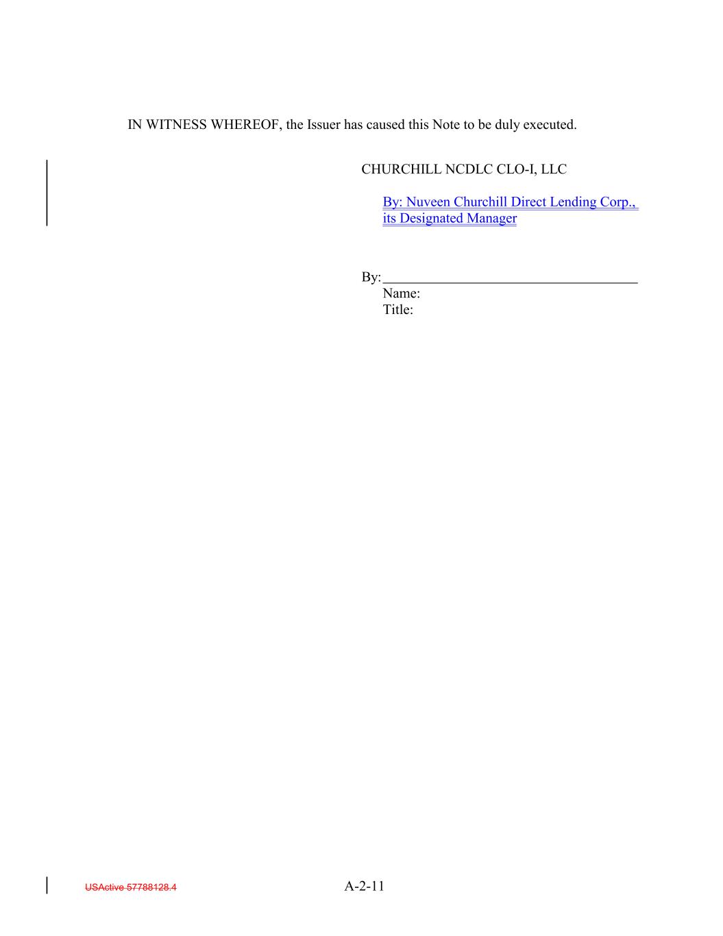 IN WITNESS WHEREOF, the Issuer has caused this Note to be duly executed. CHURCHILL NCDLC CLO-I, LLC By: Nuveen Churchill Direct Lending Corp., its Designated Manager By: Name: Title: USActive 57788128.4 A-2-11