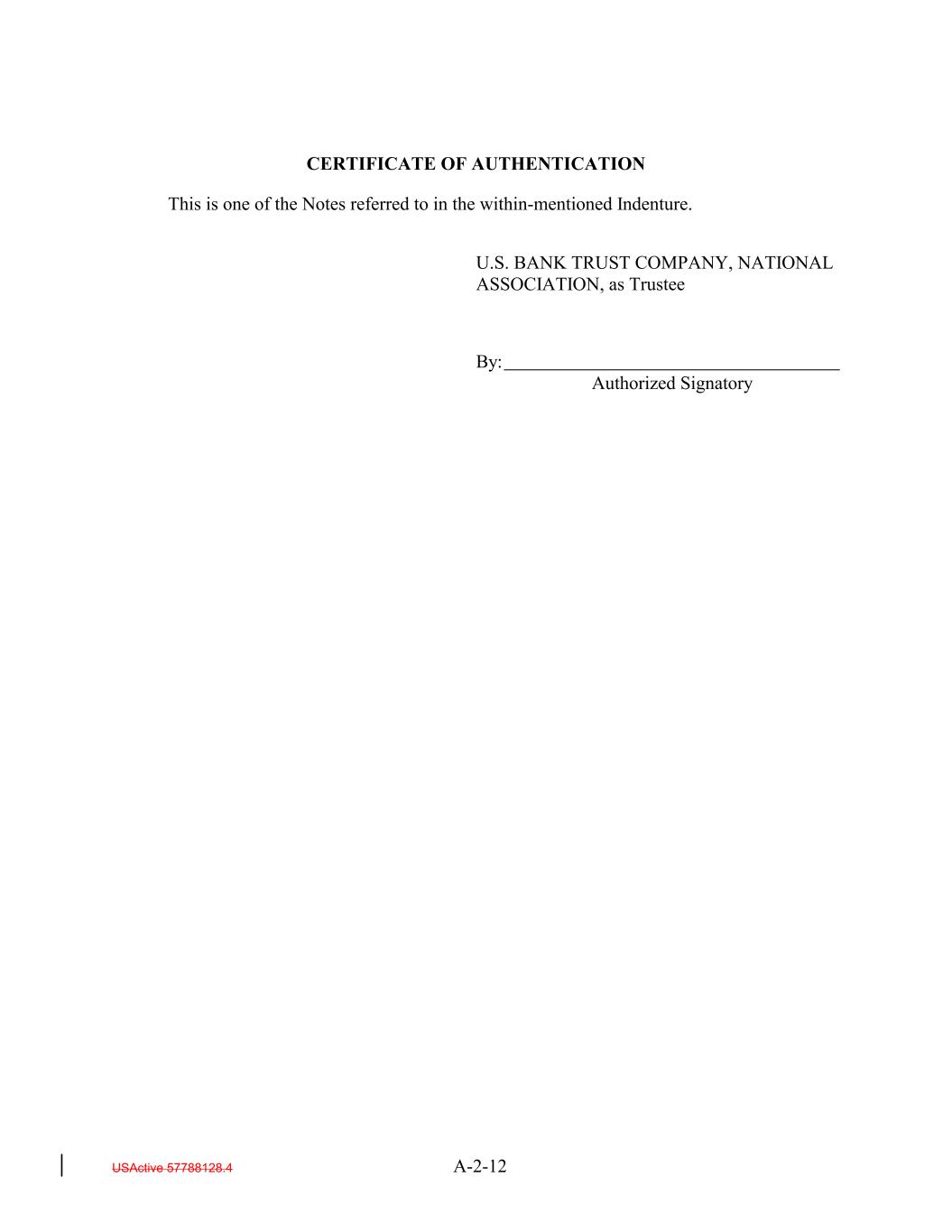 CERTIFICATE OF AUTHENTICATION This is one of the Notes referred to in the within-mentioned Indenture. U.S. BANK TRUST COMPANY, NATIONAL ASSOCIATION, as Trustee By: Authorized Signatory USActive 57788128.4 A-2-12