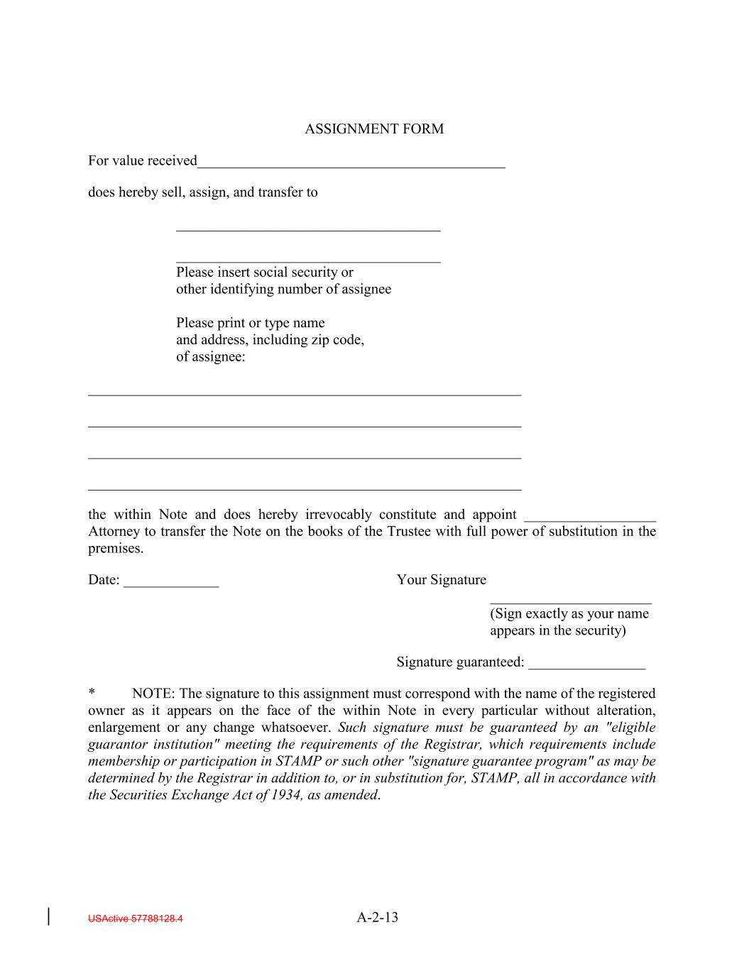 ASSIGNMENT FORM For value received__________________________________________ does hereby sell, assign, and transfer to ____________________________________ ____________________________________ Please insert social security or other identifying number of assignee Please print or type name and address, including zip code, of assignee: ___________________________________________________________ ___________________________________________________________ ___________________________________________________________ ___________________________________________________________ the within Note and does hereby irrevocably constitute and appoint __________________ Attorney to transfer the Note on the books of the Trustee with full power of substitution in the premises. Date: _____________ Your Signature ______________________ (Sign exactly as your name appears in the security) Signature guaranteed: ________________ * NOTE: The signature to this assignment must correspond with the name of the registered owner as it appears on the face of the within Note in every particular without alteration, enlargement or any change whatsoever. Such signature must be guaranteed by an "eligible guarantor institution" meeting the requirements of the Registrar, which requirements include membership or participation in STAMP or such other "signature guarantee program" as may be determined by the Registrar in addition to, or in substitution for, STAMP, all in accordance with the Securities Exchange Act of 1934, as amended. USActive 57788128.4 A-2-13