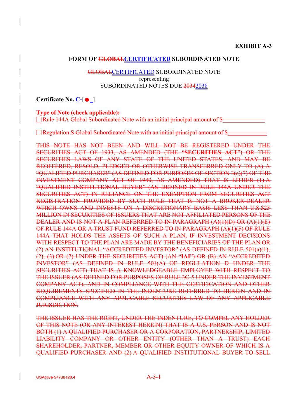 EXHIBIT A-3 FORM OF GLOBALCERTIFICATED SUBORDINATED NOTE GLOBALCERTIFICATED SUBORDINATED NOTE representing SUBORDINATED NOTES DUE 20342038 Certificate No. C-[_] Type of Note (check applicable): Rule 144A Global Subordinated Note with an initial principal amount of $______________ Regulation S Global Subordinated Note with an initial principal amount of $_____________ THIS NOTE HAS NOT BEEN AND WILL NOT BE REGISTERED UNDER THE SECURITIES ACT OF 1933, AS AMENDED (THE “SECURITIES ACT”) OR THE SECURITIES LAWS OF ANY STATE OF THE UNITED STATES, AND MAY BE REOFFERED, RESOLD, PLEDGED OR OTHERWISE TRANSFERRED ONLY TO (A) A “QUALIFIED PURCHASER” (AS DEFINED FOR PURPOSES OF SECTION 3(c)(7) OF THE INVESTMENT COMPANY ACT OF 1940, AS AMENDED) THAT IS EITHER (1) A “QUALIFIED INSTITUTIONAL BUYER” (AS DEFINED IN RULE 144A UNDER THE SECURITIES ACT) IN RELIANCE ON THE EXEMPTION FROM SECURITIES ACT REGISTRATION PROVIDED BY SUCH RULE THAT IS NOT A BROKER-DEALER WHICH OWNS AND INVESTS ON A DISCRETIONARY BASIS LESS THAN U.S.$25 MILLION IN SECURITIES OF ISSUERS THAT ARE NOT AFFILIATED PERSONS OF THE DEALER AND IS NOT A PLAN REFERRED TO IN PARAGRAPH (A)(1)(D) OR (A)(1)(E) OF RULE 144A OR A TRUST FUND REFERRED TO IN PARAGRAPH (A)(1)(F) OF RULE 144A THAT HOLDS THE ASSETS OF SUCH A PLAN, IF INVESTMENT DECISIONS WITH RESPECT TO THE PLAN ARE MADE BY THE BENEFICIARIES OF THE PLAN OR (2) AN INSTITUTIONAL “ACCREDITED INVESTOR” (AS DEFINED IN RULE 501(a)(1), (2), (3) OR (7) UNDER THE SECURITIES ACT) (AN “IAI”) OR (B) AN “ACCREDITED INVESTOR” (AS DEFINED IN RULE 501(A) OF REGULATION D UNDER THE SECURITIES ACT) THAT IS A KNOWLEDGEABLE EMPLOYEE WITH RESPECT TO THE ISSUER (AS DEFINED FOR PURPOSES OF RULE 3C-5 UNDER THE INVESTMENT COMPANY ACT), AND IN COMPLIANCE WITH THE CERTIFICATION AND OTHER REQUIREMENTS SPECIFIED IN THE INDENTURE REFERRED TO HEREIN AND IN COMPLIANCE WITH ANY APPLICABLE SECURITIES LAW OF ANY APPLICABLE JURISDICTION. THE ISSUER HAS THE RIGHT, UNDER THE INDENTURE, TO COMPEL ANY HOLDER OF THIS NOTE (OR ANY INTEREST HEREIN) THAT IS A U.S. PERSON AND IS NOT BOTH (1) A QUALIFIED PURCHASER OR A CORPORATION, PARTNERSHIP, LIMITED LIABILITY COMPANY OR OTHER ENTITY (OTHER THAN A TRUST) EACH SHAREHOLDER, PARTNER, MEMBER OR OTHER EQUITY OWNER OF WHICH IS A QUALIFIED PURCHASER AND (2) A QUALIFIED INSTITUTIONAL BUYER TO SELL USActive 57788128.4 A-3-1