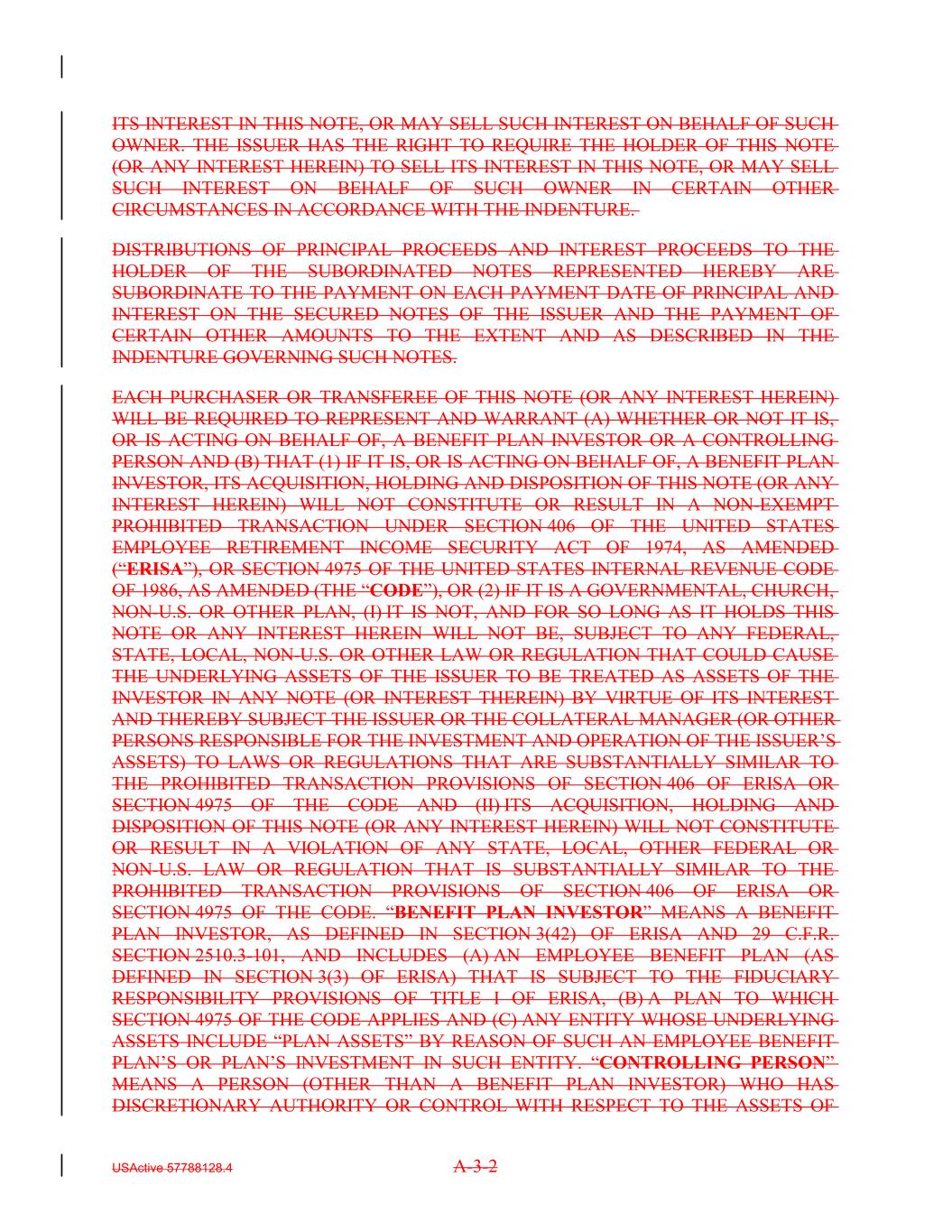 ITS INTEREST IN THIS NOTE, OR MAY SELL SUCH INTEREST ON BEHALF OF SUCH OWNER. THE ISSUER HAS THE RIGHT TO REQUIRE THE HOLDER OF THIS NOTE (OR ANY INTEREST HEREIN) TO SELL ITS INTEREST IN THIS NOTE, OR MAY SELL SUCH INTEREST ON BEHALF OF SUCH OWNER IN CERTAIN OTHER CIRCUMSTANCES IN ACCORDANCE WITH THE INDENTURE. DISTRIBUTIONS OF PRINCIPAL PROCEEDS AND INTEREST PROCEEDS TO THE HOLDER OF THE SUBORDINATED NOTES REPRESENTED HEREBY ARE SUBORDINATE TO THE PAYMENT ON EACH PAYMENT DATE OF PRINCIPAL AND INTEREST ON THE SECURED NOTES OF THE ISSUER AND THE PAYMENT OF CERTAIN OTHER AMOUNTS TO THE EXTENT AND AS DESCRIBED IN THE INDENTURE GOVERNING SUCH NOTES. EACH PURCHASER OR TRANSFEREE OF THIS NOTE (OR ANY INTEREST HEREIN) WILL BE REQUIRED TO REPRESENT AND WARRANT (A) WHETHER OR NOT IT IS, OR IS ACTING ON BEHALF OF, A BENEFIT PLAN INVESTOR OR A CONTROLLING PERSON AND (B) THAT (1) IF IT IS, OR IS ACTING ON BEHALF OF, A BENEFIT PLAN INVESTOR, ITS ACQUISITION, HOLDING AND DISPOSITION OF THIS NOTE (OR ANY INTEREST HEREIN) WILL NOT CONSTITUTE OR RESULT IN A NON-EXEMPT PROHIBITED TRANSACTION UNDER SECTION 406 OF THE UNITED STATES EMPLOYEE RETIREMENT INCOME SECURITY ACT OF 1974, AS AMENDED (“ERISA”), OR SECTION 4975 OF THE UNITED STATES INTERNAL REVENUE CODE OF 1986, AS AMENDED (THE “CODE”), OR (2) IF IT IS A GOVERNMENTAL, CHURCH, NON-U.S. OR OTHER PLAN, (I) IT IS NOT, AND FOR SO LONG AS IT HOLDS THIS NOTE OR ANY INTEREST HEREIN WILL NOT BE, SUBJECT TO ANY FEDERAL, STATE, LOCAL, NON-U.S. OR OTHER LAW OR REGULATION THAT COULD CAUSE THE UNDERLYING ASSETS OF THE ISSUER TO BE TREATED AS ASSETS OF THE INVESTOR IN ANY NOTE (OR INTEREST THEREIN) BY VIRTUE OF ITS INTEREST AND THEREBY SUBJECT THE ISSUER OR THE COLLATERAL MANAGER (OR OTHER PERSONS RESPONSIBLE FOR THE INVESTMENT AND OPERATION OF THE ISSUER’S ASSETS) TO LAWS OR REGULATIONS THAT ARE SUBSTANTIALLY SIMILAR TO THE PROHIBITED TRANSACTION PROVISIONS OF SECTION 406 OF ERISA OR SECTION 4975 OF THE CODE AND (II) ITS ACQUISITION, HOLDING AND DISPOSITION OF THIS NOTE (OR ANY INTEREST HEREIN) WILL NOT CONSTITUTE OR RESULT IN A VIOLATION OF ANY STATE, LOCAL, OTHER FEDERAL OR NON-U.S. LAW OR REGULATION THAT IS SUBSTANTIALLY SIMILAR TO THE PROHIBITED TRANSACTION PROVISIONS OF SECTION 406 OF ERISA OR SECTION 4975 OF THE CODE. “BENEFIT PLAN INVESTOR” MEANS A BENEFIT PLAN INVESTOR, AS DEFINED IN SECTION 3(42) OF ERISA AND 29 C.F.R. SECTION 2510.3-101, AND INCLUDES (A) AN EMPLOYEE BENEFIT PLAN (AS DEFINED IN SECTION 3(3) OF ERISA) THAT IS SUBJECT TO THE FIDUCIARY RESPONSIBILITY PROVISIONS OF TITLE I OF ERISA, (B) A PLAN TO WHICH SECTION 4975 OF THE CODE APPLIES AND (C) ANY ENTITY WHOSE UNDERLYING ASSETS INCLUDE “PLAN ASSETS” BY REASON OF SUCH AN EMPLOYEE BENEFIT PLAN’S OR PLAN’S INVESTMENT IN SUCH ENTITY. “CONTROLLING PERSON” MEANS A PERSON (OTHER THAN A BENEFIT PLAN INVESTOR) WHO HAS DISCRETIONARY AUTHORITY OR CONTROL WITH RESPECT TO THE ASSETS OF USActive 57788128.4 A-3-2